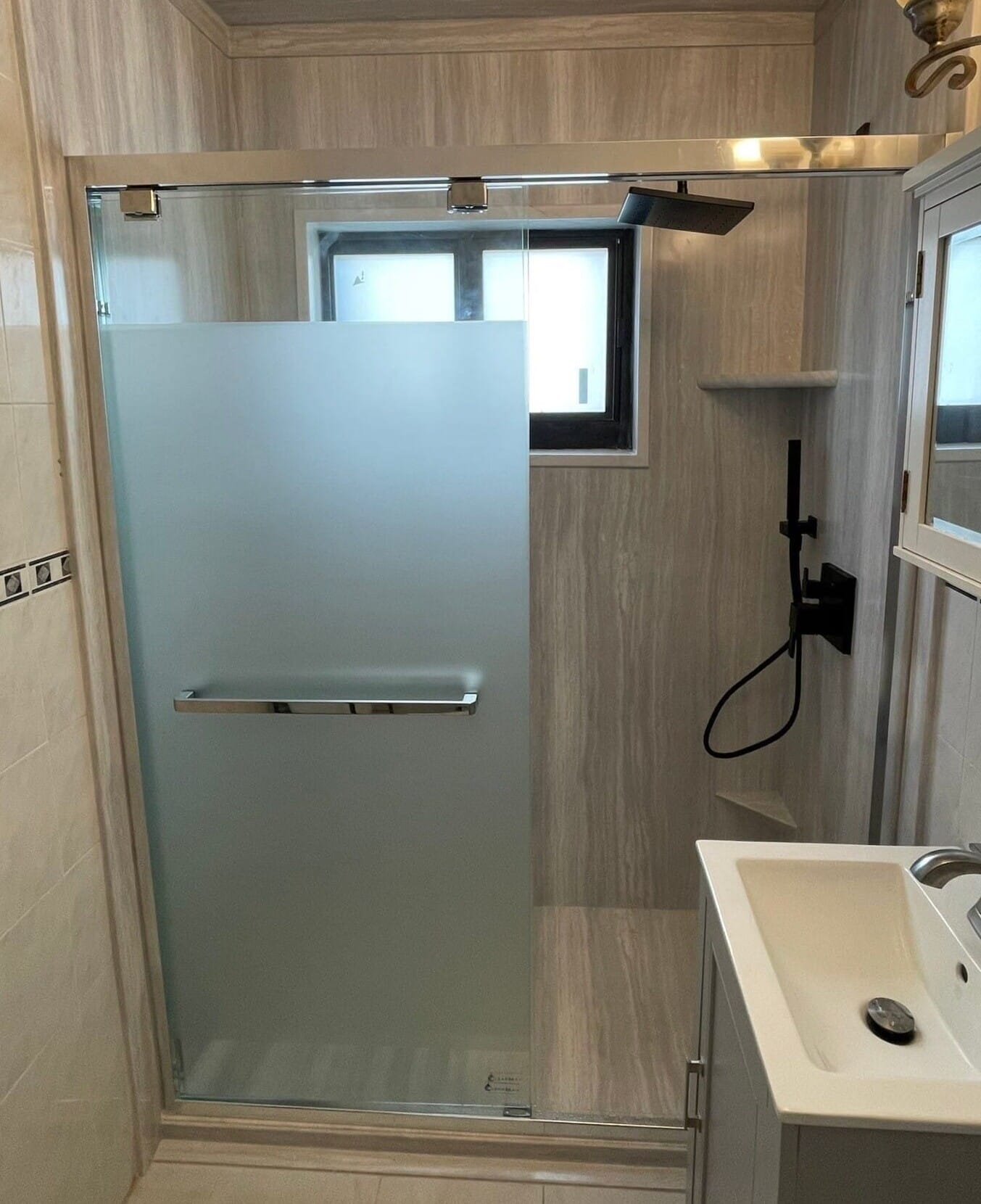 * Frosted-glass sliding door system with chrome trim