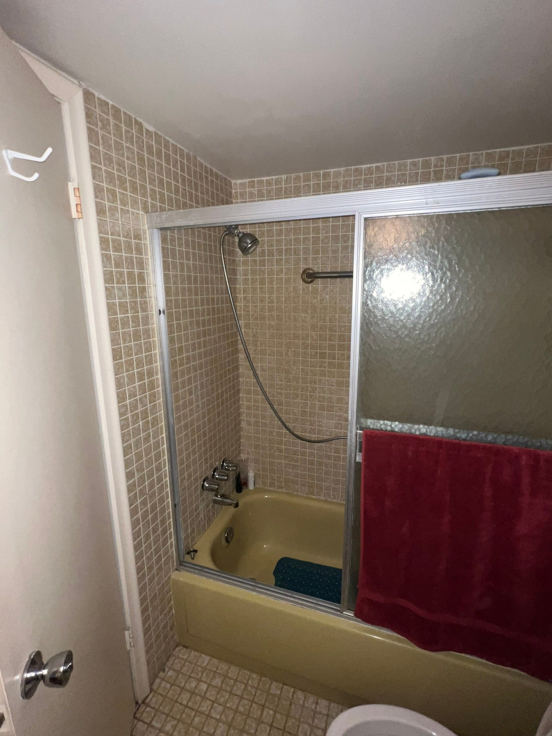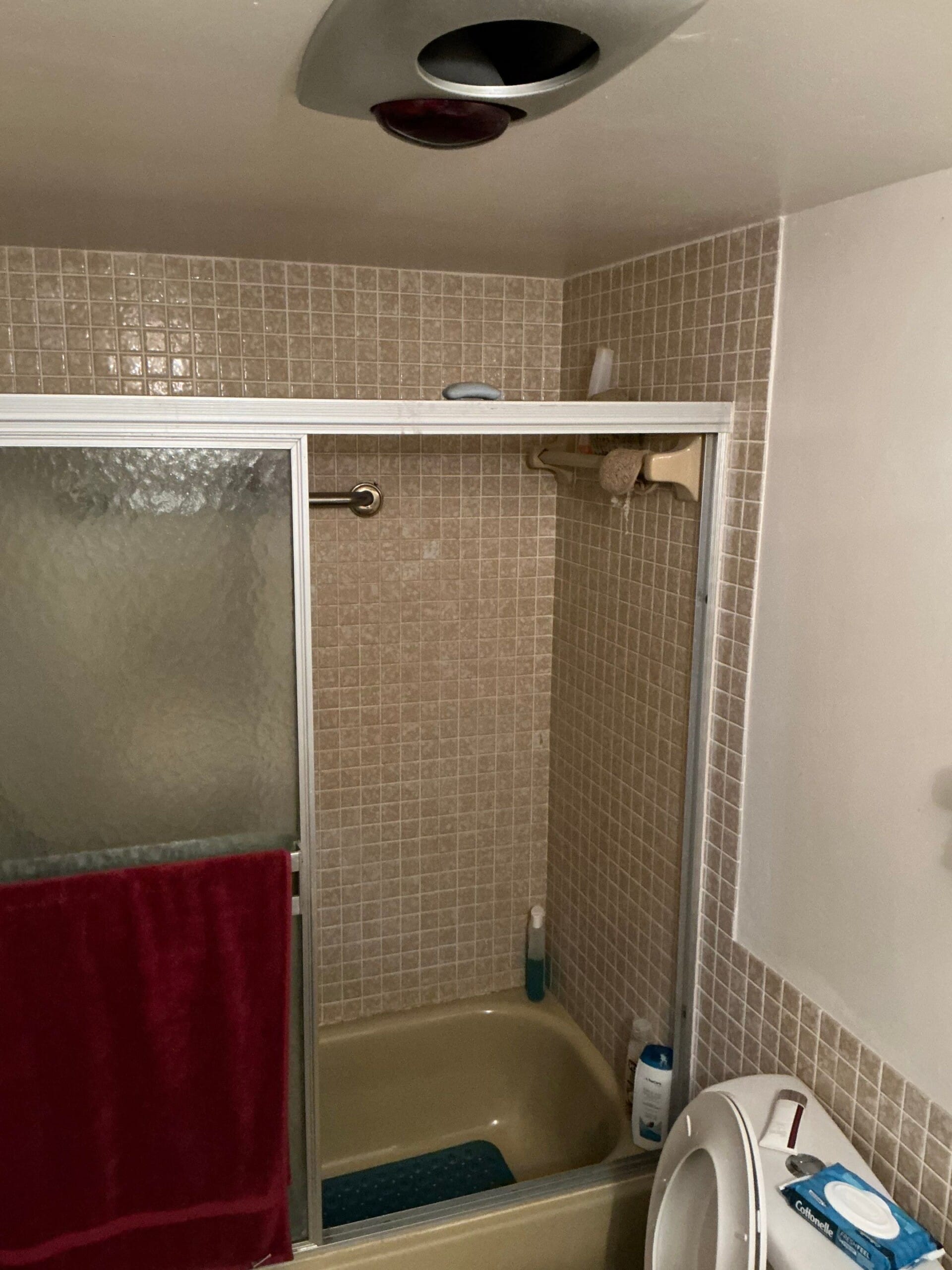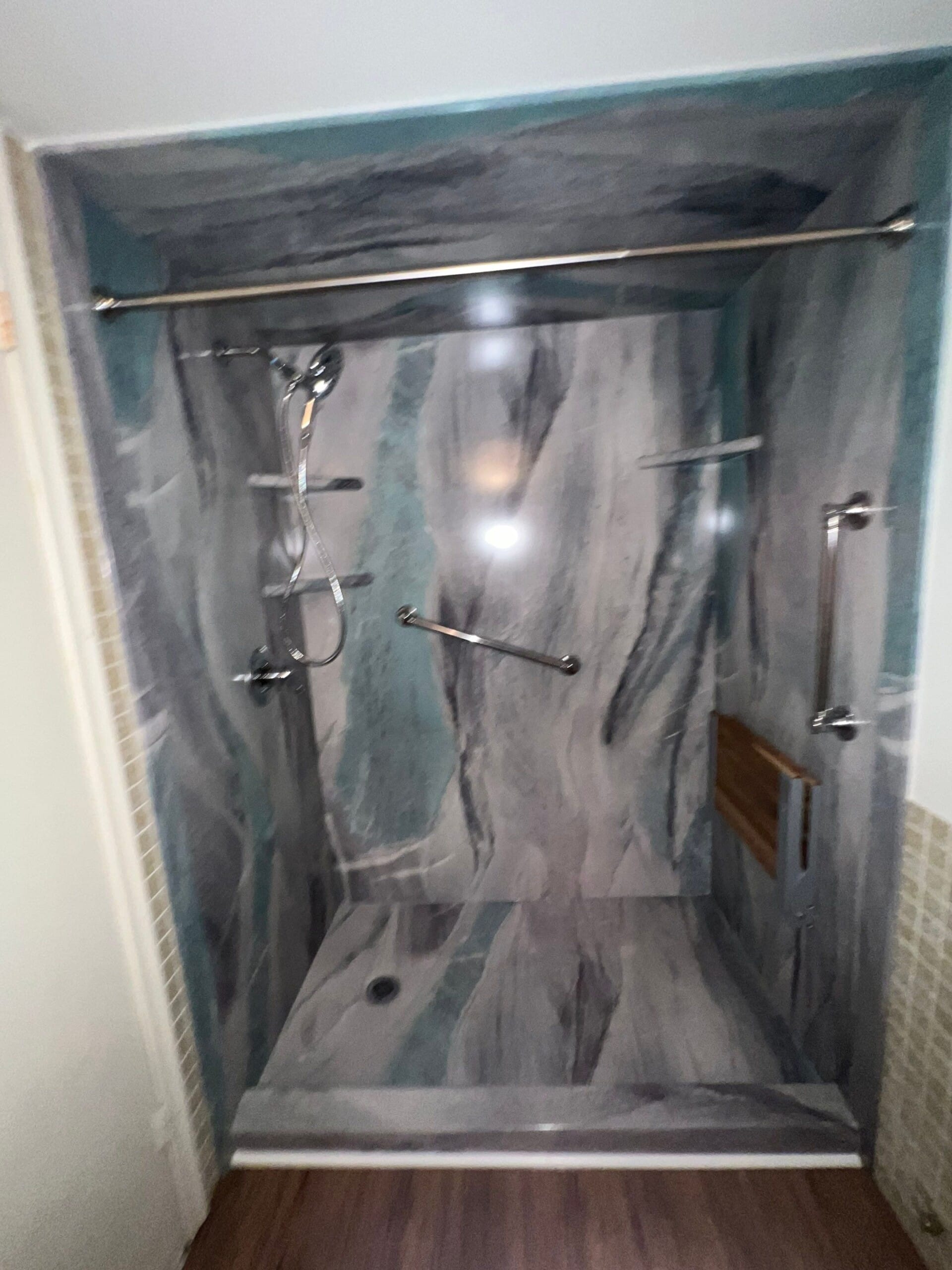The original tub, tile walls, and glass doors were removed, and the area was converted into a barrier-free walk-in shower. A wide composite base and fully integrated panel system were installed, along with a mounted Delta handheld shower wand and ergonomic accessories. The walls were wrapped in the selected stone-grain composite with a built-in support rail and corner shelving. A new waterproof vinyl plank floor replaced the existing tile, adding warmth and continuity to the remodeled space.