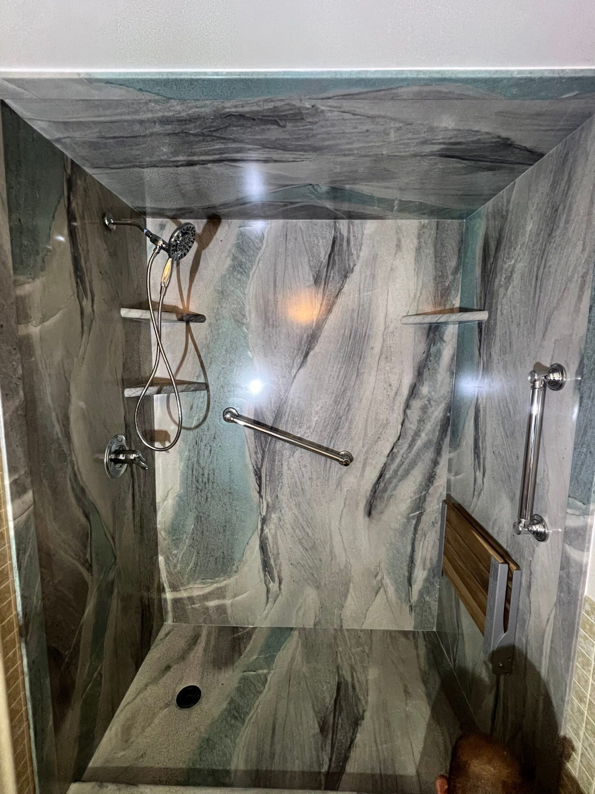 Darren Hawker, the Five Star Bath Solutions representative, recommended a custom acrylic and PVC composite system in a natural stone pattern. This selection offered a grout-free finish and full ceiling-height panels for mold resistance and simplified maintenance. Brushed nickel fixtures, two corner shelves, and multiple grab bars were included to meet mobility support goals. The package also featured a fold-down teak seat to provide comfortable seated bathing without compromising space.