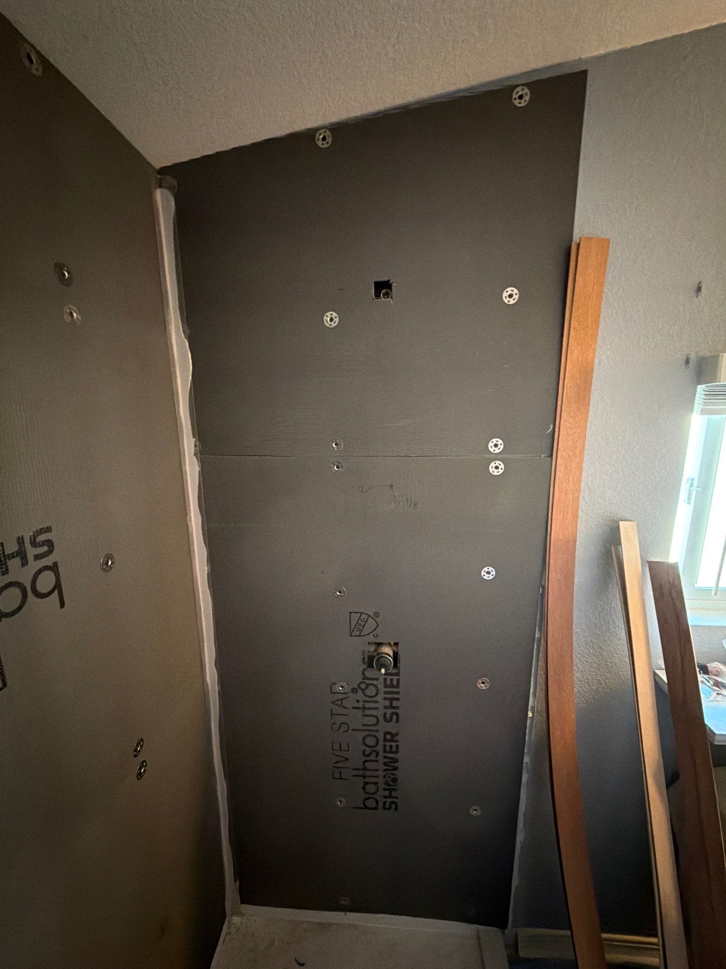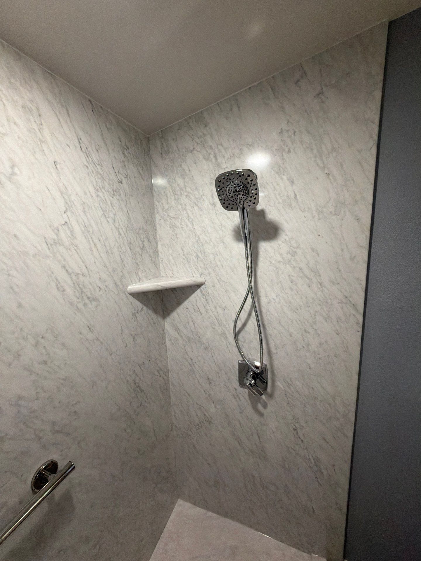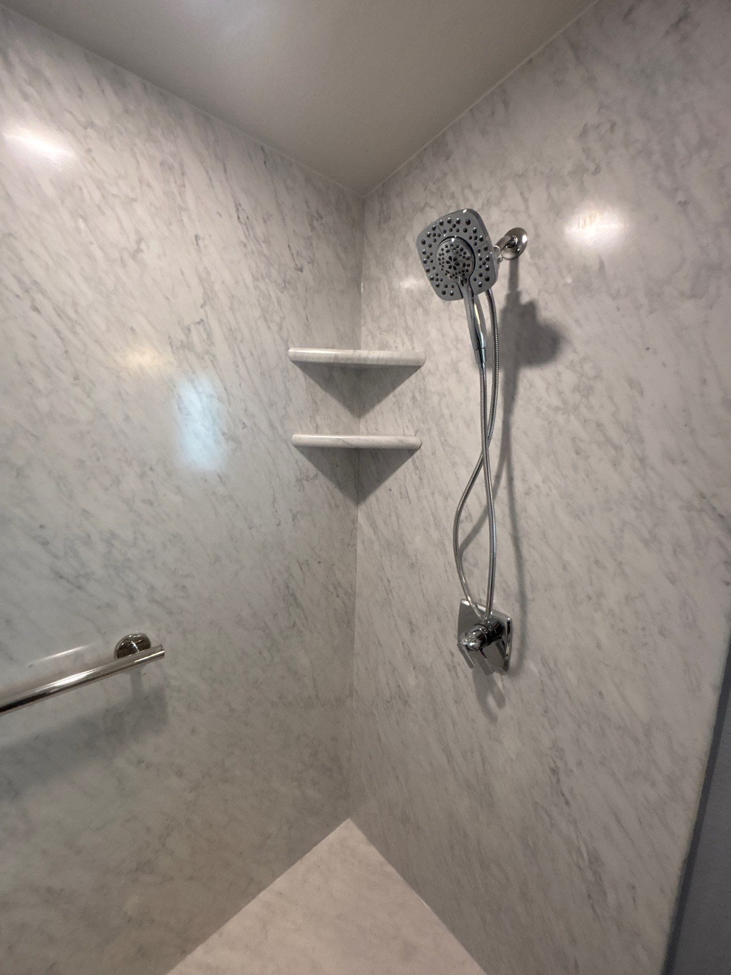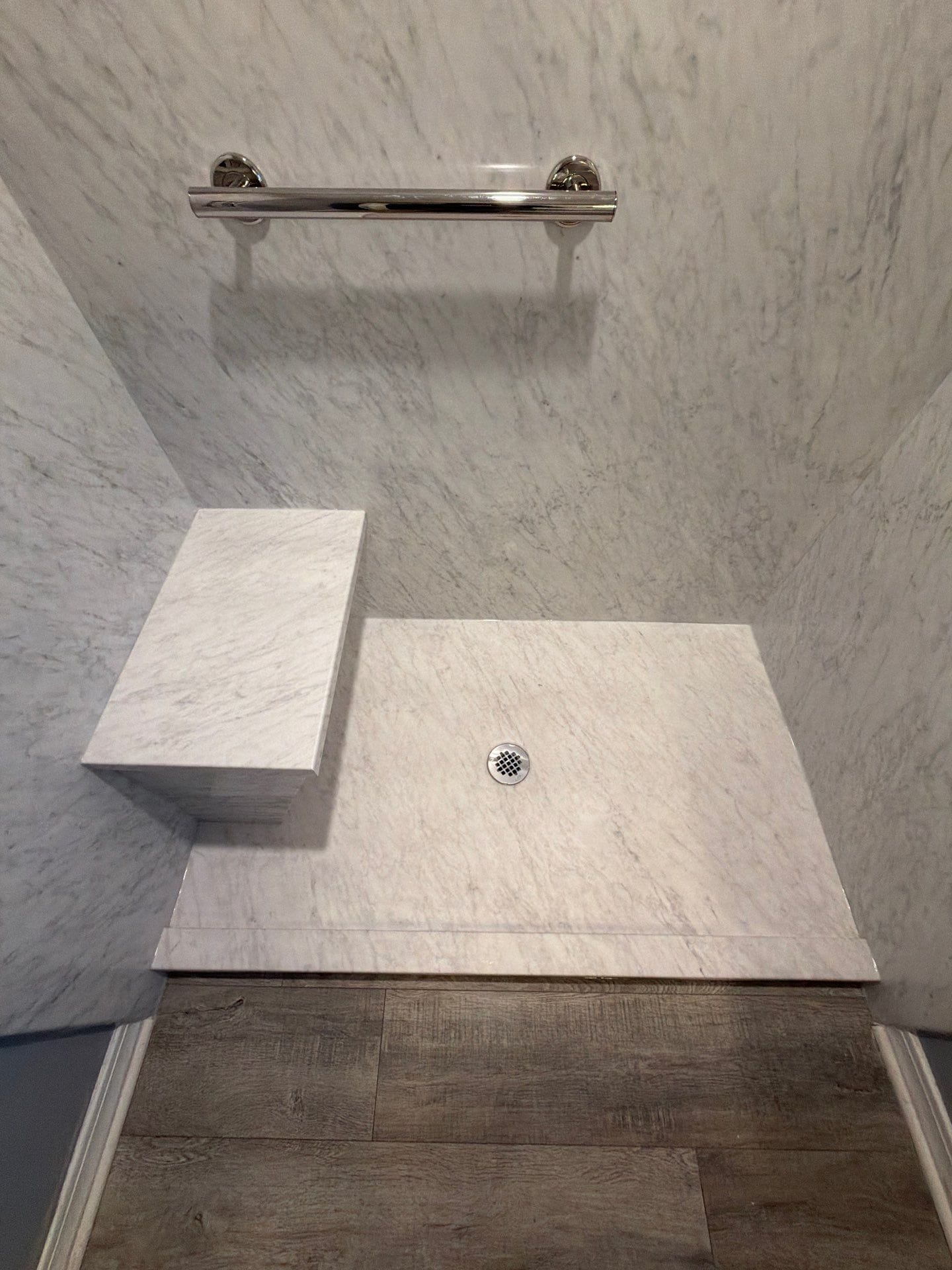 Installation begins with protecting the home using floor runners and sealing the workspace with heavy plastic and HEPA filtration to manage dust. The team removes the old unit down to the studs to inspect for any hidden damage before installing a waterproof closed-cell shower shield with specialized corner protection. A one-piece, non-slip shower base is fitted to slope toward the drain, and all internal plumbing lines are replaced during the process. For this project, a roll-in shower was constructed featuring Everest patterned wall panels, a built-in bench, multiple grab bars, and a square storage niche positioned for easy access.