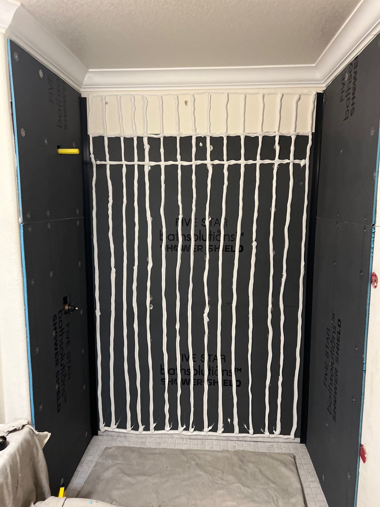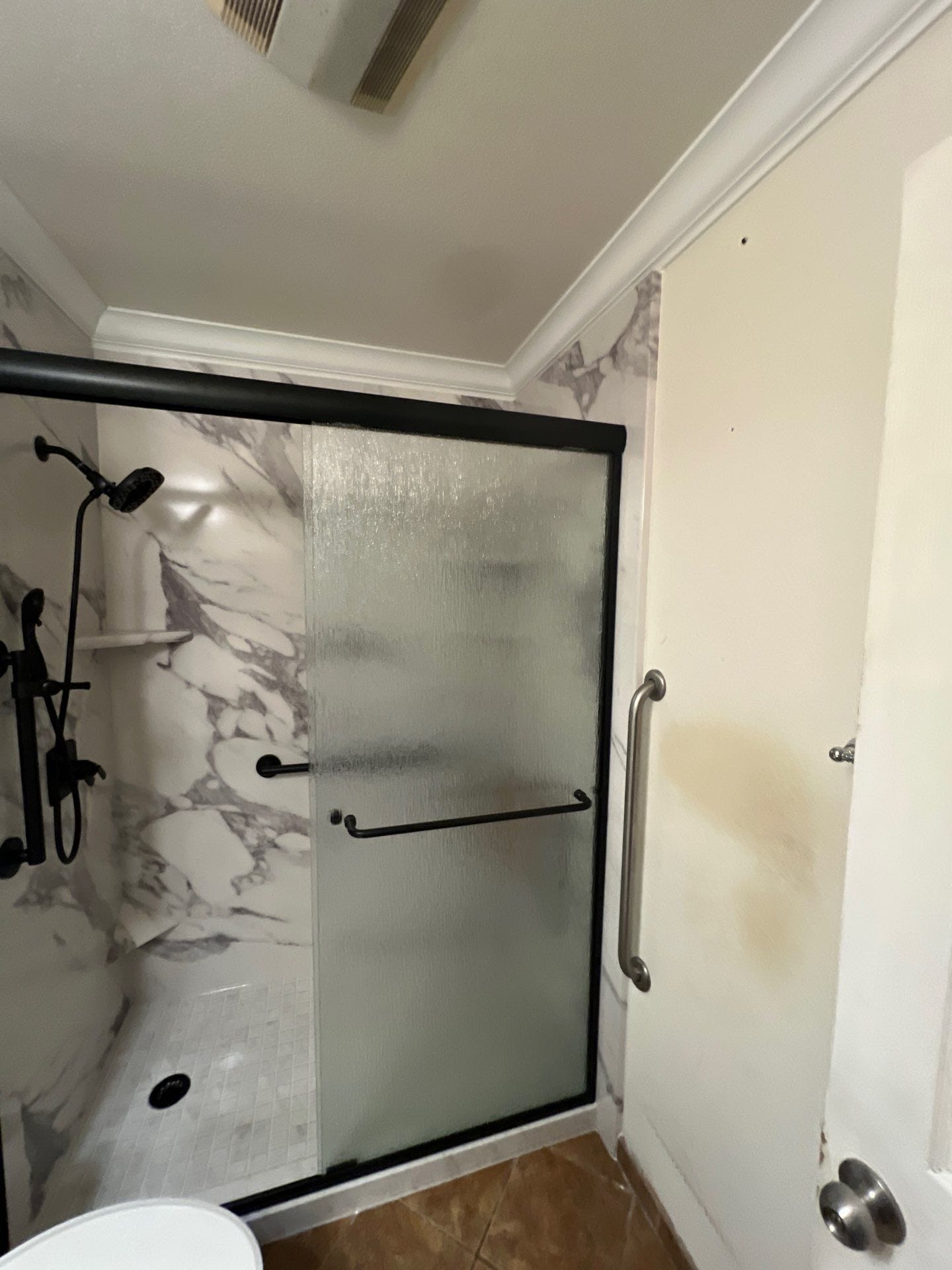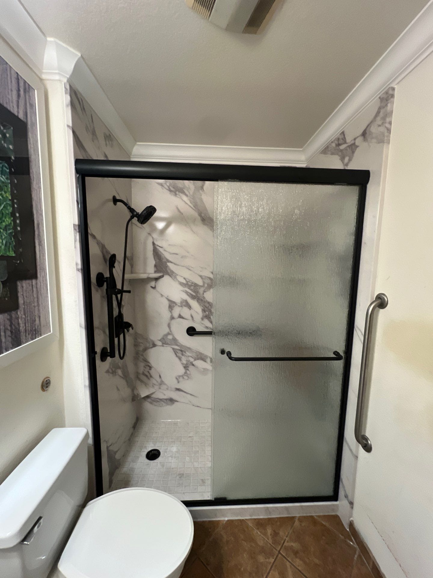 The remodel involved a full demo down to the studs, moisture mitigation, new structural bracing, upgraded plumbing, and the installation of a slip-resistant solid-core base. A modern marble-style wall panel finish was selected, featuring bold veining consistent across all panels. Two floating corner shelves were mounted inside, and a fold-down teak bench was anchored securely to the back wall. Matte black fixtures and accessories were chosen, including a framed sliding glass door with integrated towel bar. Kevin used a 3D design platform to confirm layout, materials, and fixture finishes, which helped the customer visualize spacing and proportions with confidence.