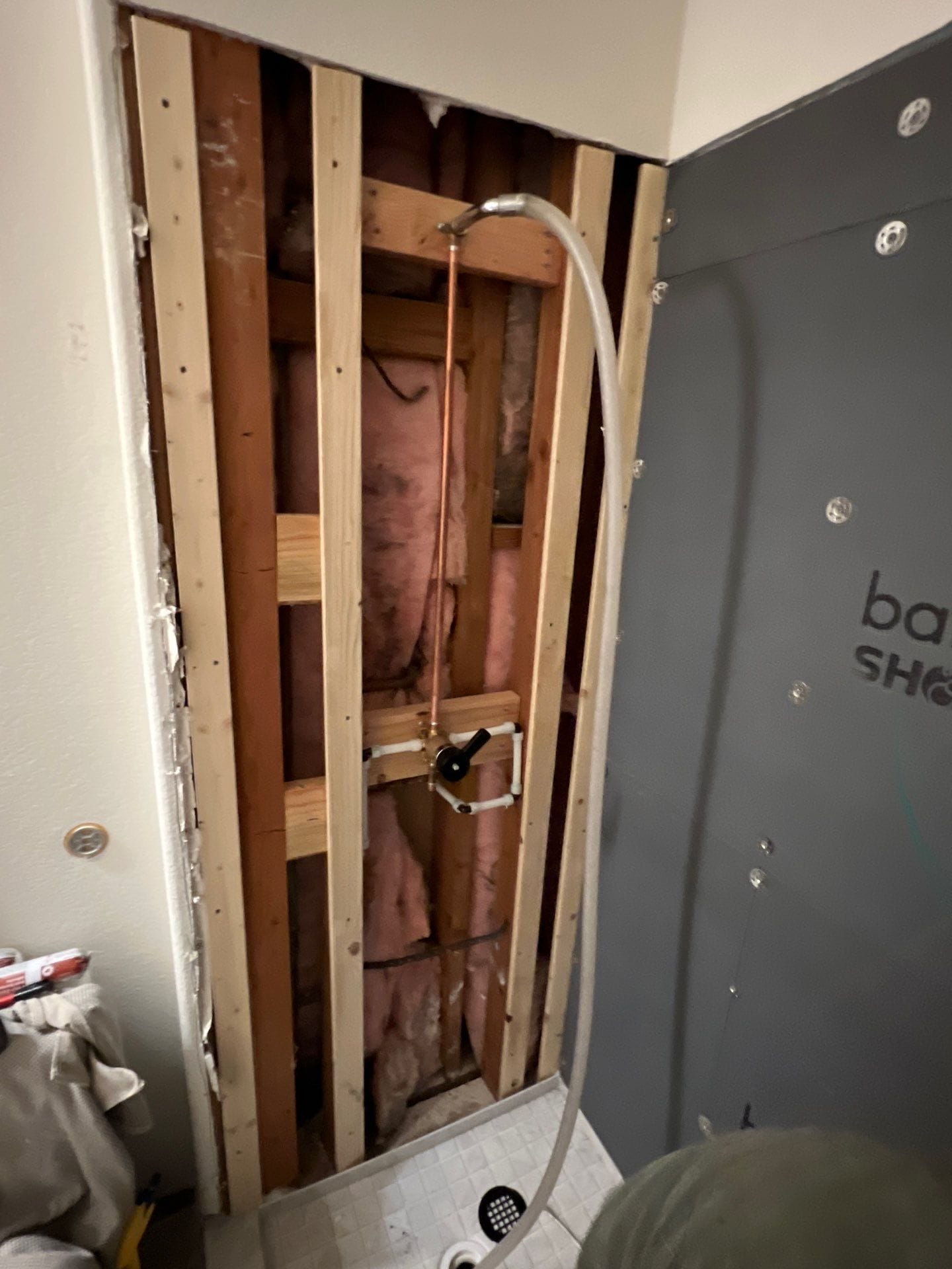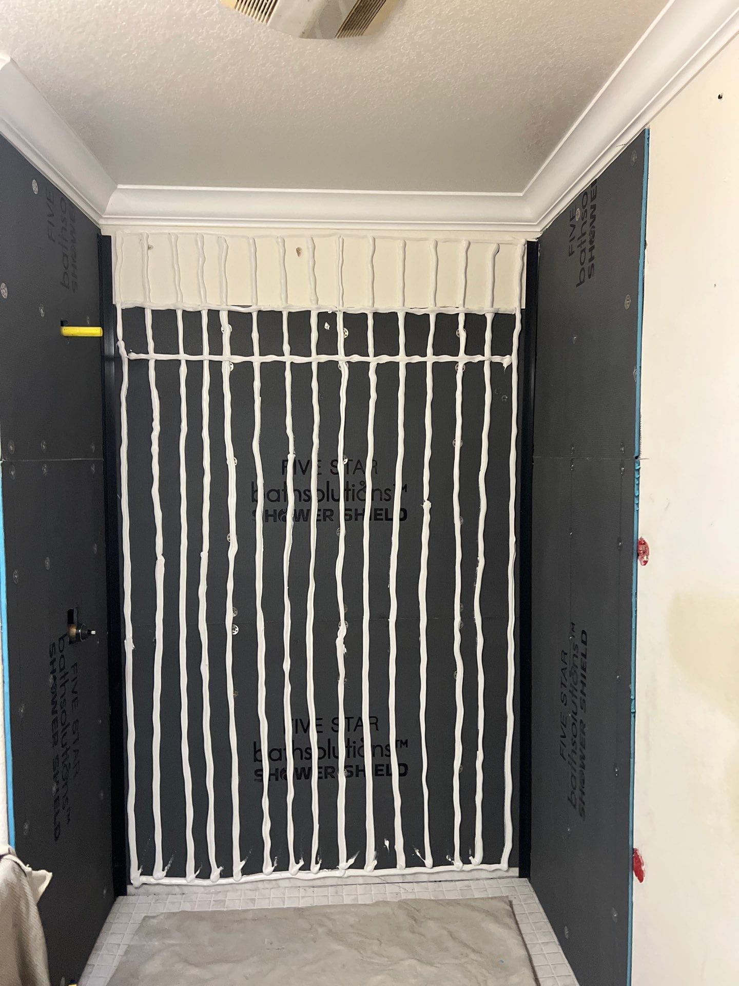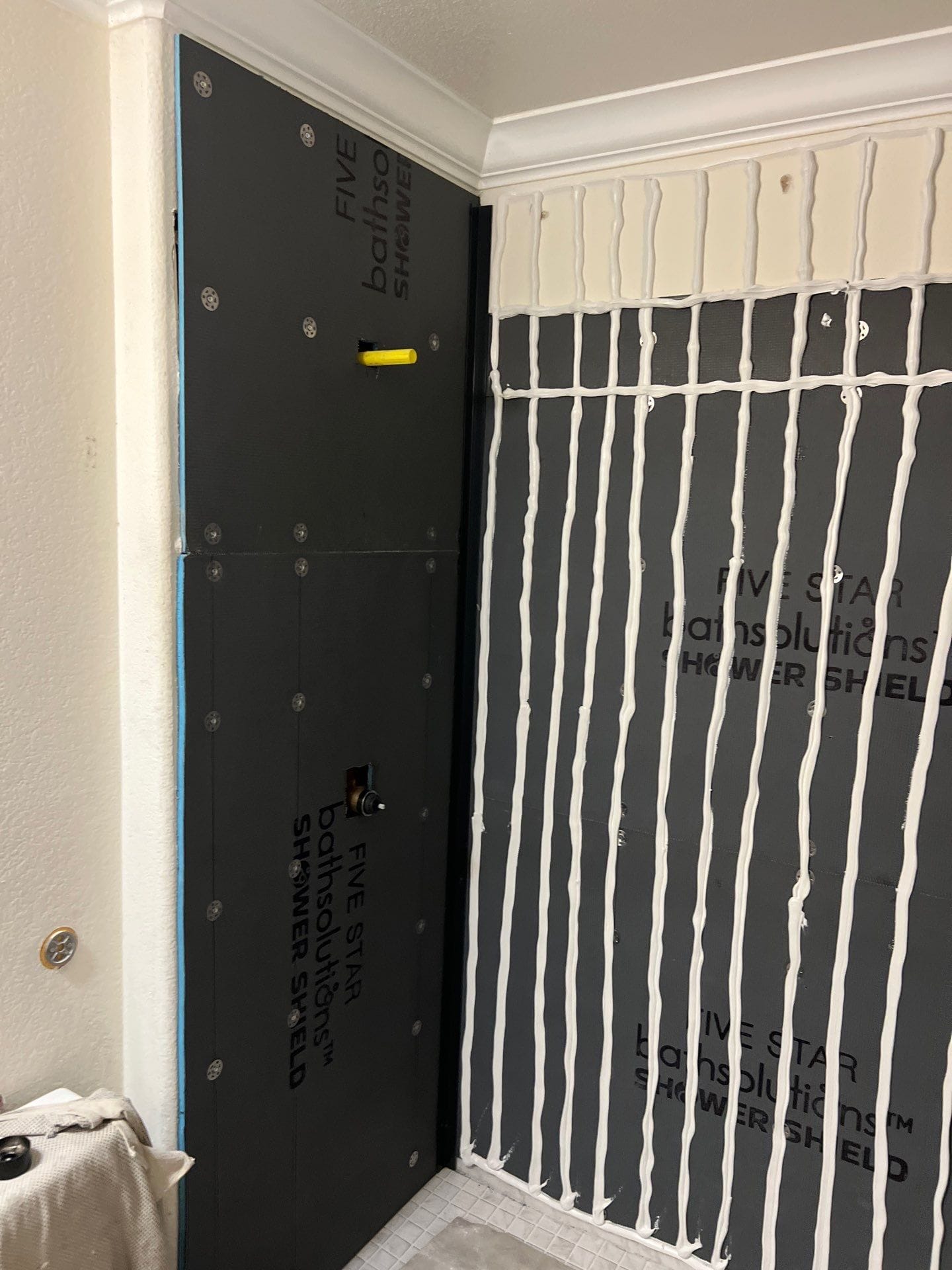 The remodel involved a full demo down to the studs, moisture mitigation, new structural bracing, upgraded plumbing, and the installation of a slip-resistant solid-core base. A modern marble-style wall panel finish was selected, featuring bold veining consistent across all panels. Two floating corner shelves were mounted inside, and a fold-down teak bench was anchored securely to the back wall. Matte black fixtures and accessories were chosen, including a framed sliding glass door with integrated towel bar. Kevin used a 3D design platform to confirm layout, materials, and fixture finishes, which helped the customer visualize spacing and proportions with confidence.