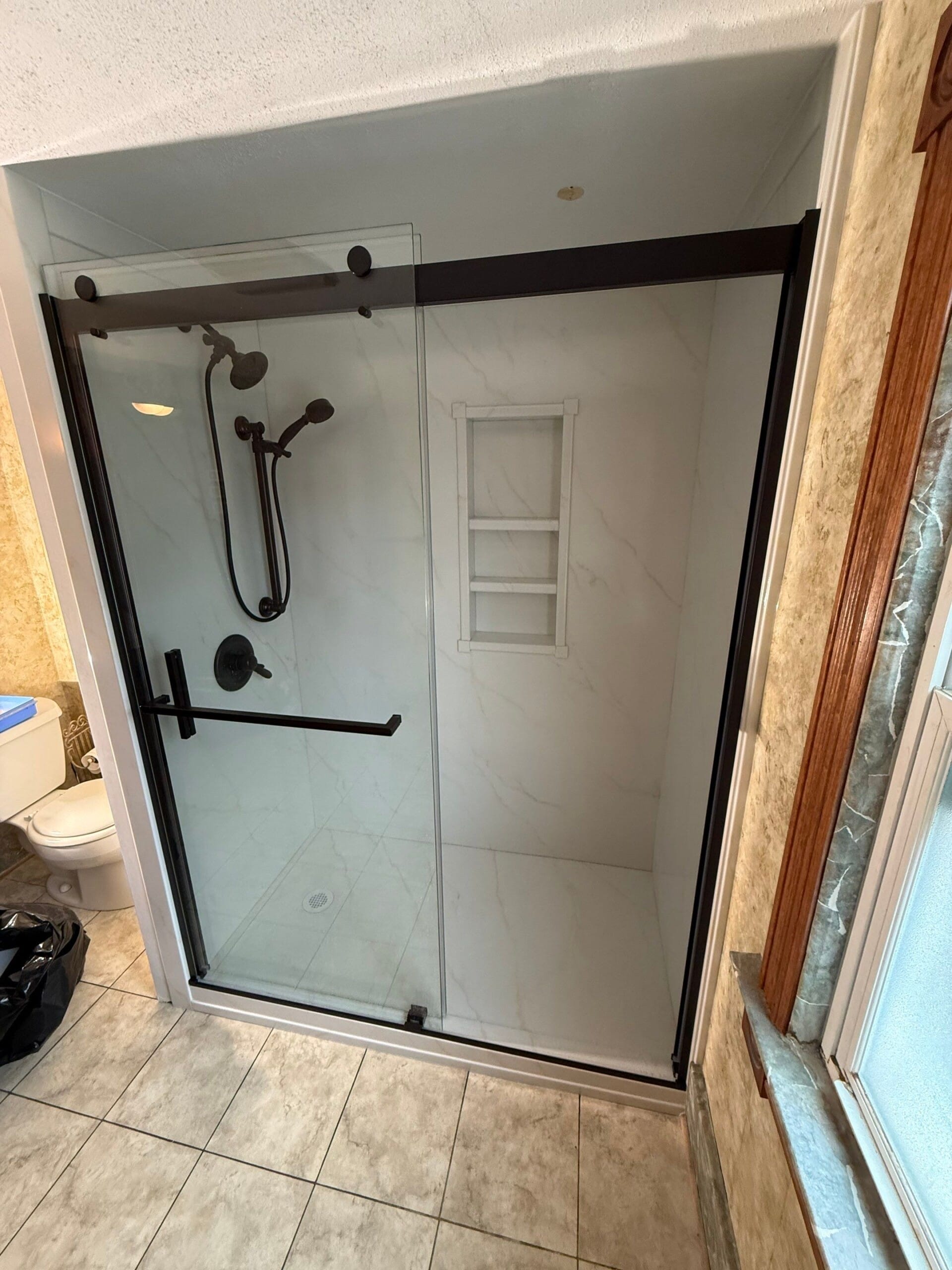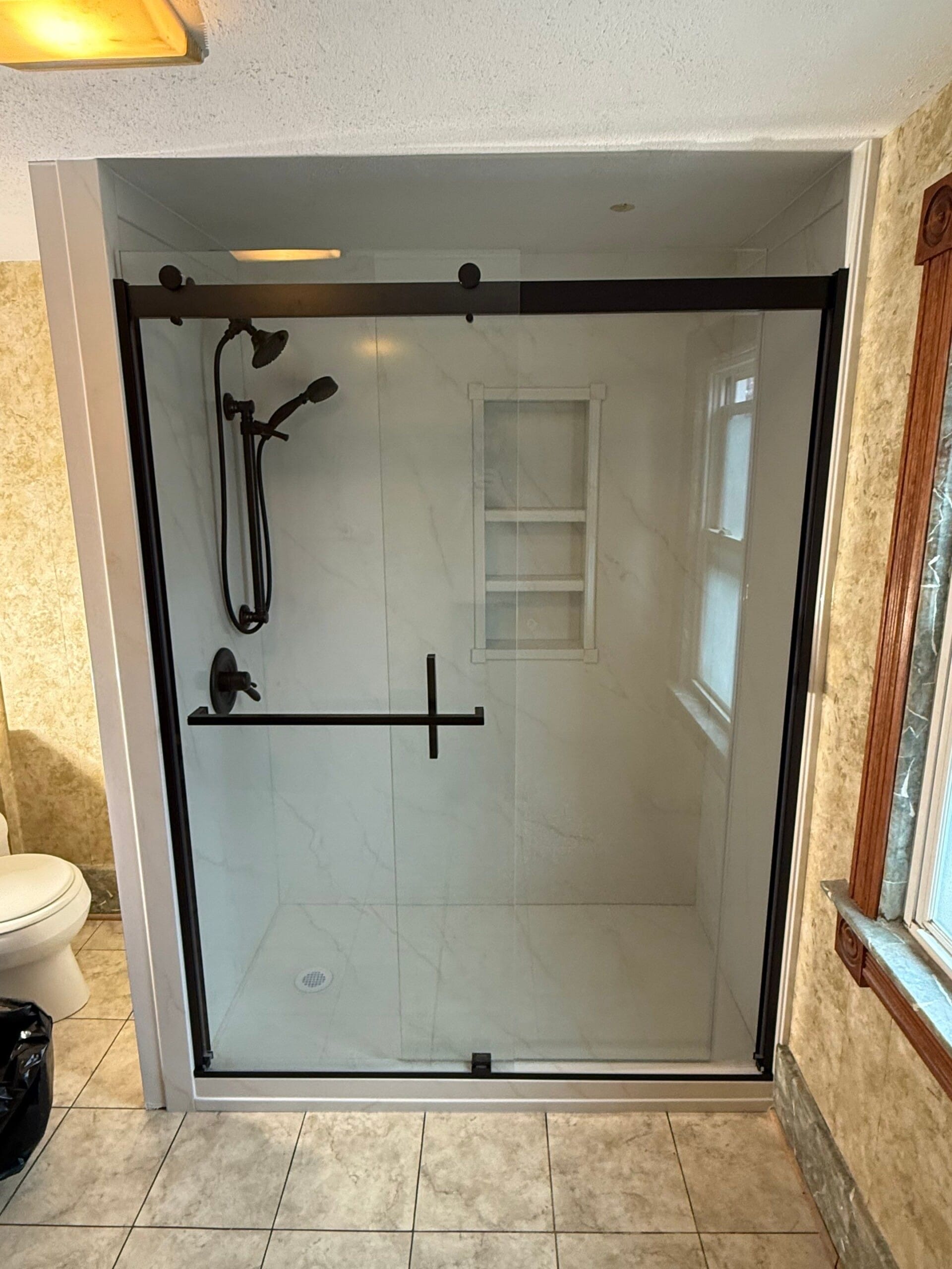 The Representative presented a complete shower system featuring a grout-free wall design with a clean, marble-style appearance that supports long-term durability and simplified maintenance. The upgraded space includes a sliding glass enclosure with a matte black frame, paired with a coordinated matte black shower fixture system that enhances both function and visual appeal. The company’s focused approach to bathroom remodeling and commitment to quality materials helped reinforce confidence in the solution being tailored to meet the customer’s needs.