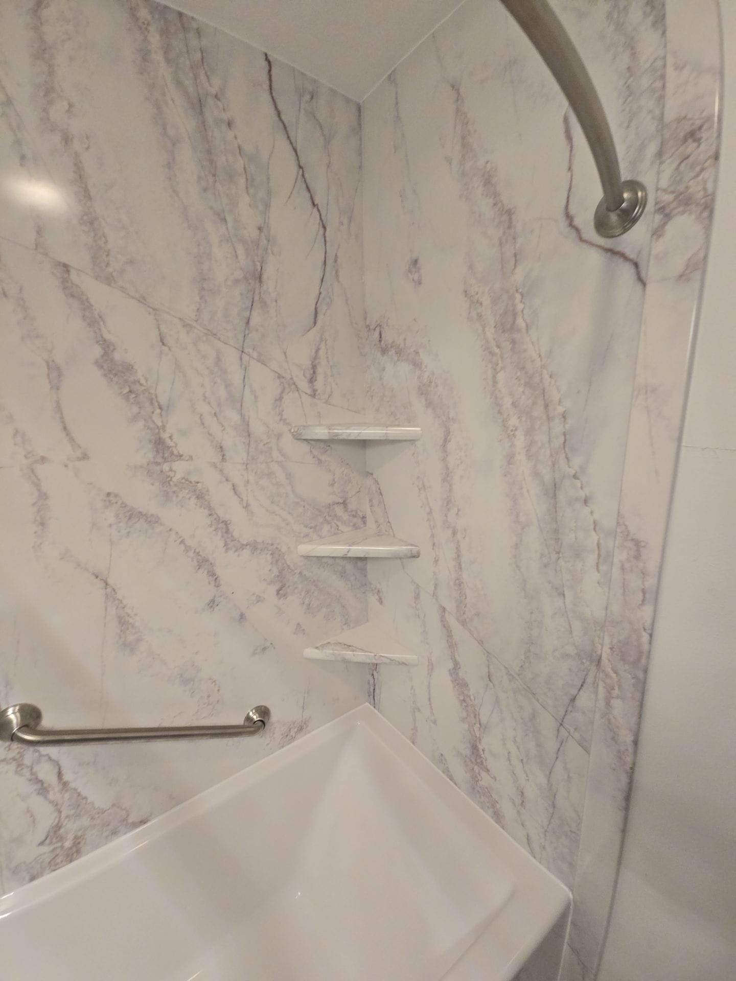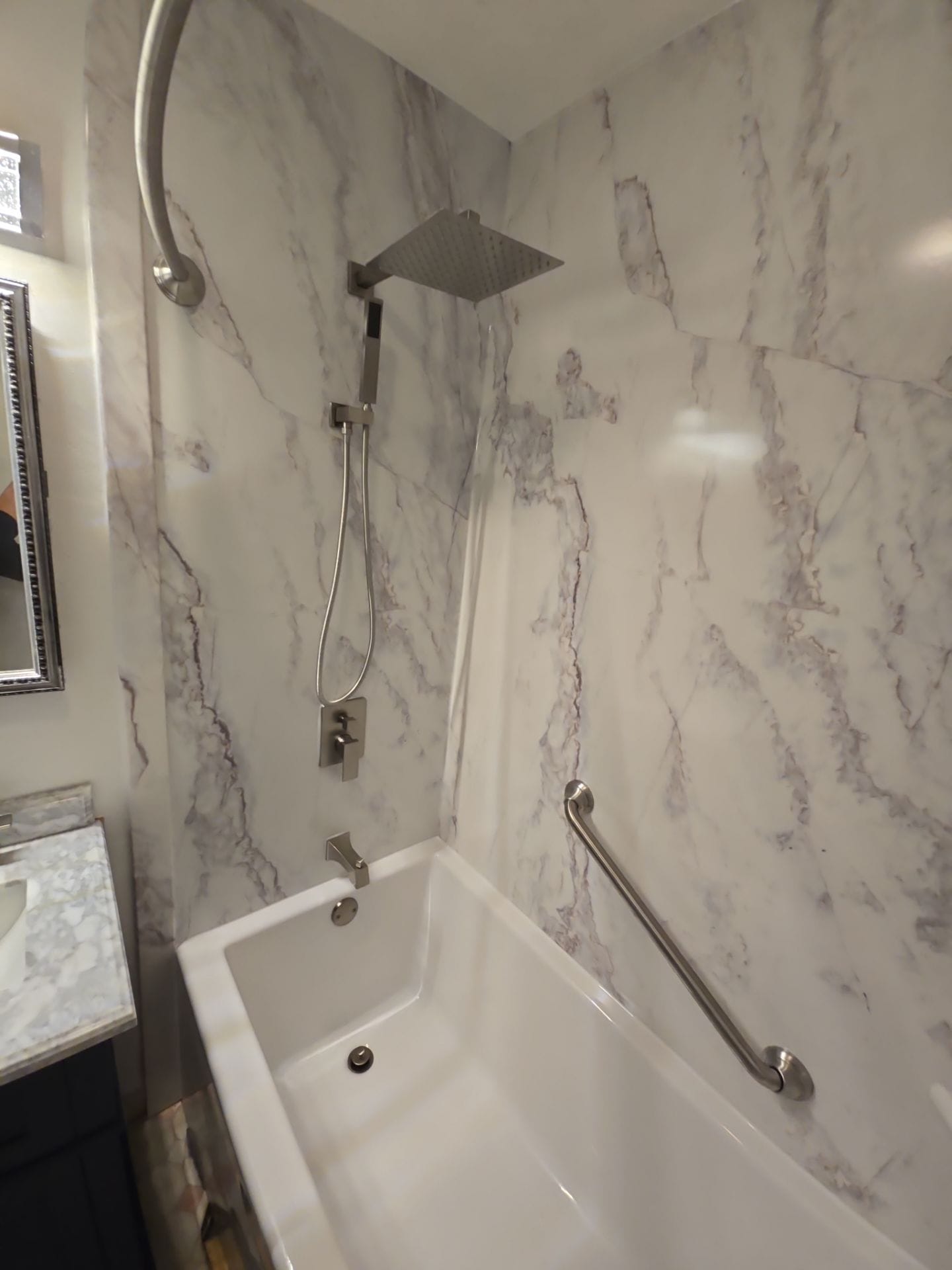 The final installation featured a solid acrylic bathtub with a squared modern profile. Surrounding walls were finished with a marble-style, grout-free composite paneling that extended to the ceiling. Brushed nickel finishes unified the hardware, including a rain showerhead with matching handheld sprayer, modern diverter controls, and an integrated curved shower rod. Three custom corner shelves provided storage while maintaining visual continuity. A single safety grab bar was installed diagonally on the plumbing wall for secure support.