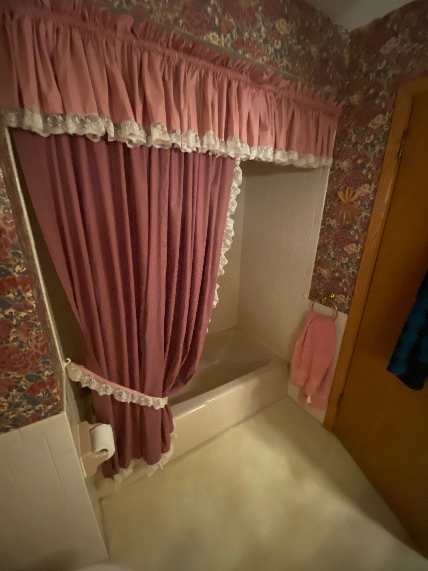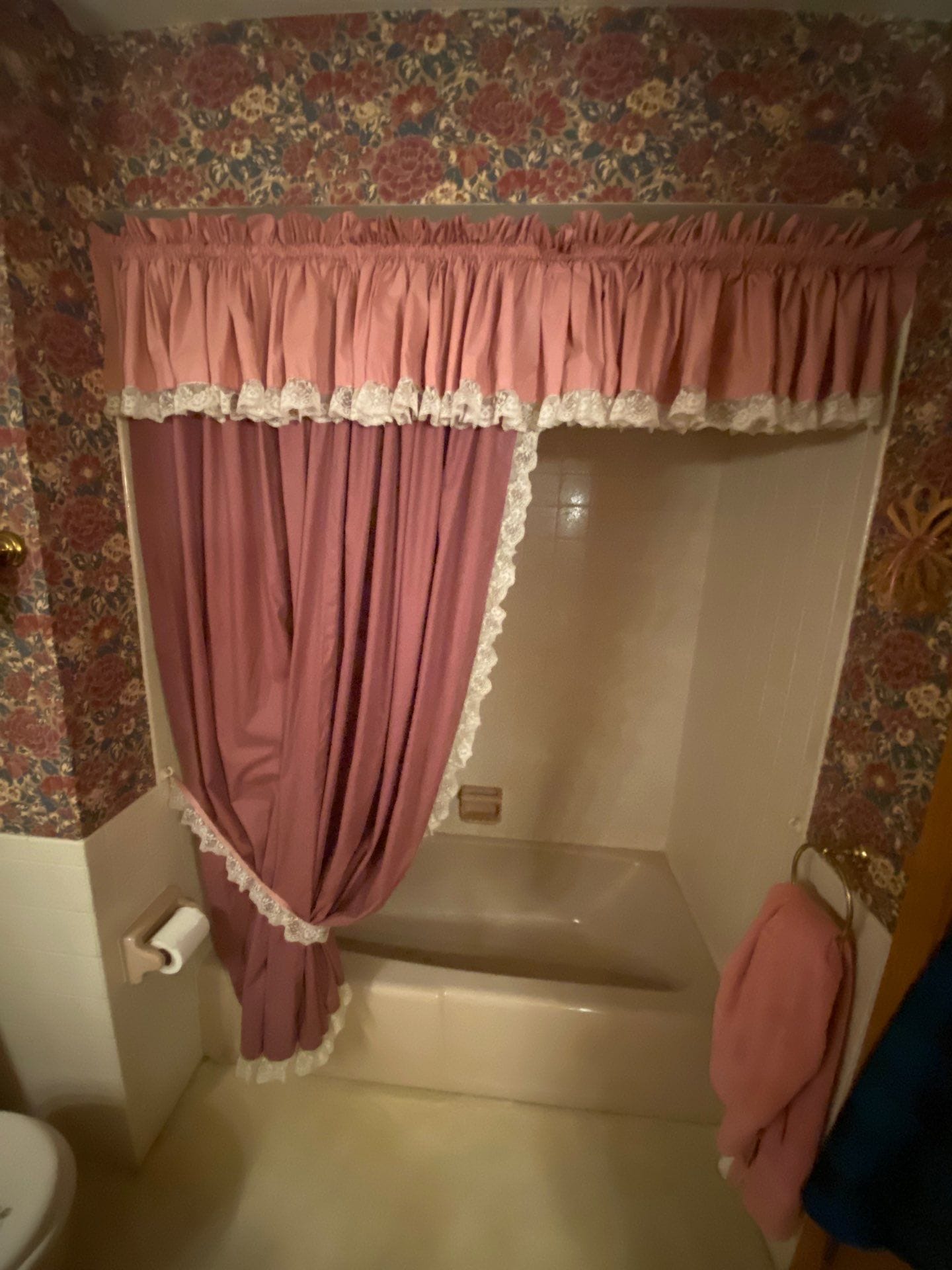 The upgrade included a stainless dual-head shower system with a rainfall-style fixed showerhead and handheld sprayer mounted to a vertical slider bar. A full glass bypass door system replaced the curtain setup and enclosed the wet area without requiring swing clearance. The original wallpaper and flooring remained untouched, preserving the vintage floral aesthetic outside the shower while modernizing the wet area with updated functionality.