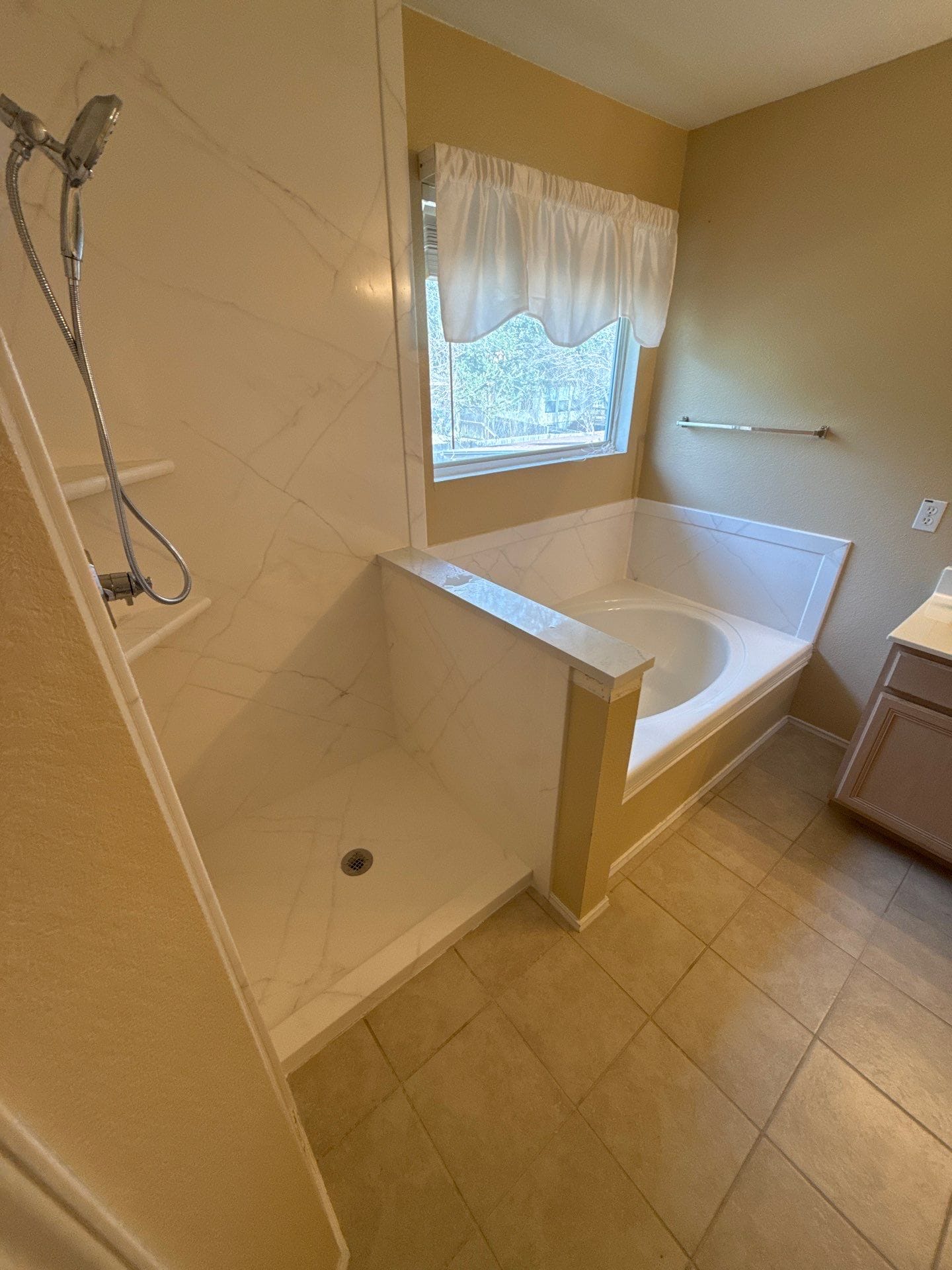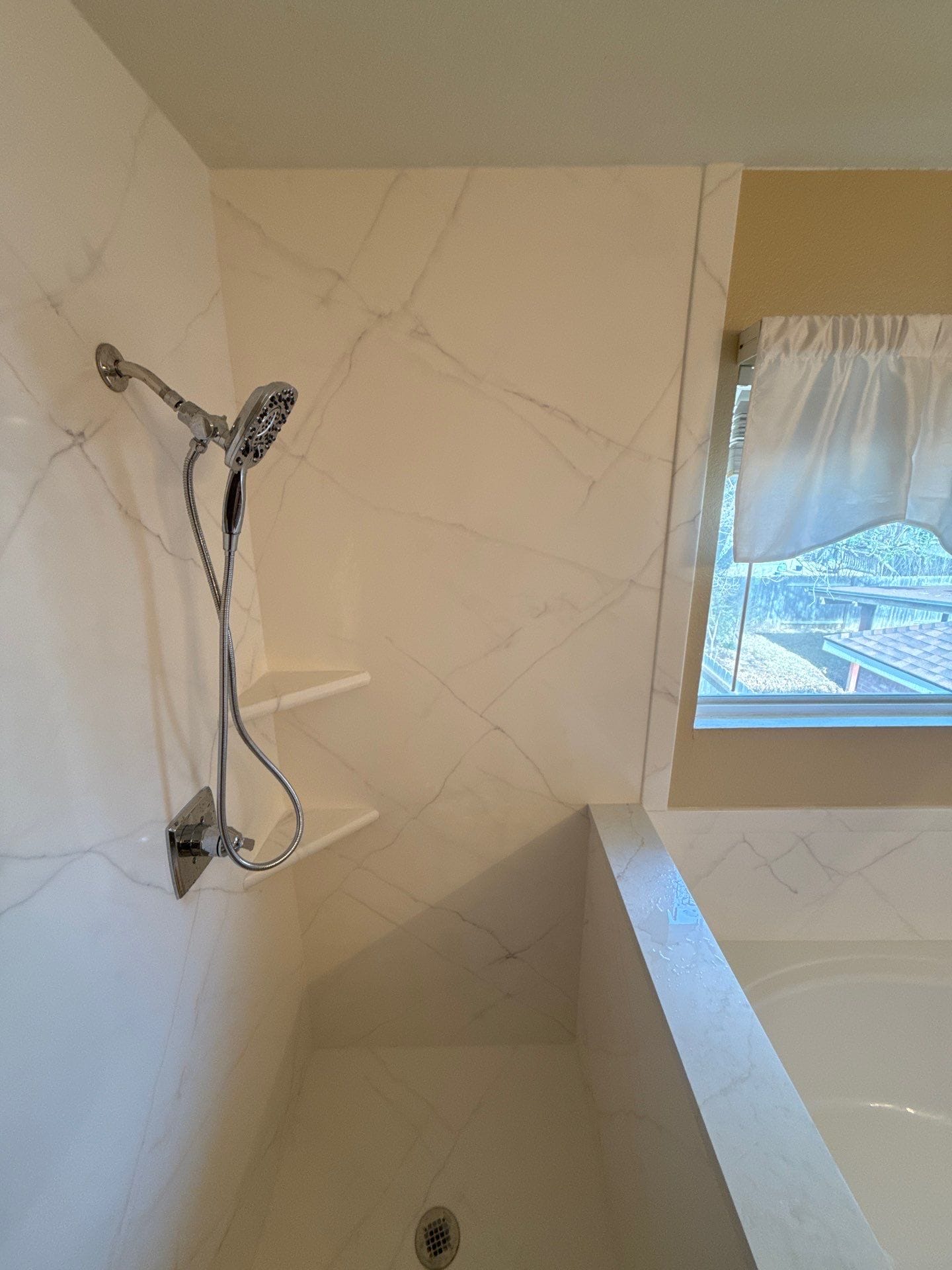 The renovation process included demolition of the existing shower enclosure and wall materials, preparation of the framing, and installation of a waterproof backer system to protect the structure. New plumbing fixtures were installed, including an updated shower valve and a detachable handheld shower system. The walk-in shower base was set in place, followed by installation of the marble-pattern wall panels and integrated corner shelving. The soaking tub surround was refinished with matching panels to create a unified appearance. Flooring and surrounding surfaces were protected throughout the project, and installation was completed efficiently within a short timeframe.