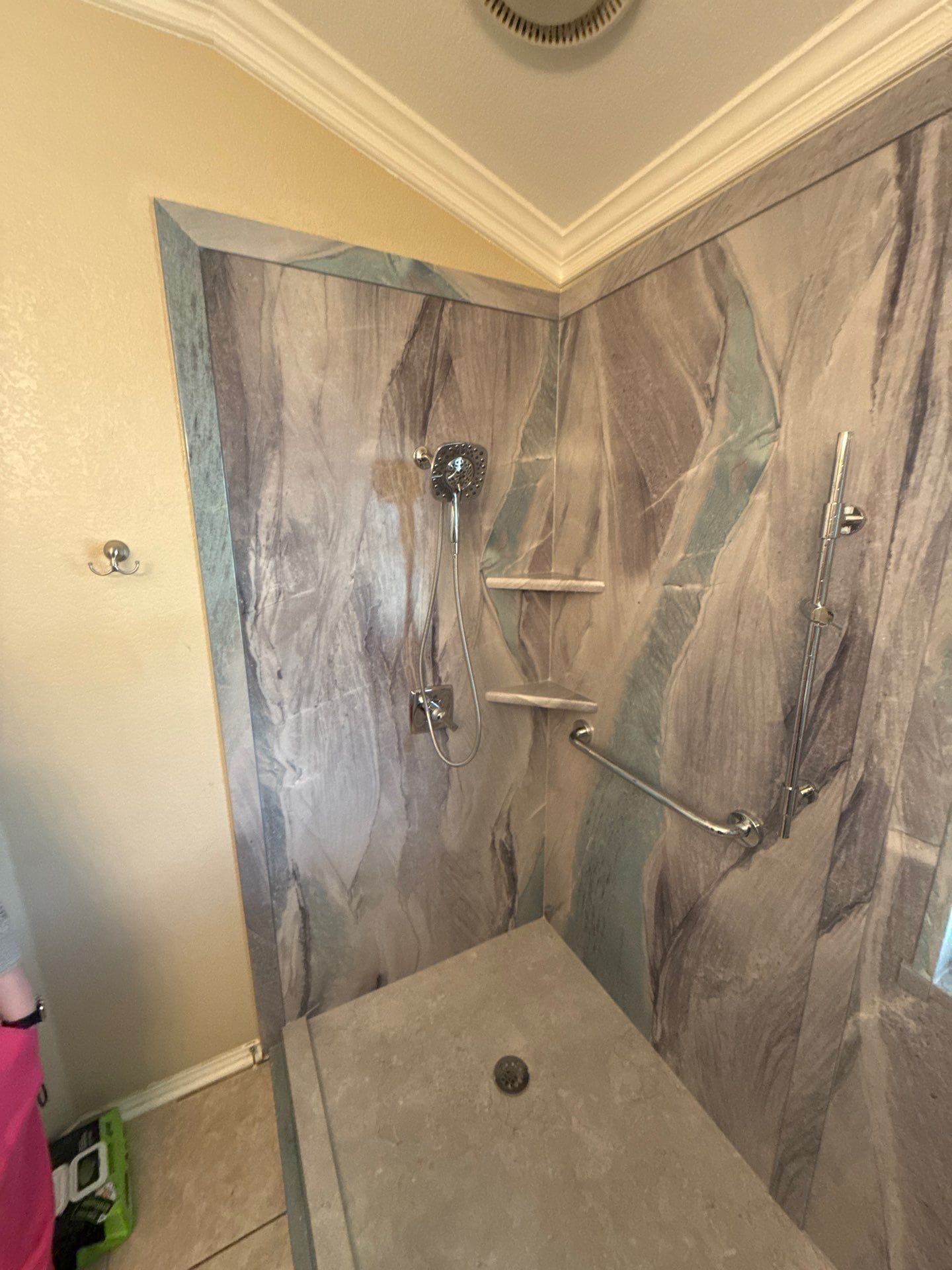 The Five Star Bath Solutions representative proposed the exclusive Smart Choice composite system, emphasizing its durability, hygienic benefits, and easy maintenance. The wall panels replicated the look of natural stone with light gray and white tones that harmonized with the existing tile floor and created a brighter environment. Hardware in polished chrome was selected to complement the updated aesthetic. The representative also highlighted the company’s national reach, A+ BBB rating, and professionally trained, in-house installers. The system’s antimicrobial and non-porous properties met the customer’s goals for long-term simplicity and cleanliness.