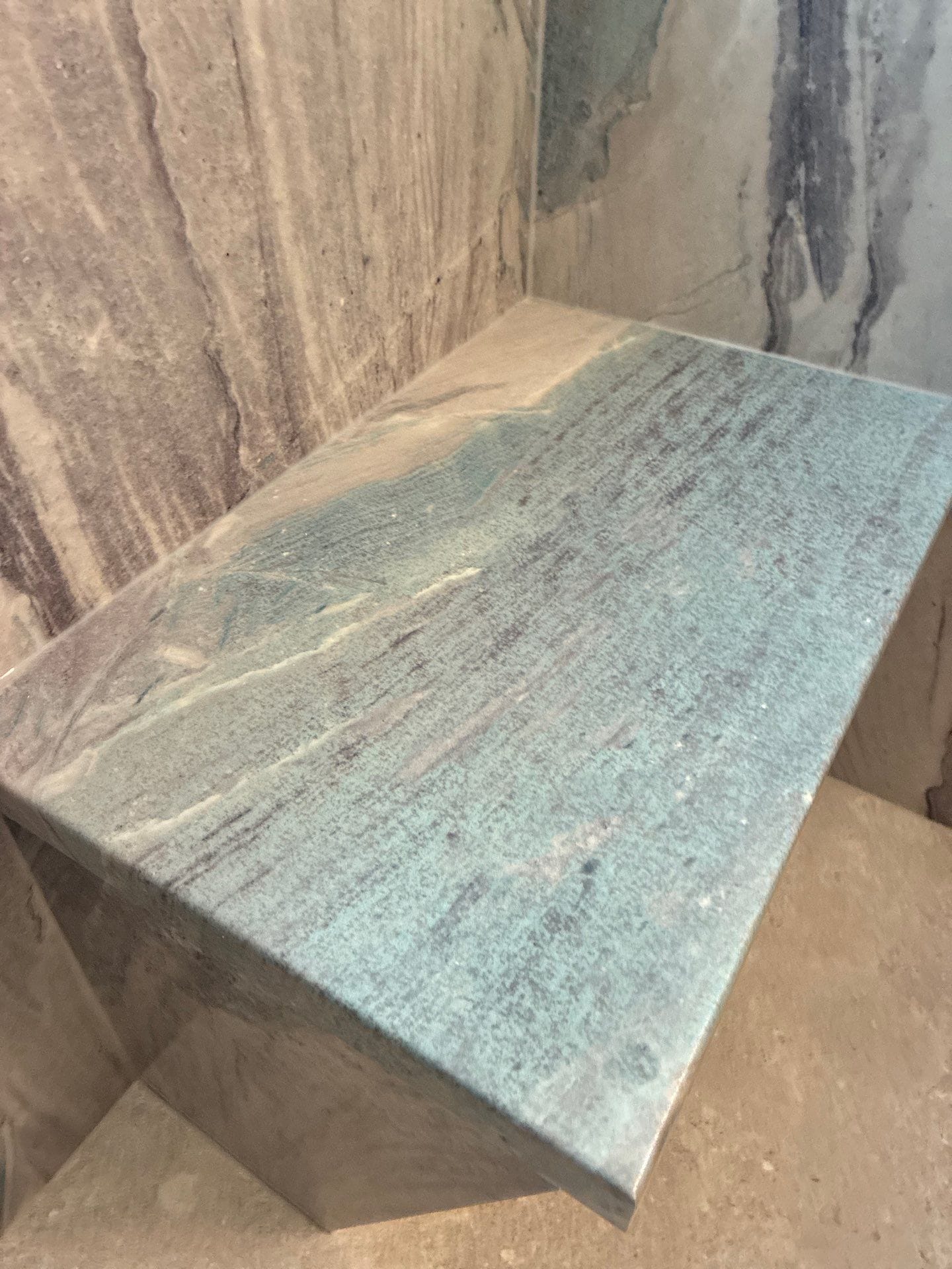 Installation was scheduled to follow a precise timeline, beginning with post-signature measurements and continuing with manufacturing and shipping of custom components. The site preparation included removal of the old tub and tiled shower, structural adjustments, and surface prep. The new shower base was installed with a low threshold, and slab-look wall panels were placed seamlessly from floor to ceiling. The frameless glass enclosure was secured with a top-mounted sliding system to reduce visual bulk. A recessed shelf and corner shelves were incorporated for storage, and a single grab bar was mounted for stability and safety.