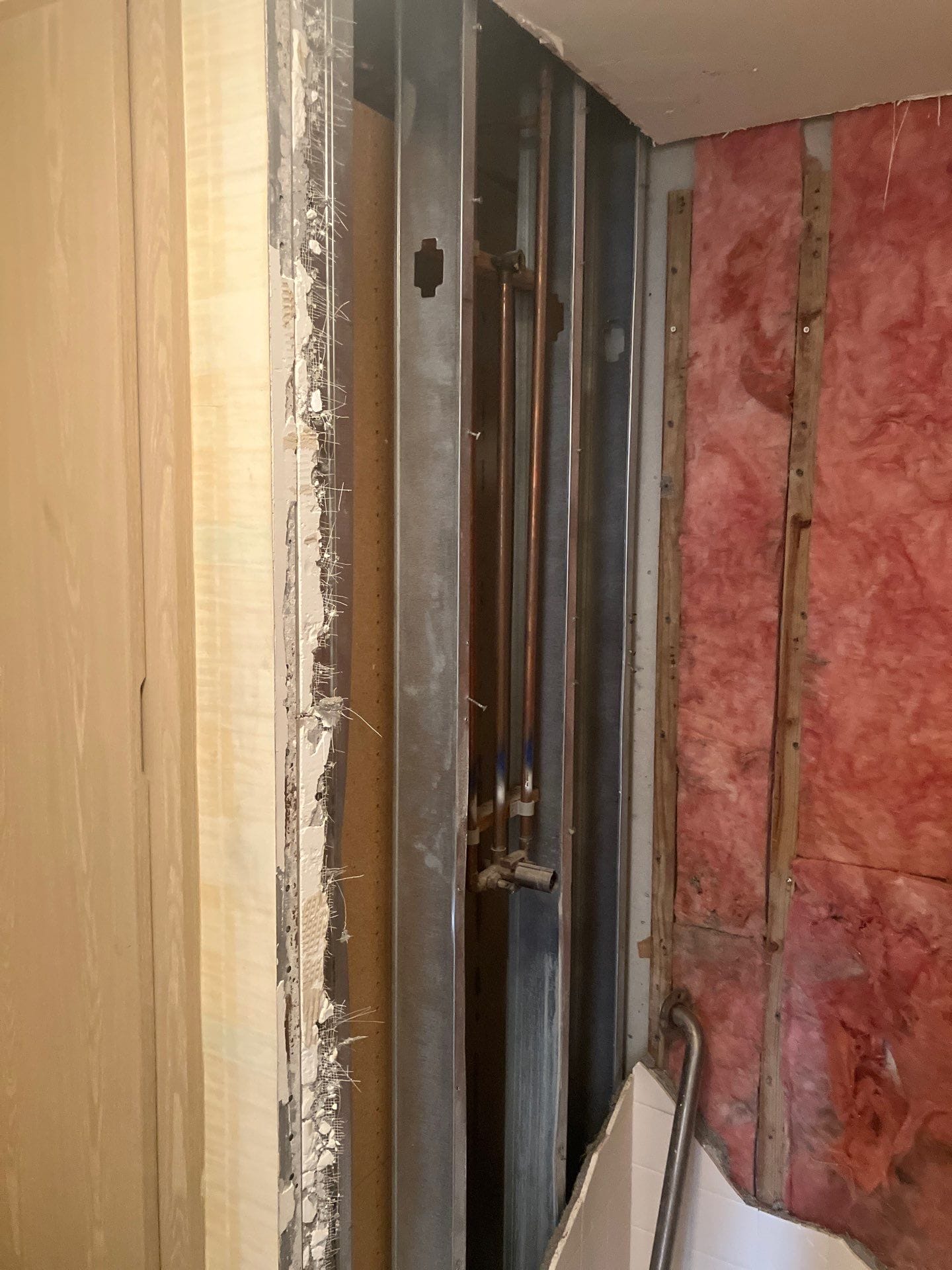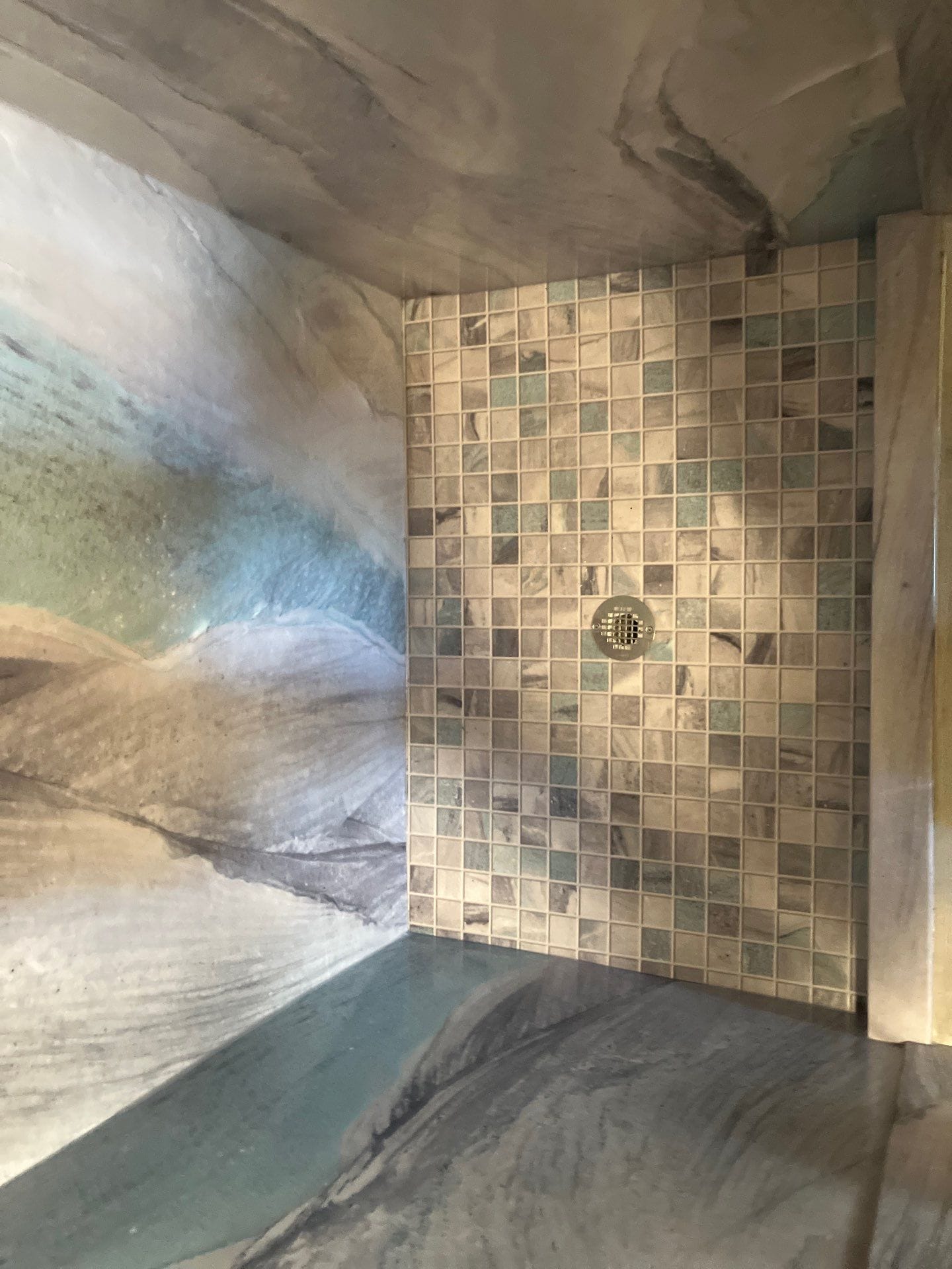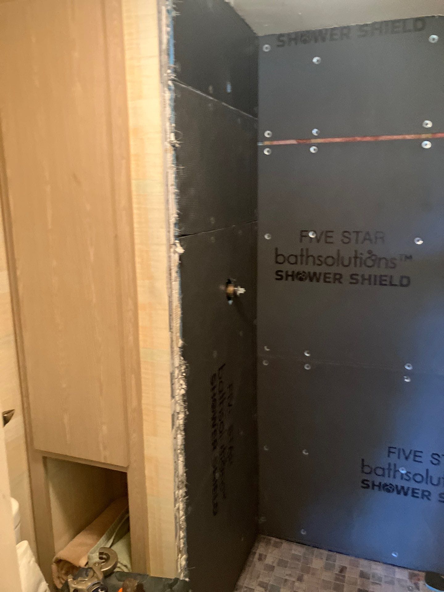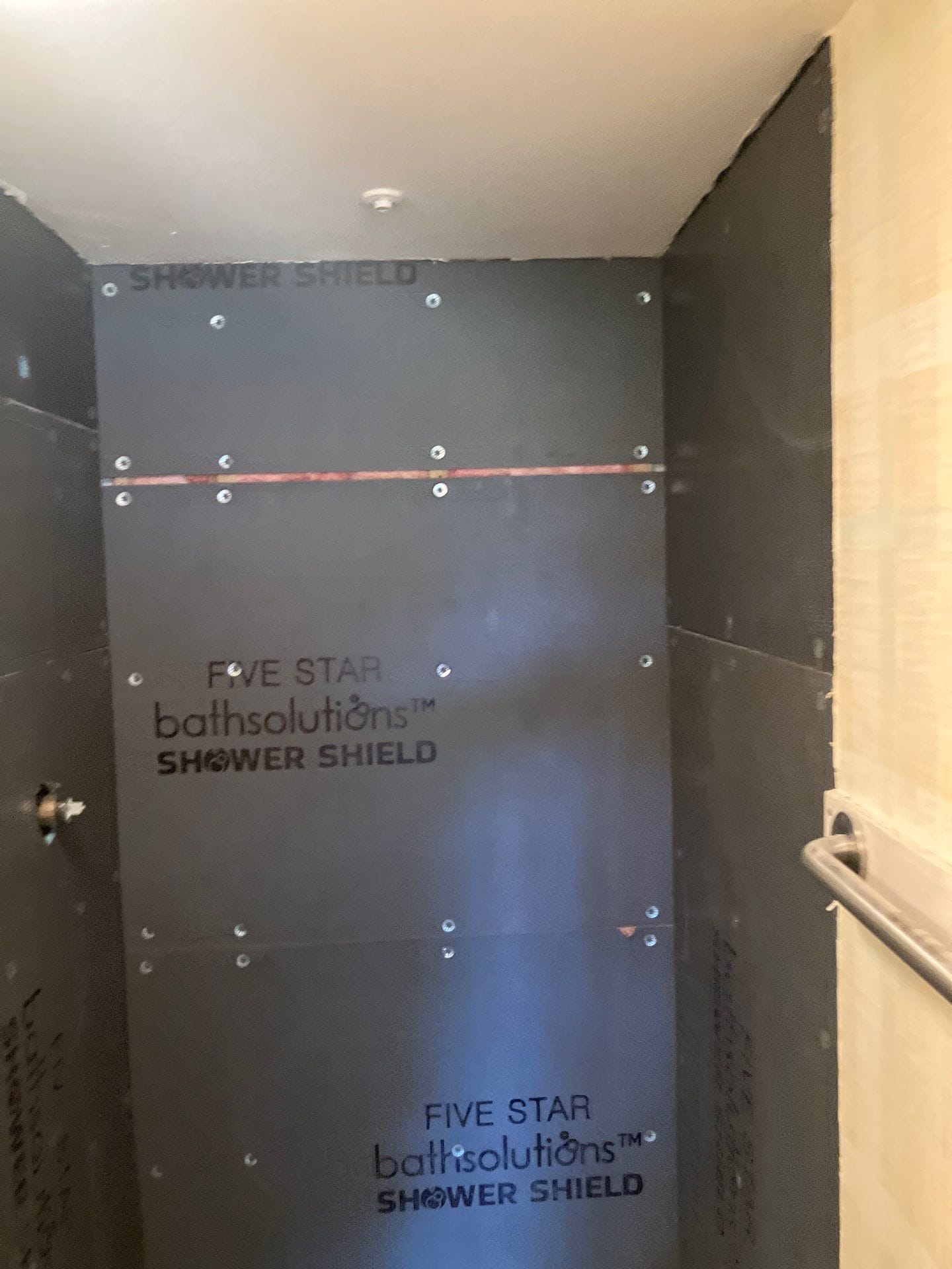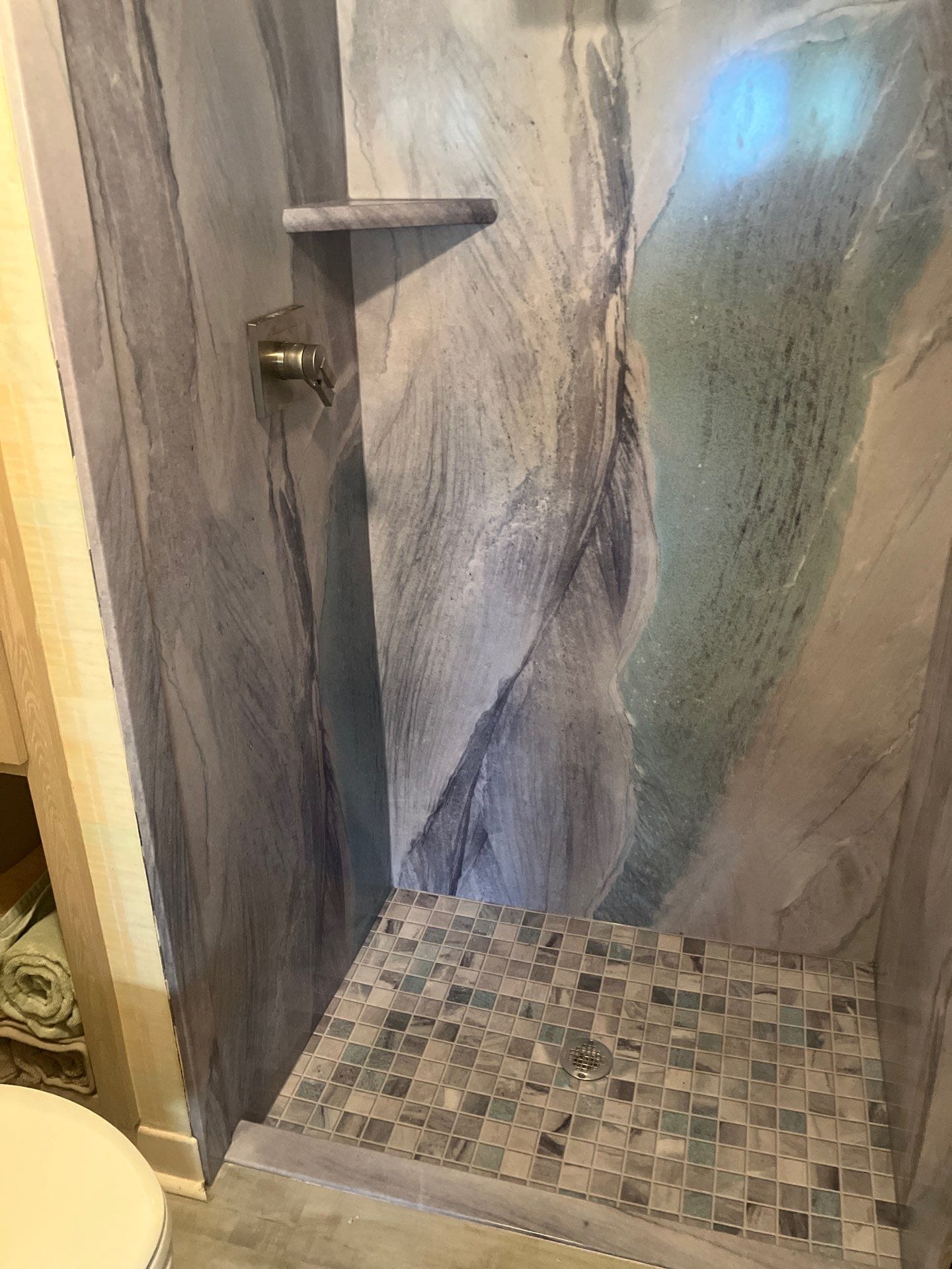 The remodel included full removal of all old materials down to the studs, with new plumbing, drain replacement, and substructure verification performed before installation. The shower space was refitted with Everest Smart Choice wall panels, featuring seamless integration of a recessed soap niche and corner shelf. The original shower head and controls were replaced with a brushed nickel rain-style fixture system, mounted higher for improved coverage. The existing grab bar on the adjacent wall was retained for accessibility. The base was upgraded to a dark, square-mosaic shower pan, creating a clean contrast with the wall tones and enhancing the floor’s visual texture.