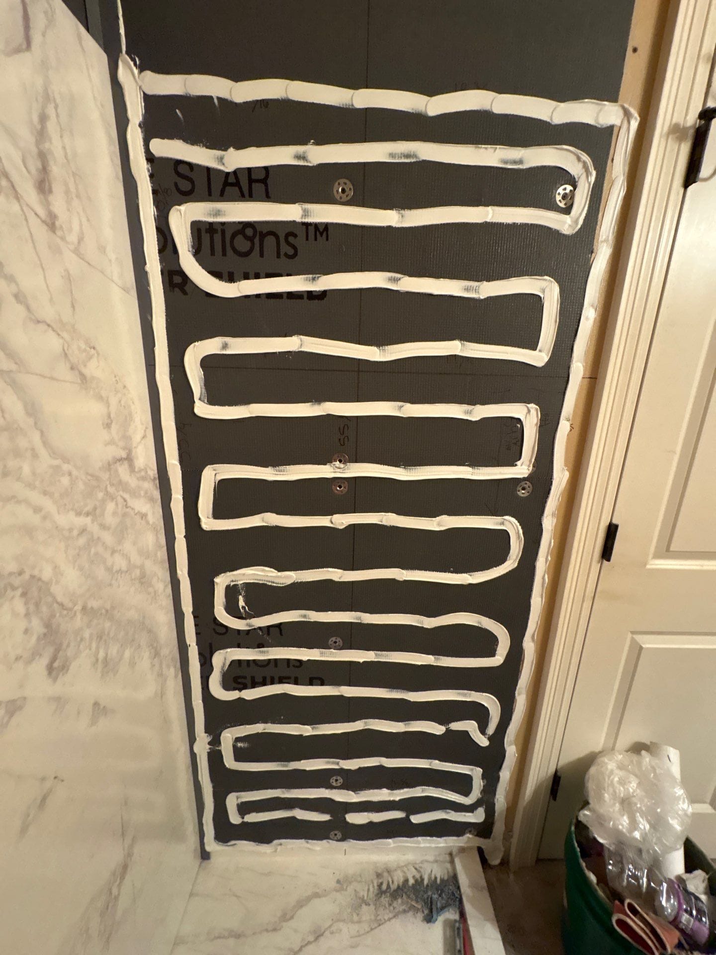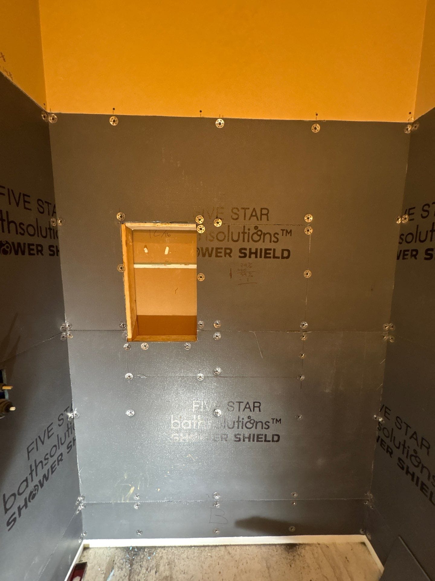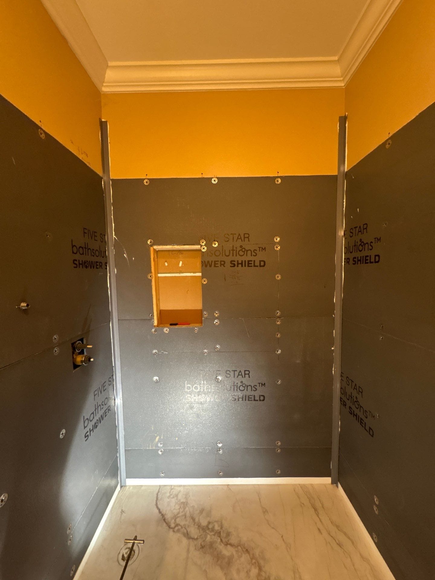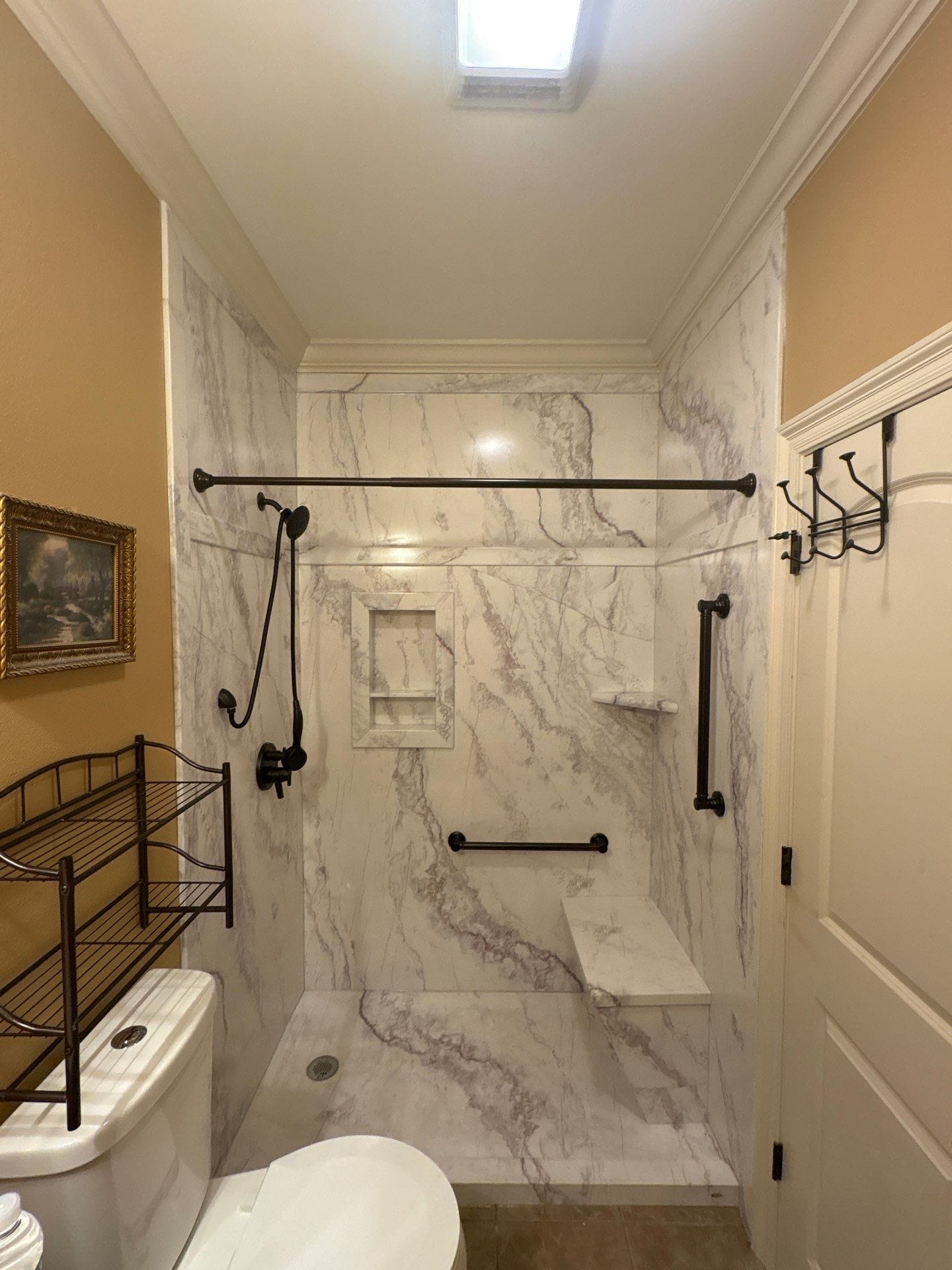 The Five Star Bath Solutions representative presented grout-free six-layer composite wall panels designed with an antimicrobial and scratch-resistant surface for long-term durability and easy maintenance. A solid waterproof DensShield backer combined with quad-lock corner protection helps prevent moisture intrusion and eliminates common grout and caulk concerns. The selected marble-pattern finish pairs with oil-rubbed bronze fixtures, creating a cohesive look that complements the existing bathroom accents. The company’s bathroom-only focus supports detailed planning and tailored solutions for each project.