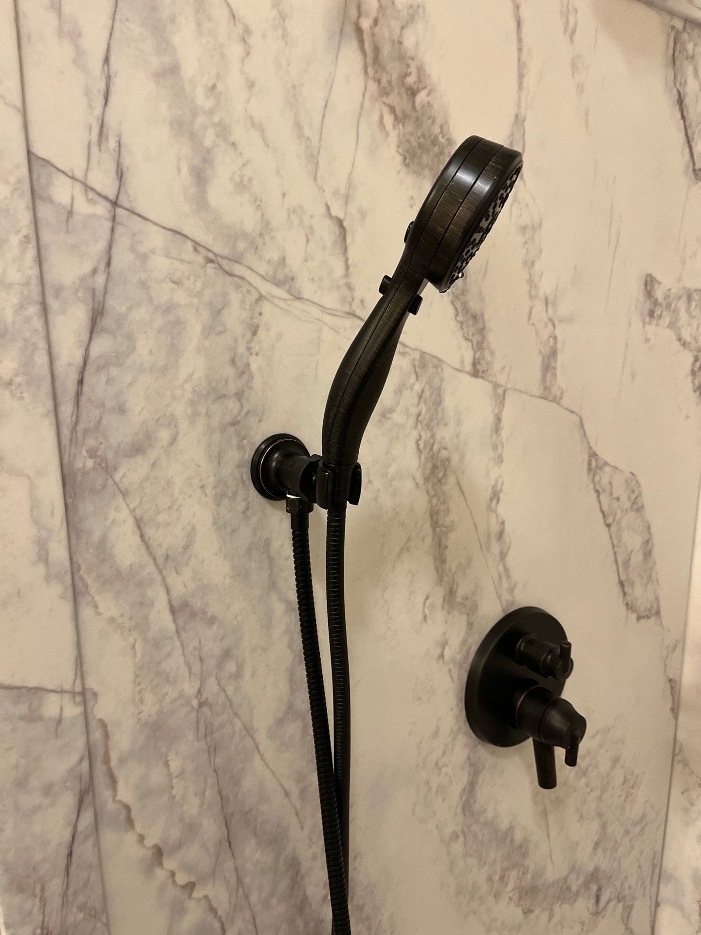 * Oil-rubbed bronze handheld shower system with wall-mounted cradle