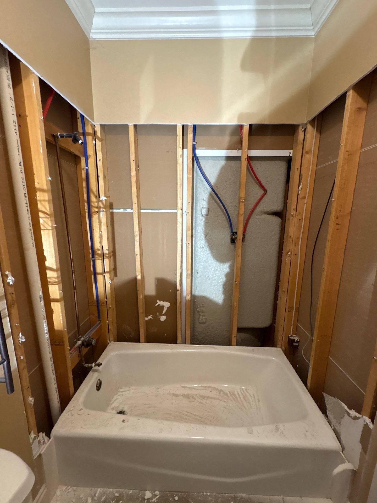 Installation was completed in two days. The crew documented the jobsite, protected surrounding surfaces, removed materials down to the studs, performed necessary framing adjustments, and installed a new high-pressure mixing valve, waterproof backer system, wall panels, shower base, grab bar, corner shelf, and handheld shower fixture. The work area was cleaned thoroughly at the end of each day, and debris was removed without the need for an on-site dumpster.