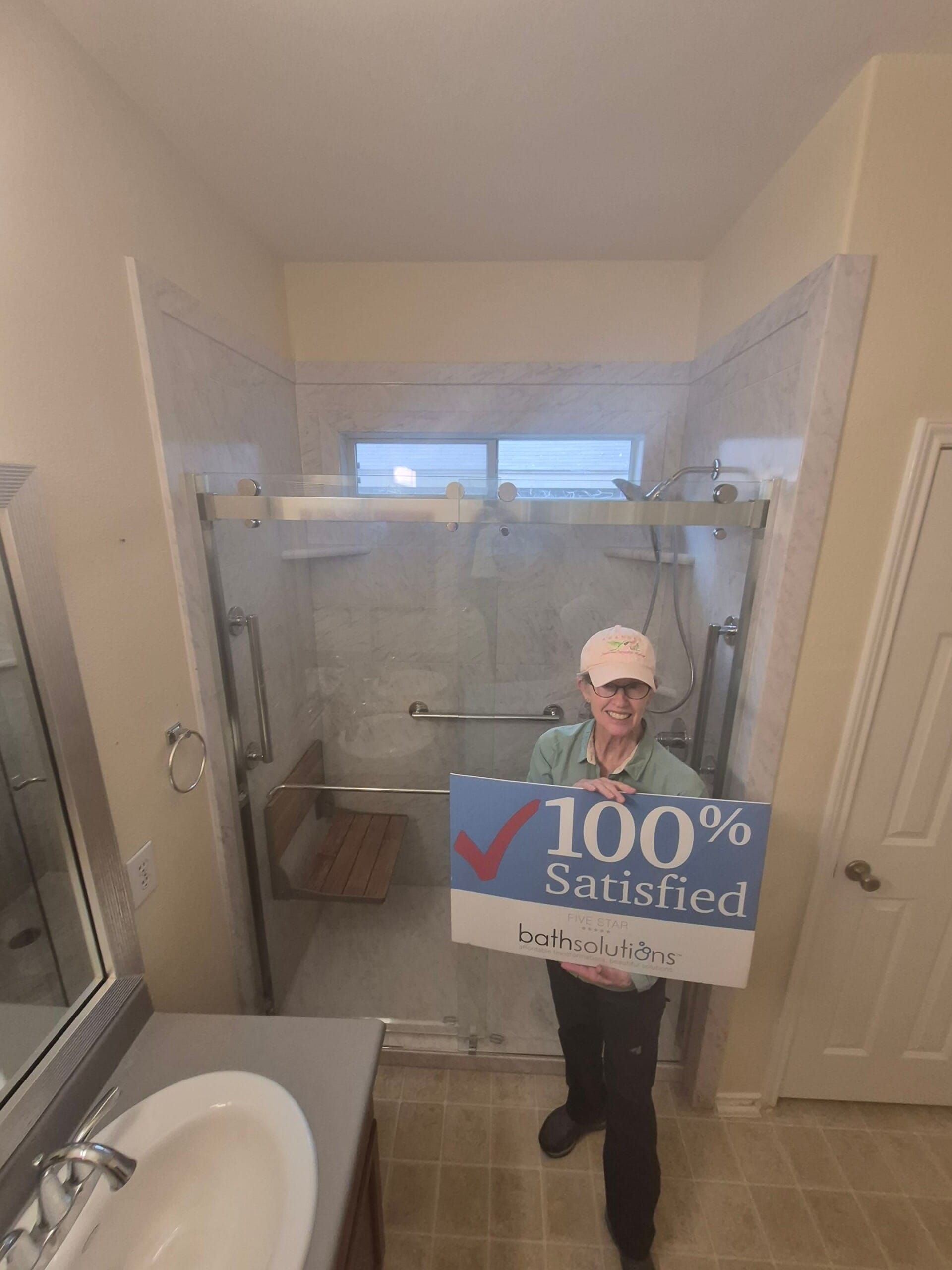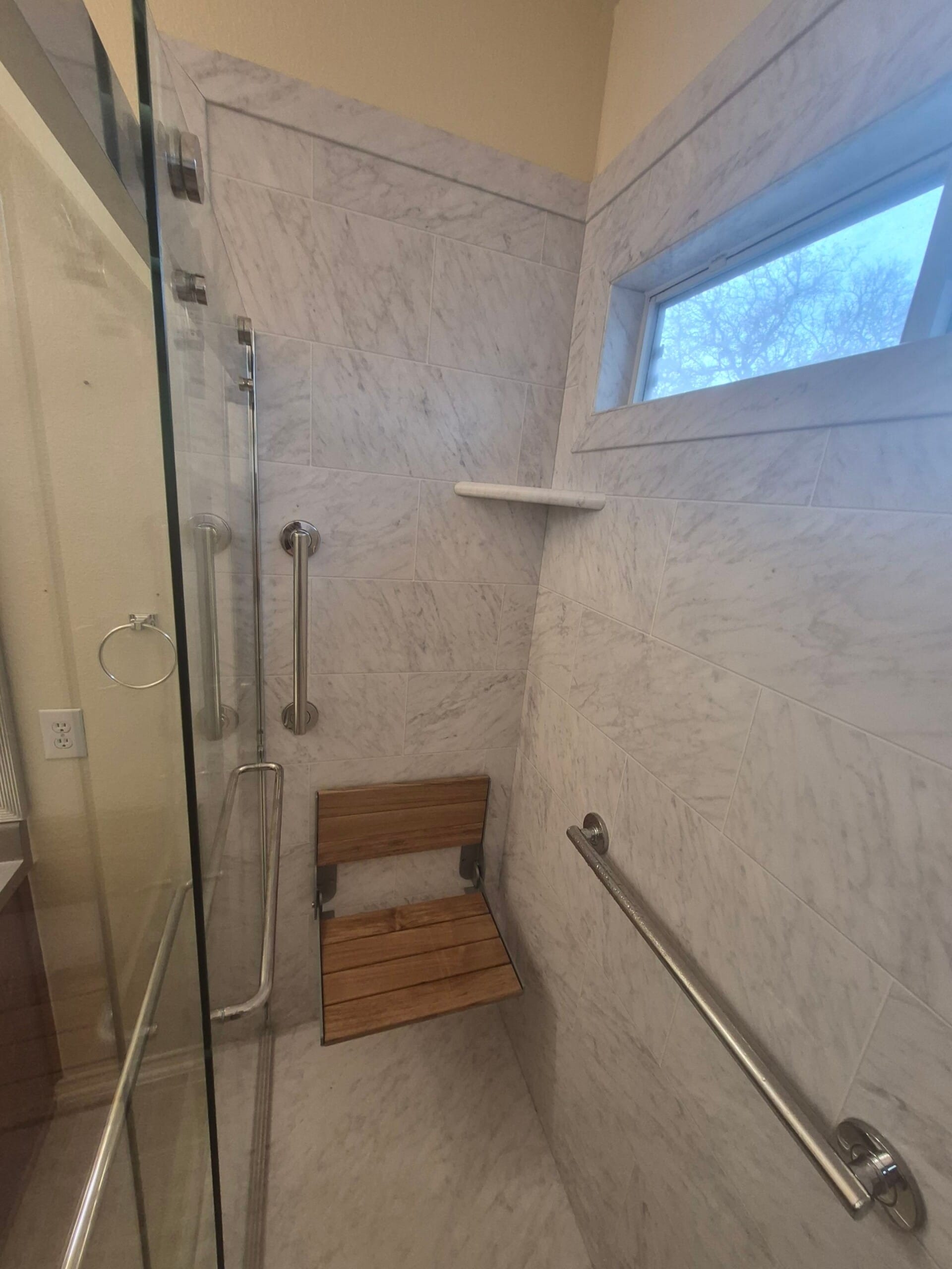 The Representative presented a grout-free composite wall system designed to replicate natural stone while eliminating the upkeep associated with tile and grout. The finished shower features a light vein-cut marble-style wall pattern paired with chrome fixtures, creating a bright and refined appearance compared to the previous setup. The design includes a sliding barn-style glass enclosure, a built-in bench for seating, a recessed niche for storage, and integrated corner shelving. A handheld showerhead with adjustable mount complements the main fixture, and a grab bar is installed for added stability and support, aligning with the accessibility goals.