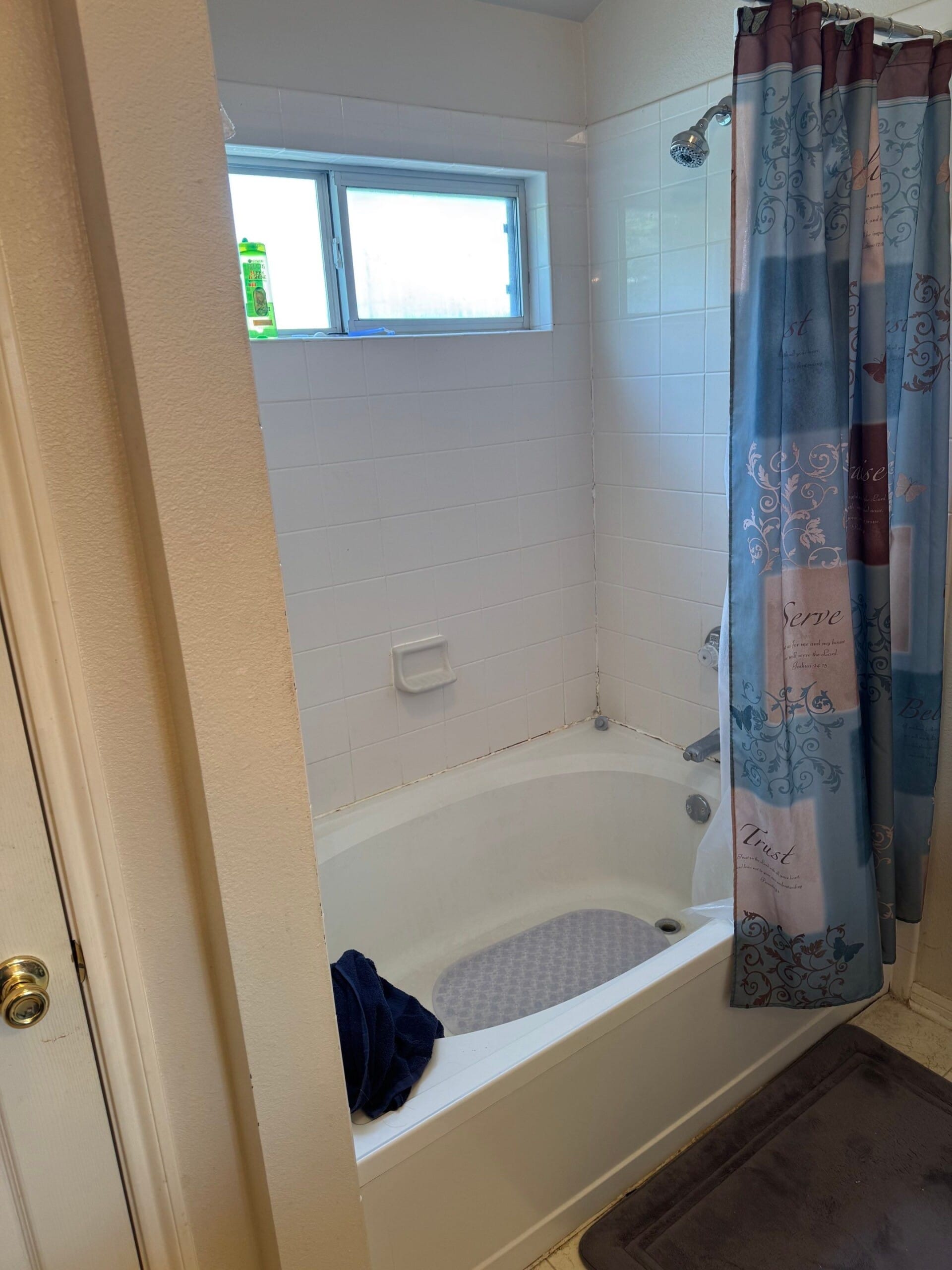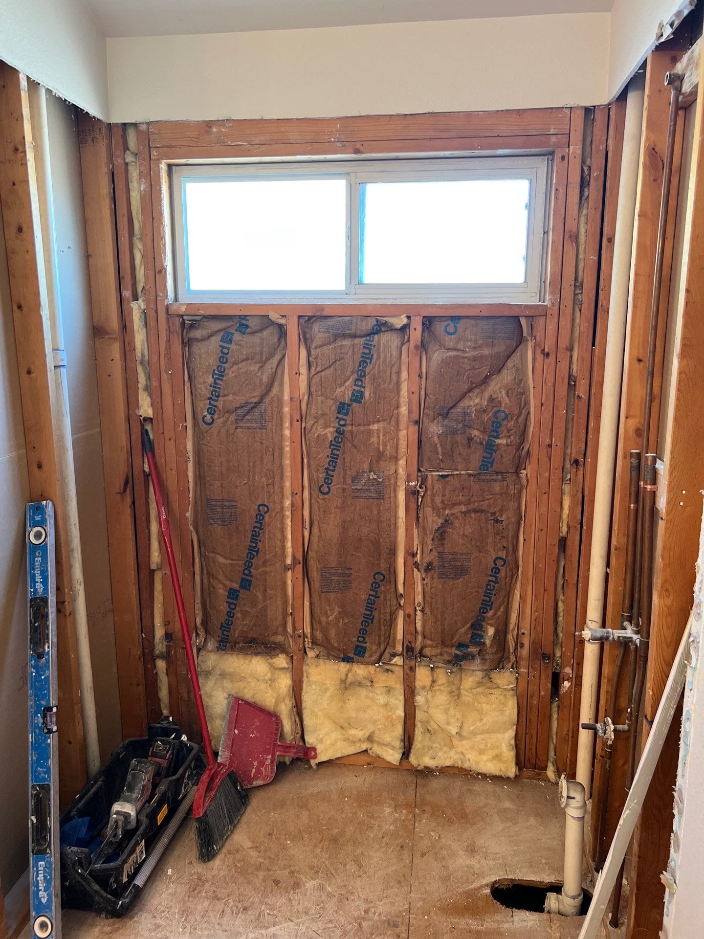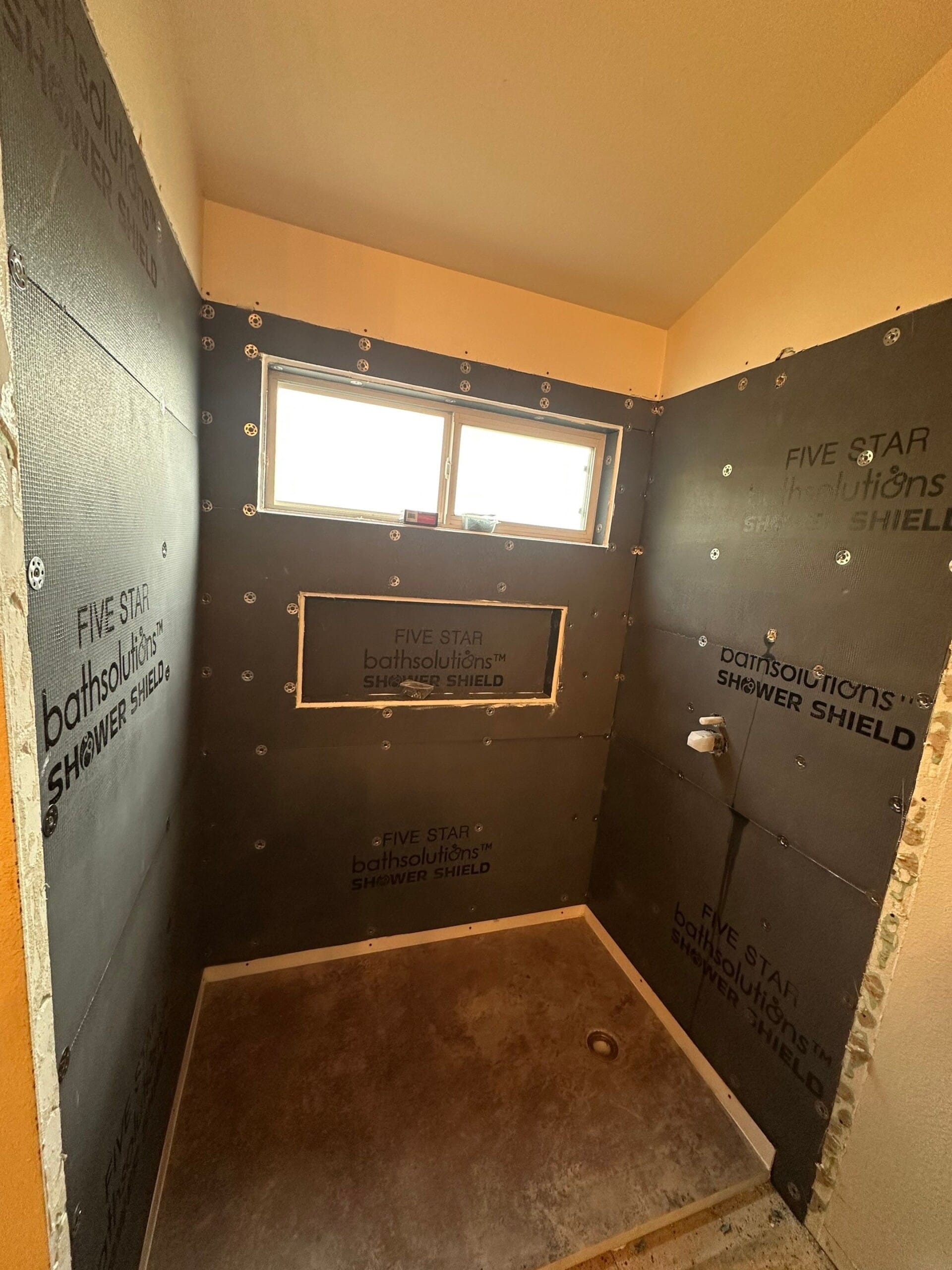 Installation included full demolition down to the studs, subfloor inspection, and installation of a thermal-insulated base paired with waterproof backing. A sliding glass door system with matte black framing was installed for improved water containment and visual structure. A recessed niche was built into the wall for product storage, and wall panels were placed in a staggered stone pattern across all surfaces. All plumbing was updated to code, and the space was completed and cleaned within a two-day window.