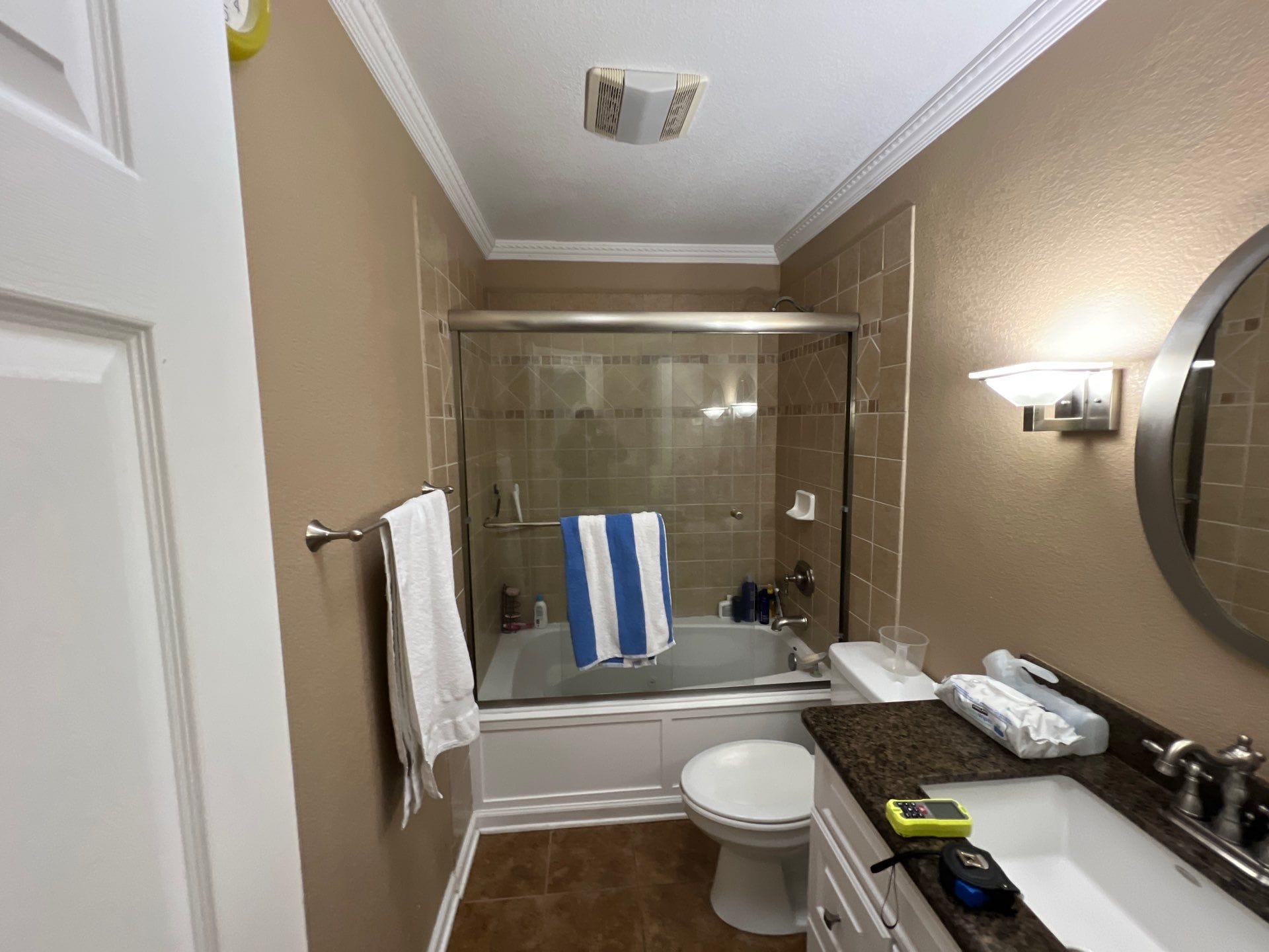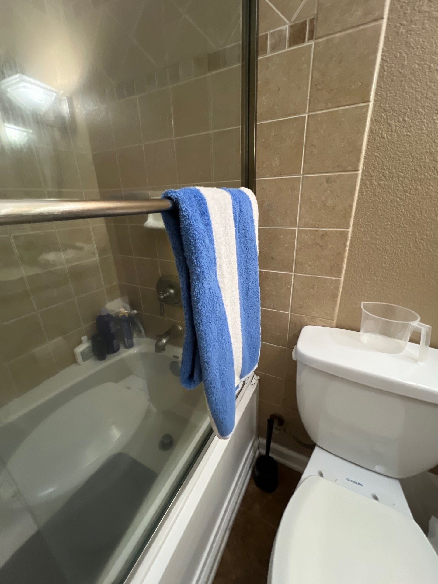 * Sliding glass bypass shower door with towel bar