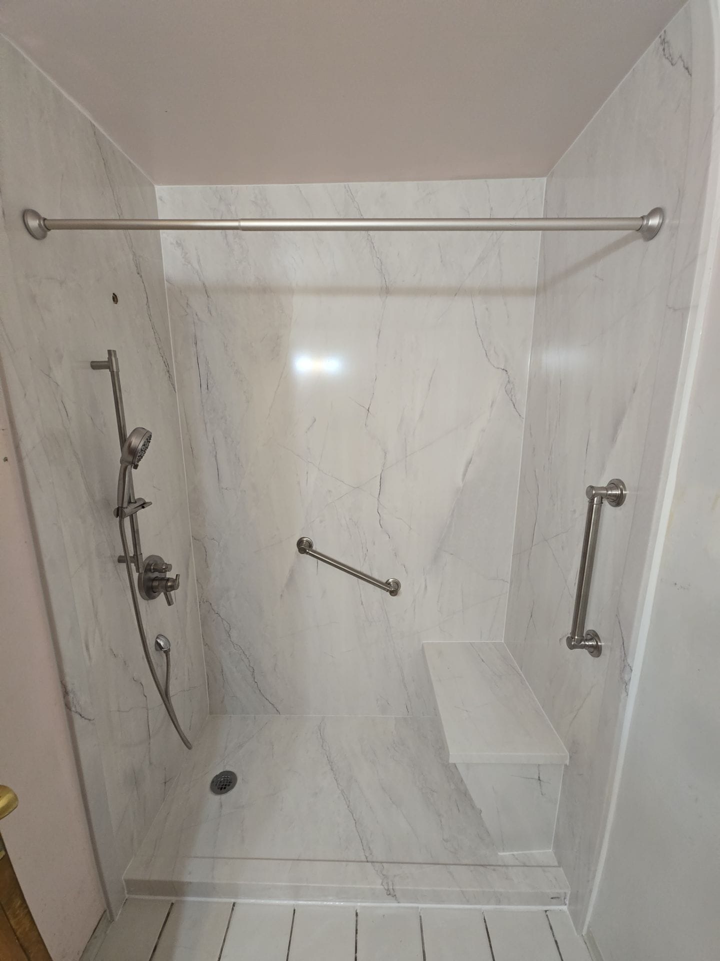The Five Star Bath Solutions representative explained that the company specializes exclusively in bathroom remodeling, bringing decades of experience and certified installation standards. A grout free White Pearl marble patterned wall system was presented to replace the existing tile, offering a non porous and antimicrobial surface designed for durability and simplified maintenance. Brushed nickel fixtures were installed, including a Delta shower system with handheld functionality. The completed shower includes a built in bench for seated bathing, a vertical grab bar at the entrance, a horizontal grab bar along the back wall, and an additional support bar on the plumbing wall. A standard curtain rod was installed for enclosure, consistent with the finished images.