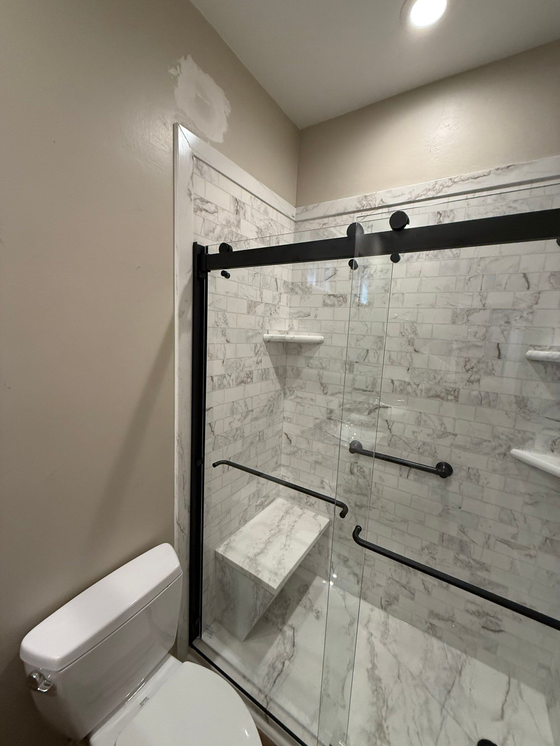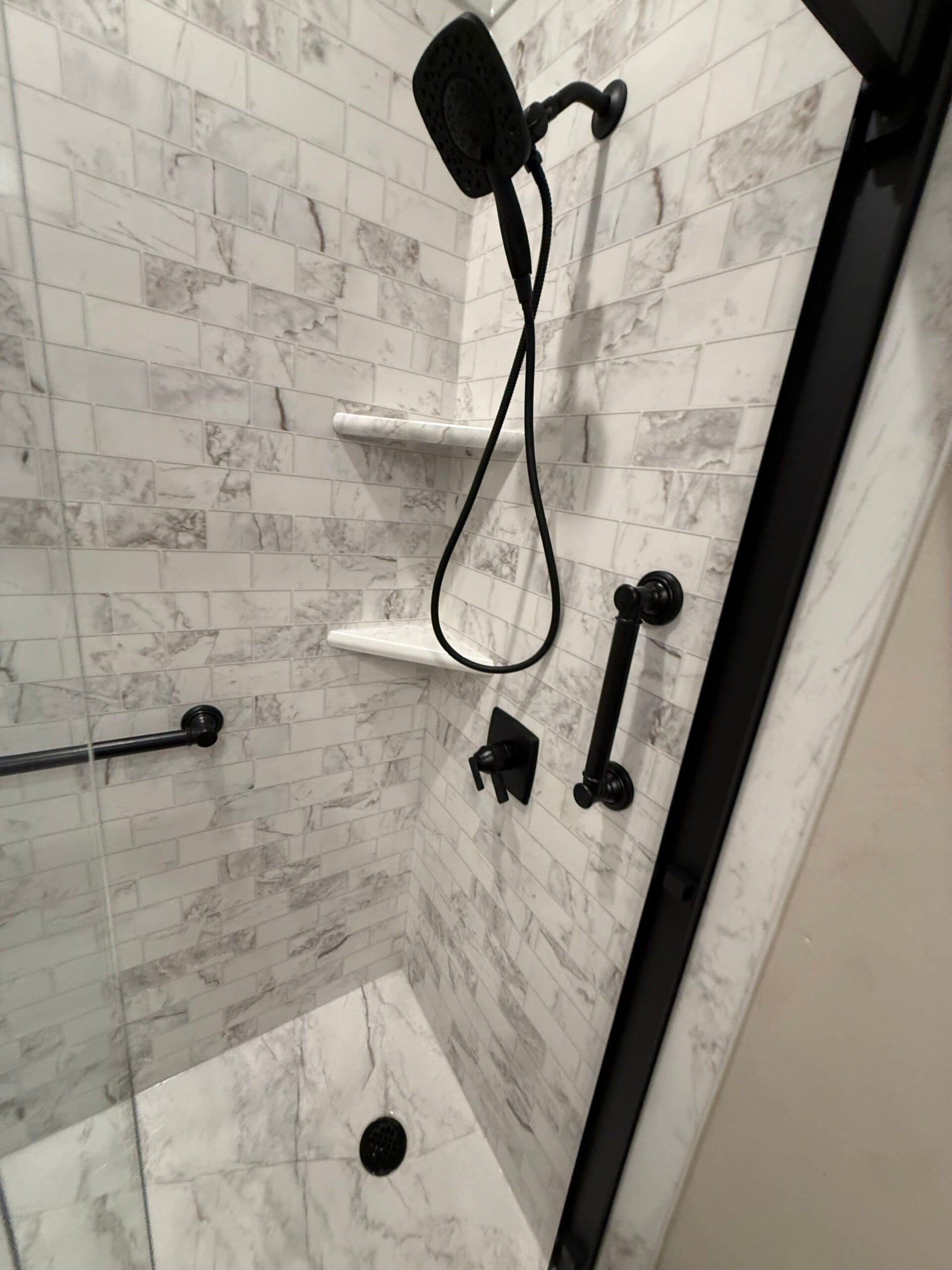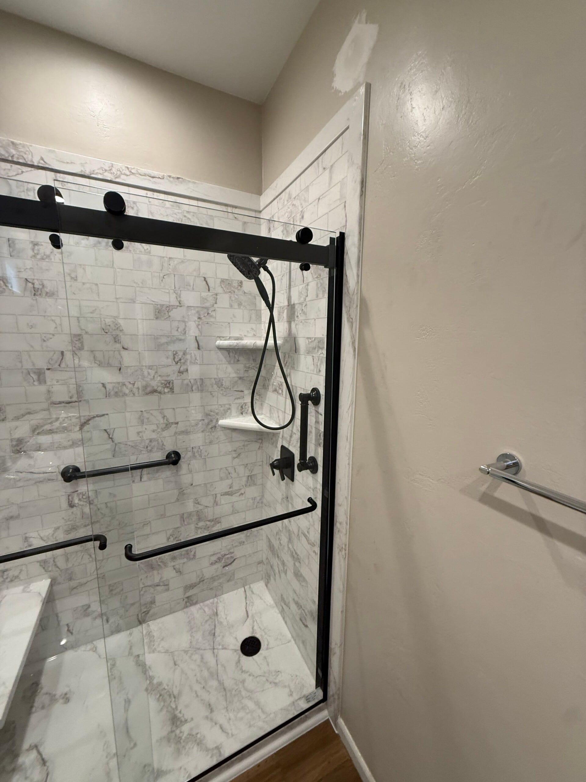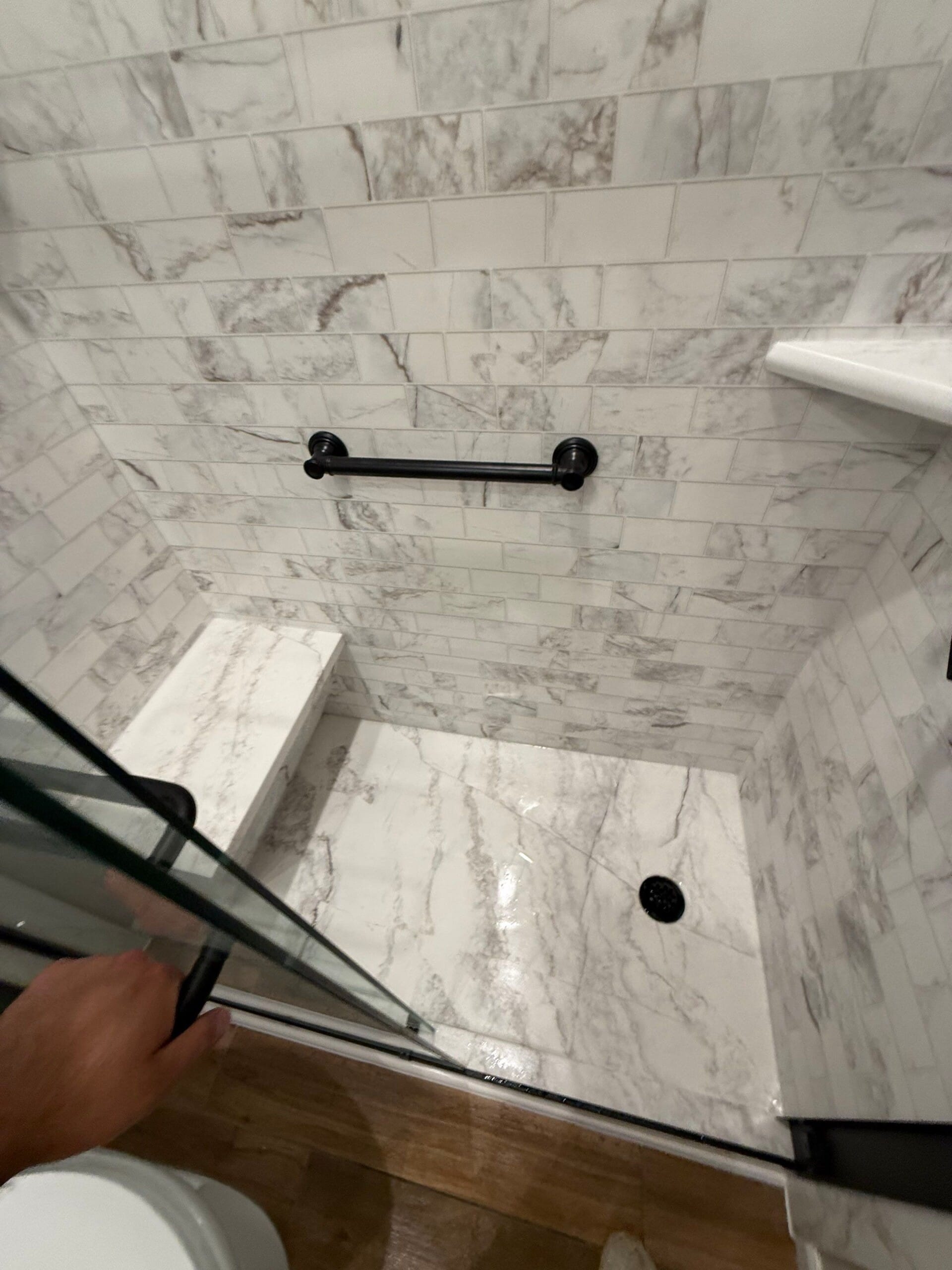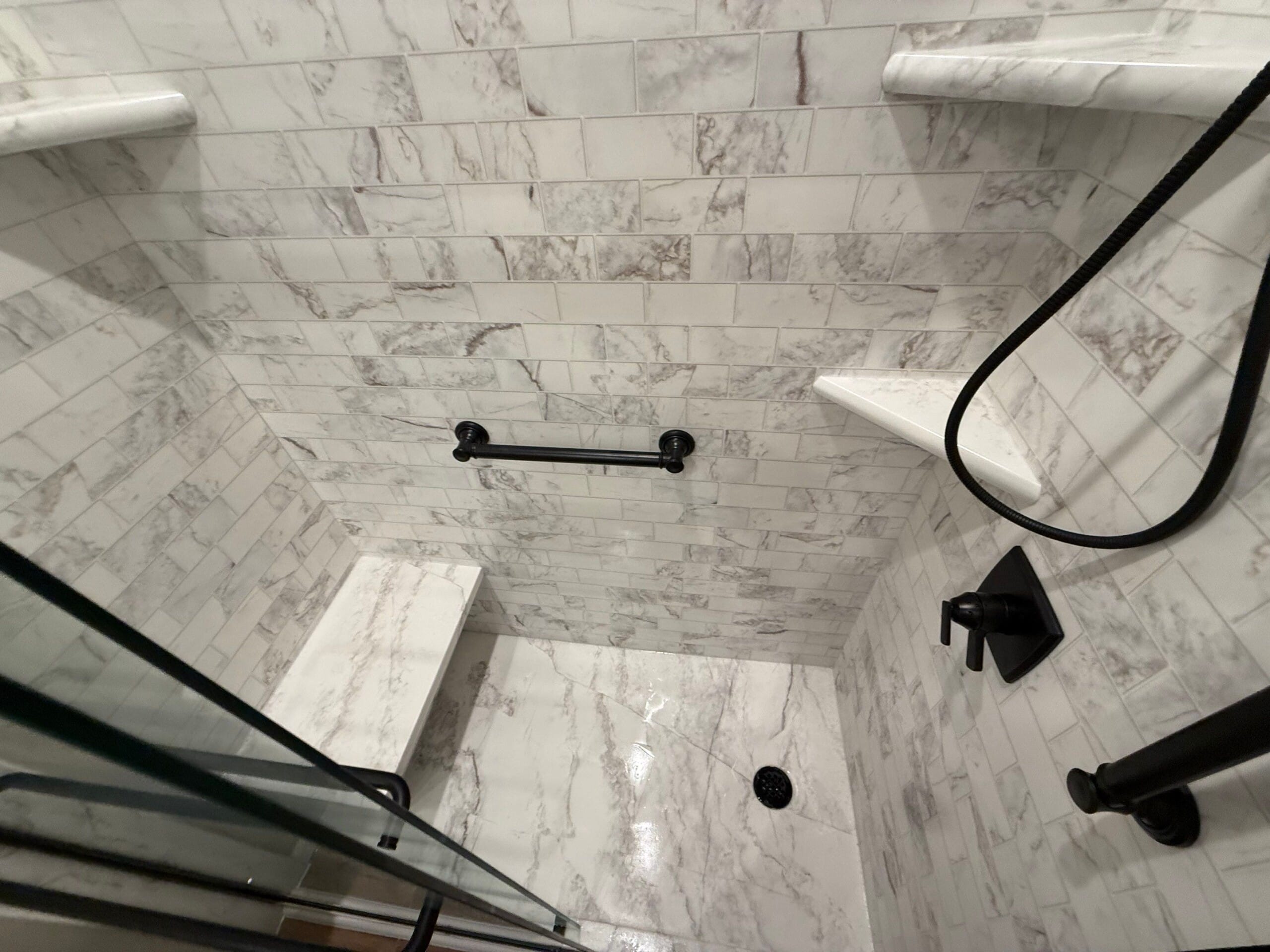 The remodeled space features full-height Calacatta-style wall panels in a matte finish with a marble pattern, paired with a low-profile composite base in a matching design. The shower includes black-framed sliding glass doors with top-roller hardware and matte black interior grab bars. A marble bench is installed along the rear wall for seated support, and three corner shelves are positioned at varying heights for accessible storage. The showerhead is matte black with a handheld attachment and wall-mounted diverter controls.