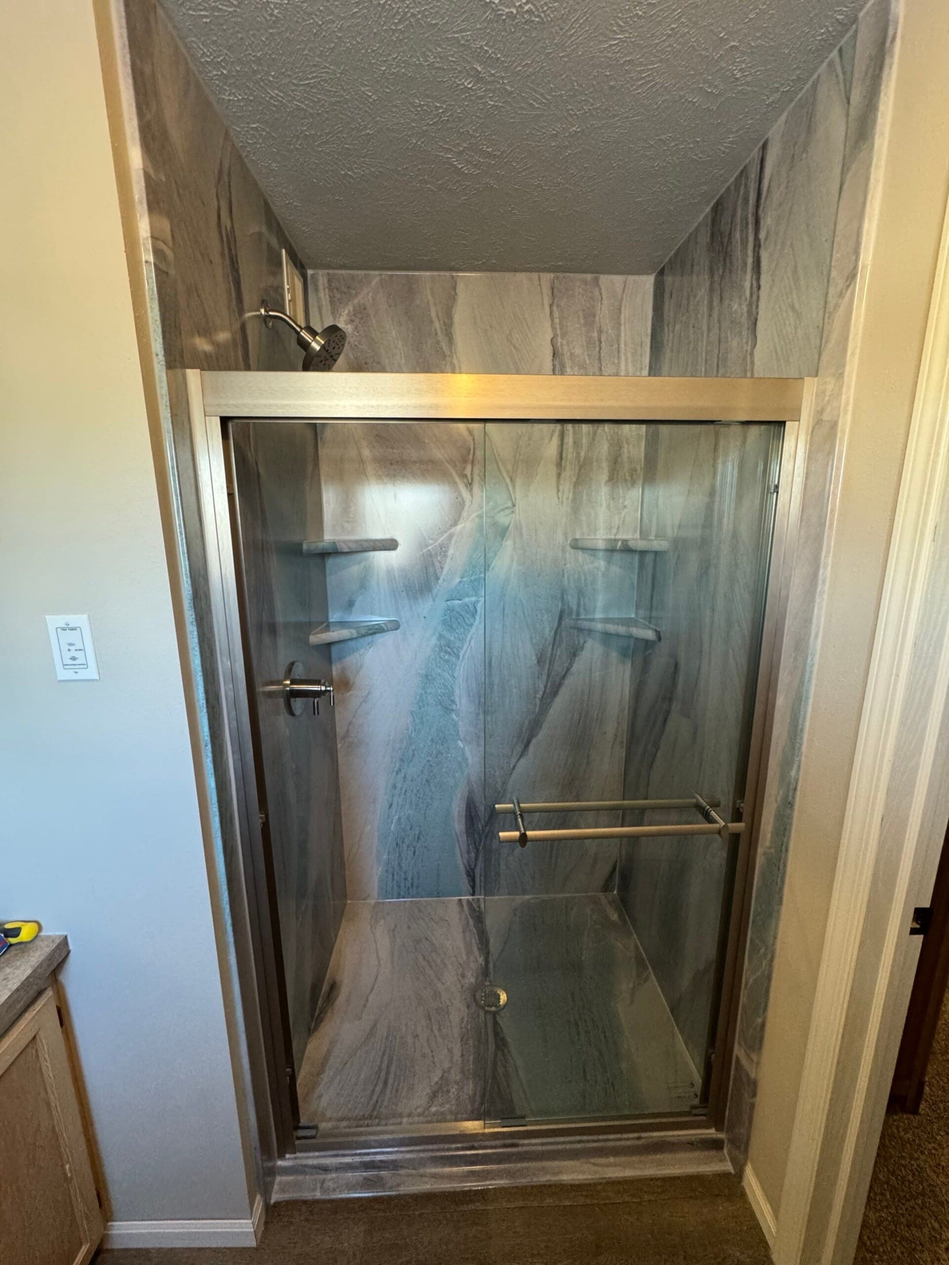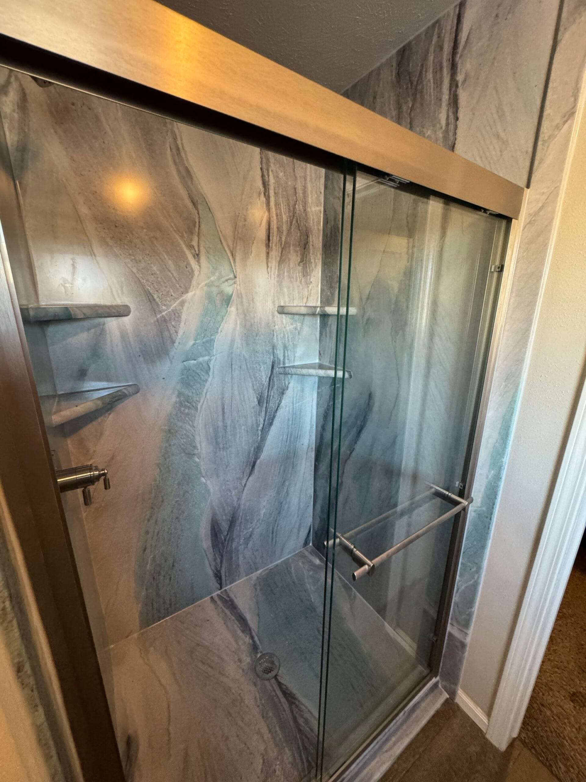 Five Star Bath Solutions presented the Smart Choice package featuring proprietary 3D-printed wall systems in the selected Azura Bay finish. The customer chose brushed nickel fixtures to match nearby elements and requested additional shelving and safety features. The final installation included four corner shelves, a framed sliding glass door system for stability and heat retention, and a NanoGrip low-profile base to improve traction. Brushed nickel grab bars were also incorporated to provide secure entry and exit support.