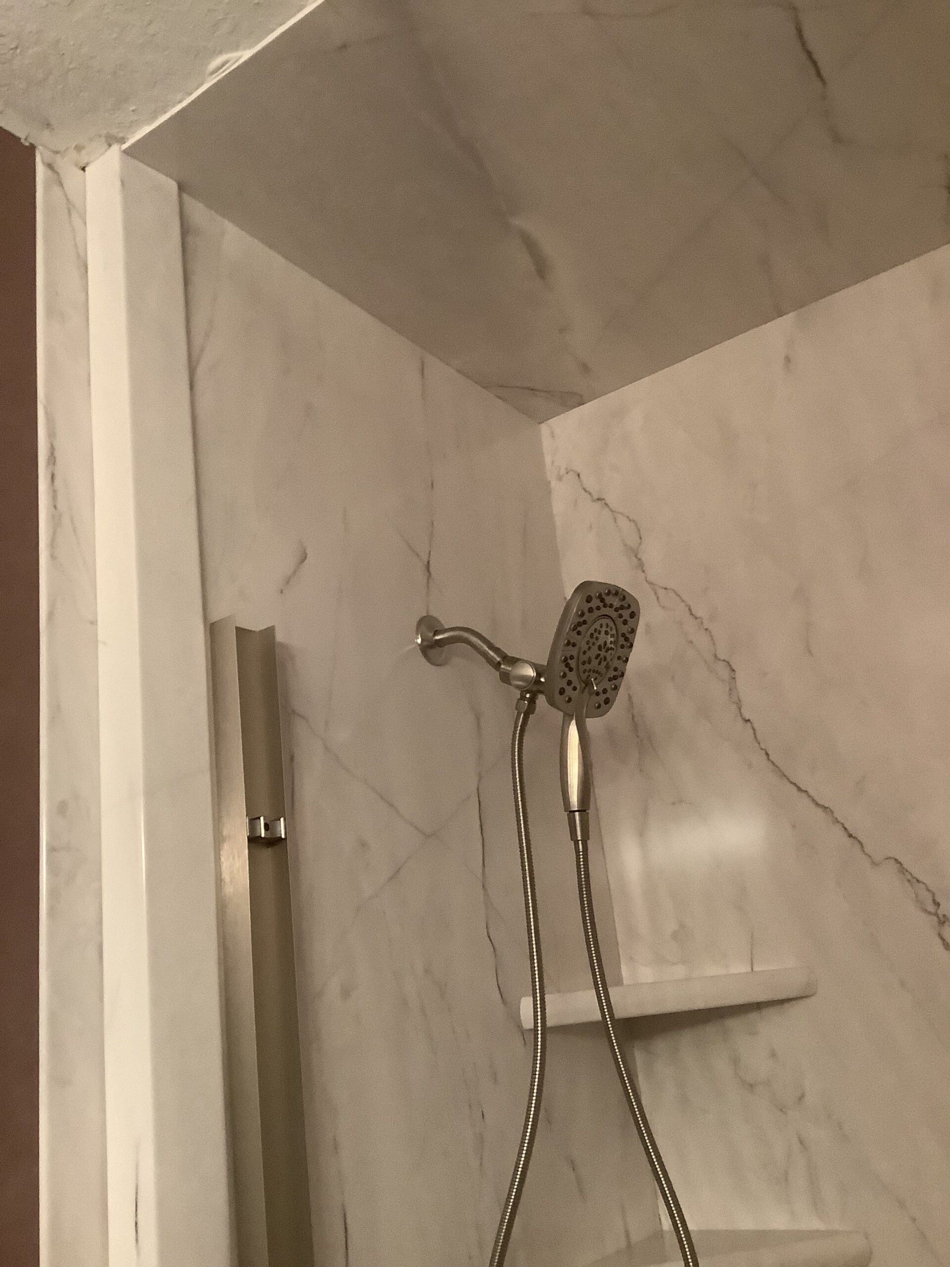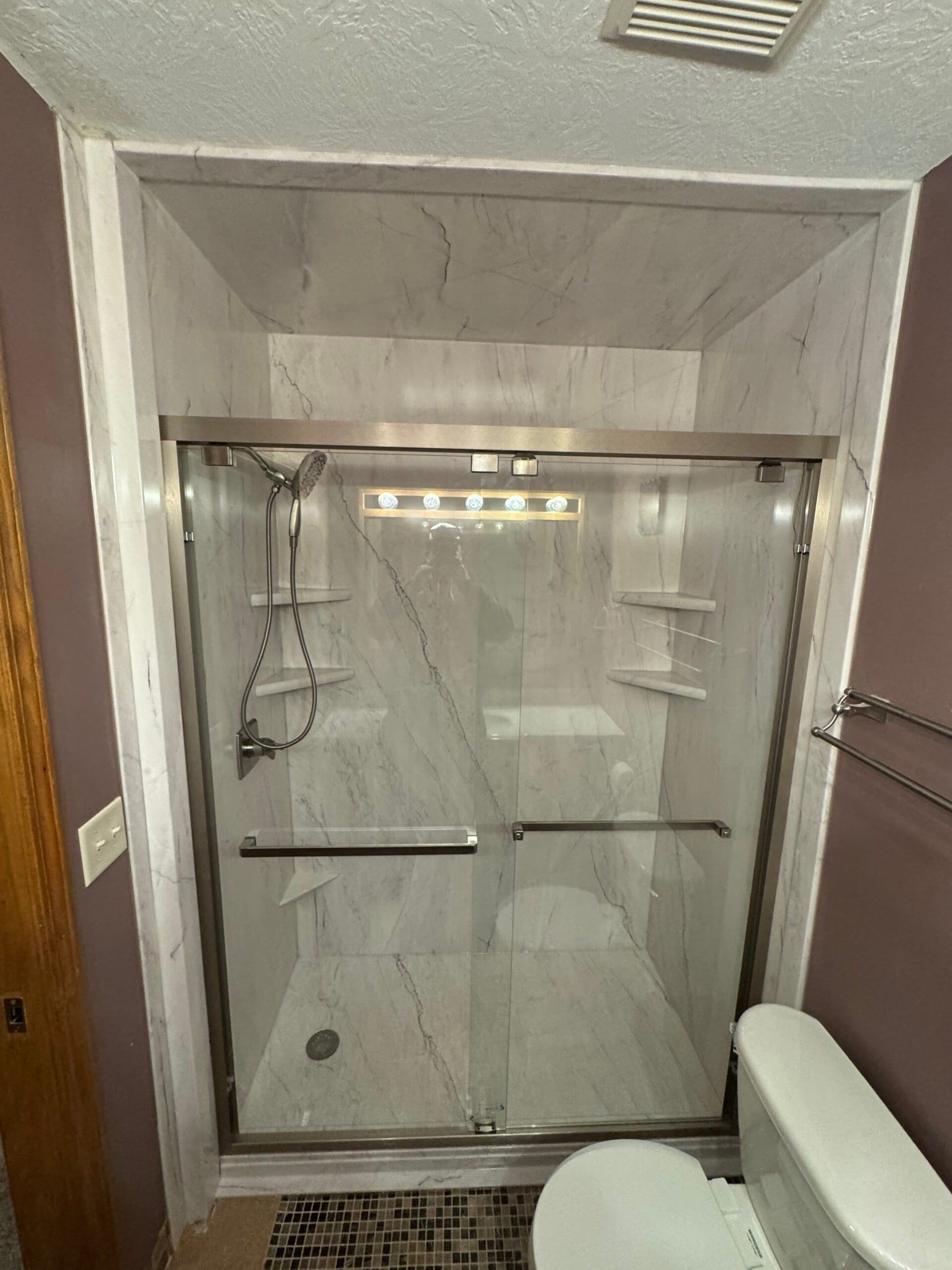The Five Star Bath Solutions team presented their Smart Choice package featuring Everest-colored, stone-look wall panels made with proprietary 3D-printed technology. Brushed nickel fixtures were selected to coordinate with existing bathroom elements. The new layout included dual corner shelves for storage and a secure sliding glass door enclosure to minimize water exposure and provide added support. A permanent seat and handheld shower system enhanced usability for seated bathing. The NanoGrip textured shower base was chosen to reduce fall risk with a slip-resistant surface.
