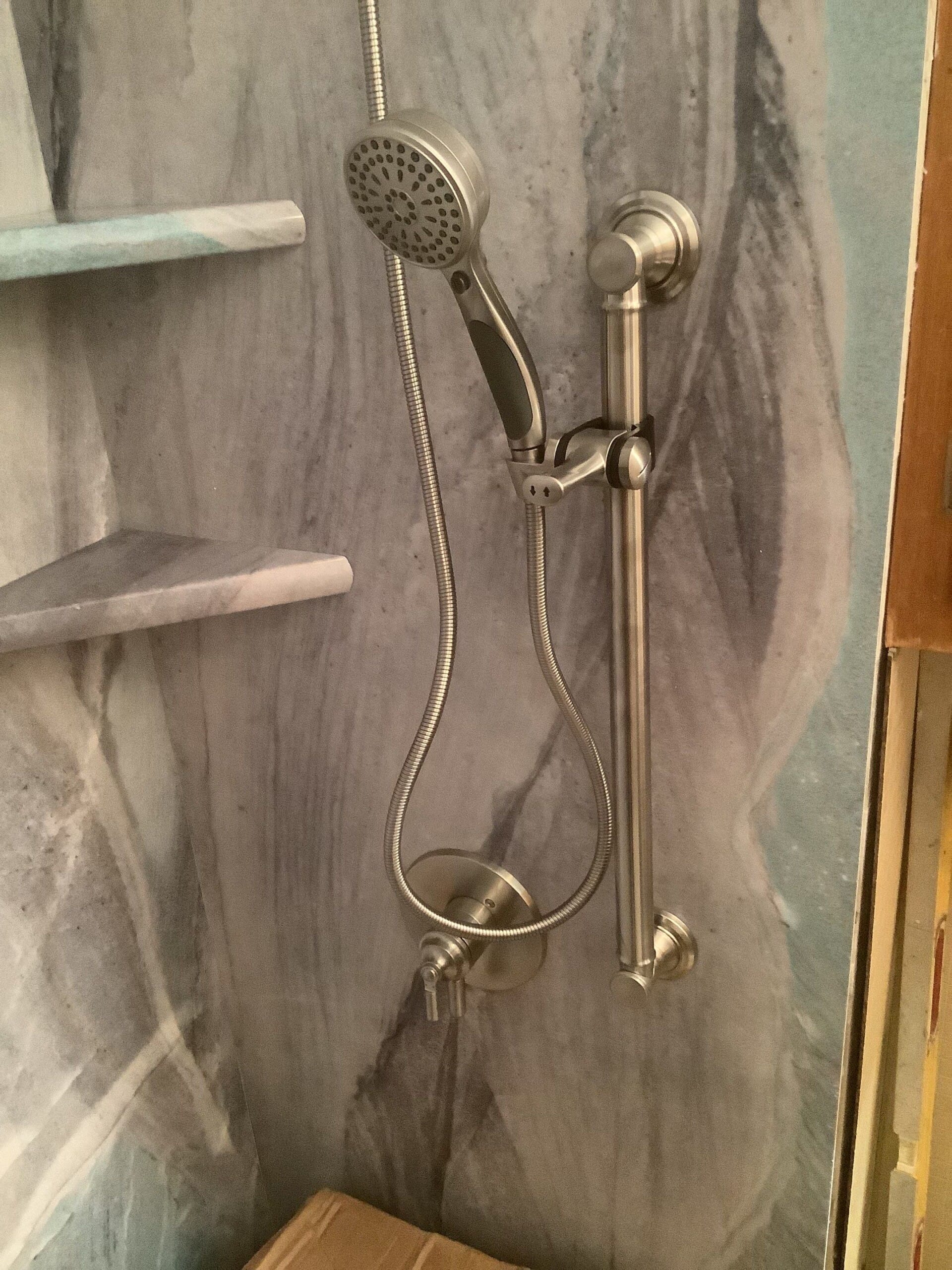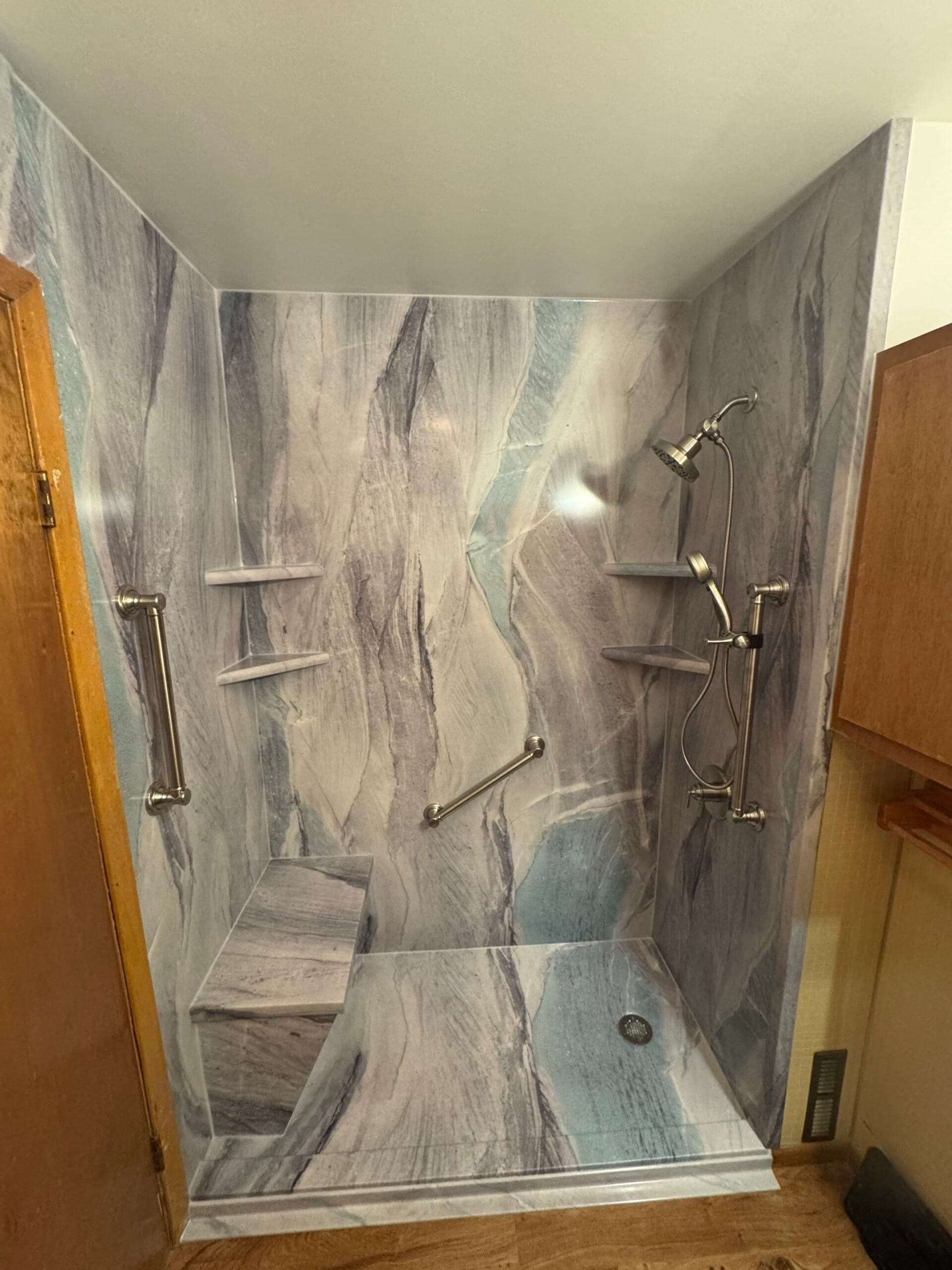 Installation was completed by a dedicated in-house crew with no subcontractors. The entire area was fully demolished down to the studs, then rebuilt with non-porous, grout-free materials. The installation included wall panels, new base, fixtures, hardware, and safety features. The project was completed in under two days, with the site cleaned and cleared the same day, requiring no exterior debris bins. All service was performed by experienced W-2 technicians, ensuring consistent workmanship.