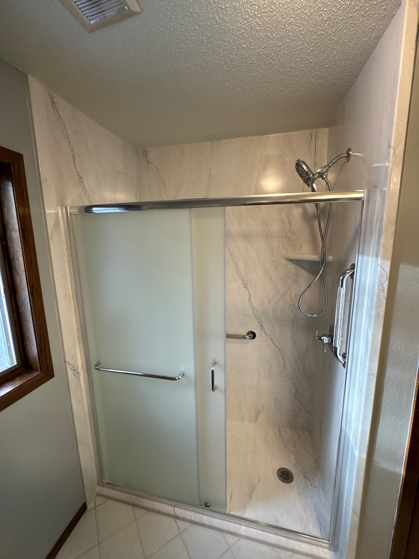 The installation process included full removal of the existing tub and surround down to the studs to ensure structural integrity. Plumbing was updated as needed before installation of the new waterproof shower system. In-wall reinforcement was added for secure grab bar placement. The shower base, wall panels, trim, glass enclosure, and fixtures were installed by certified in-house professionals. The project was completed in one day, with floor protection, debris removal, and final cleanup handled by the installation team.
