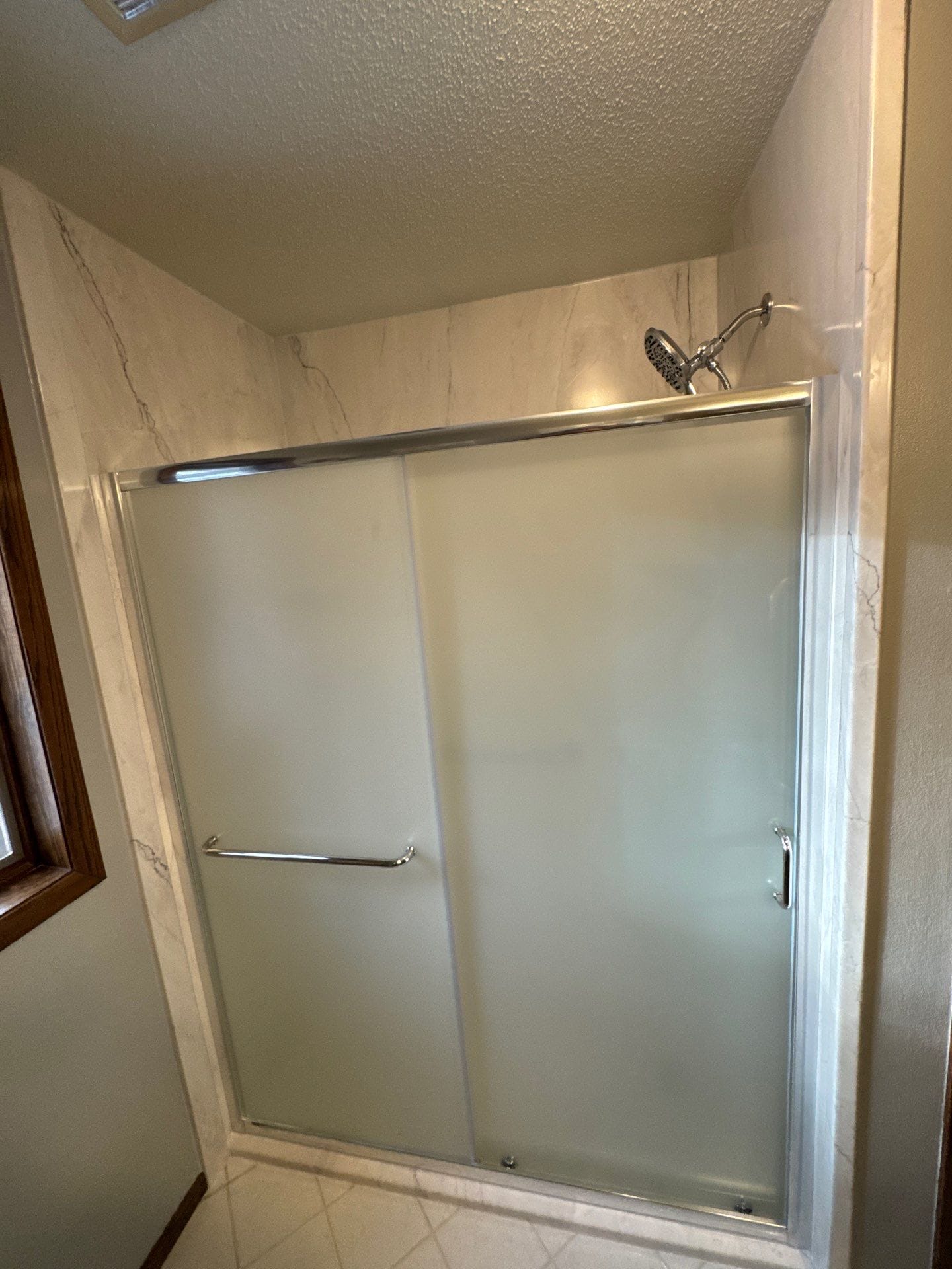 * Barn-style sliding chrome door with rain-textured glass
