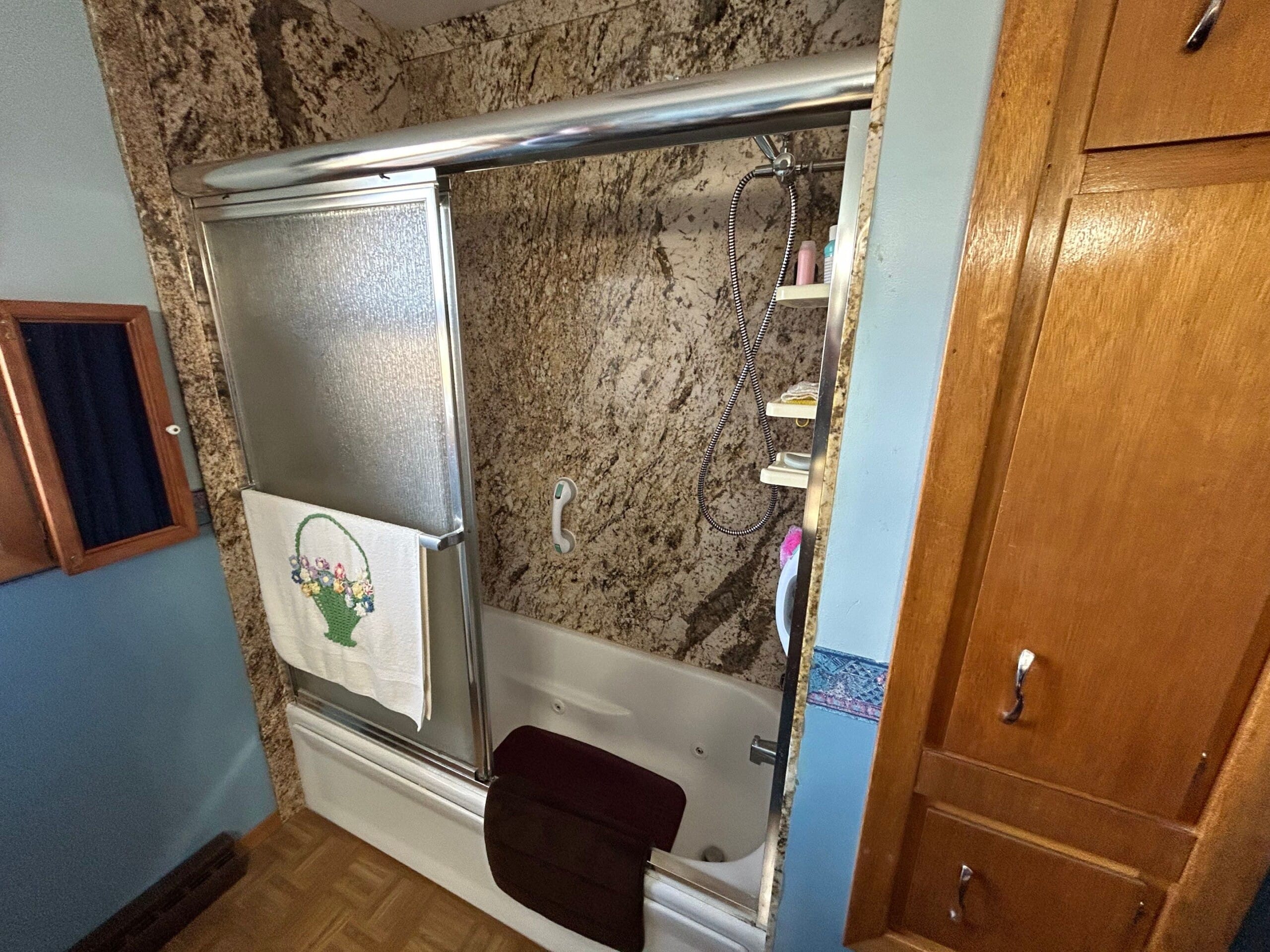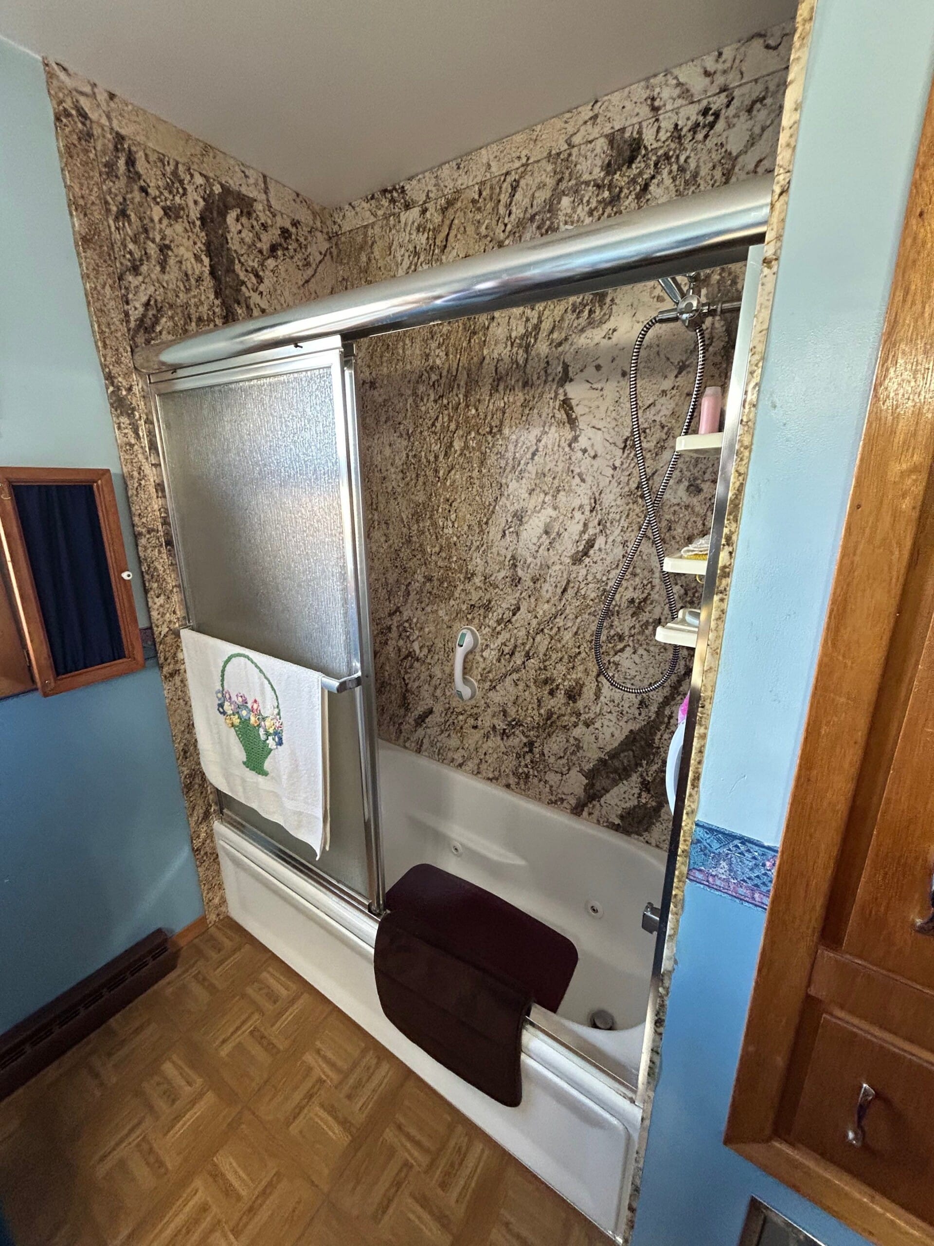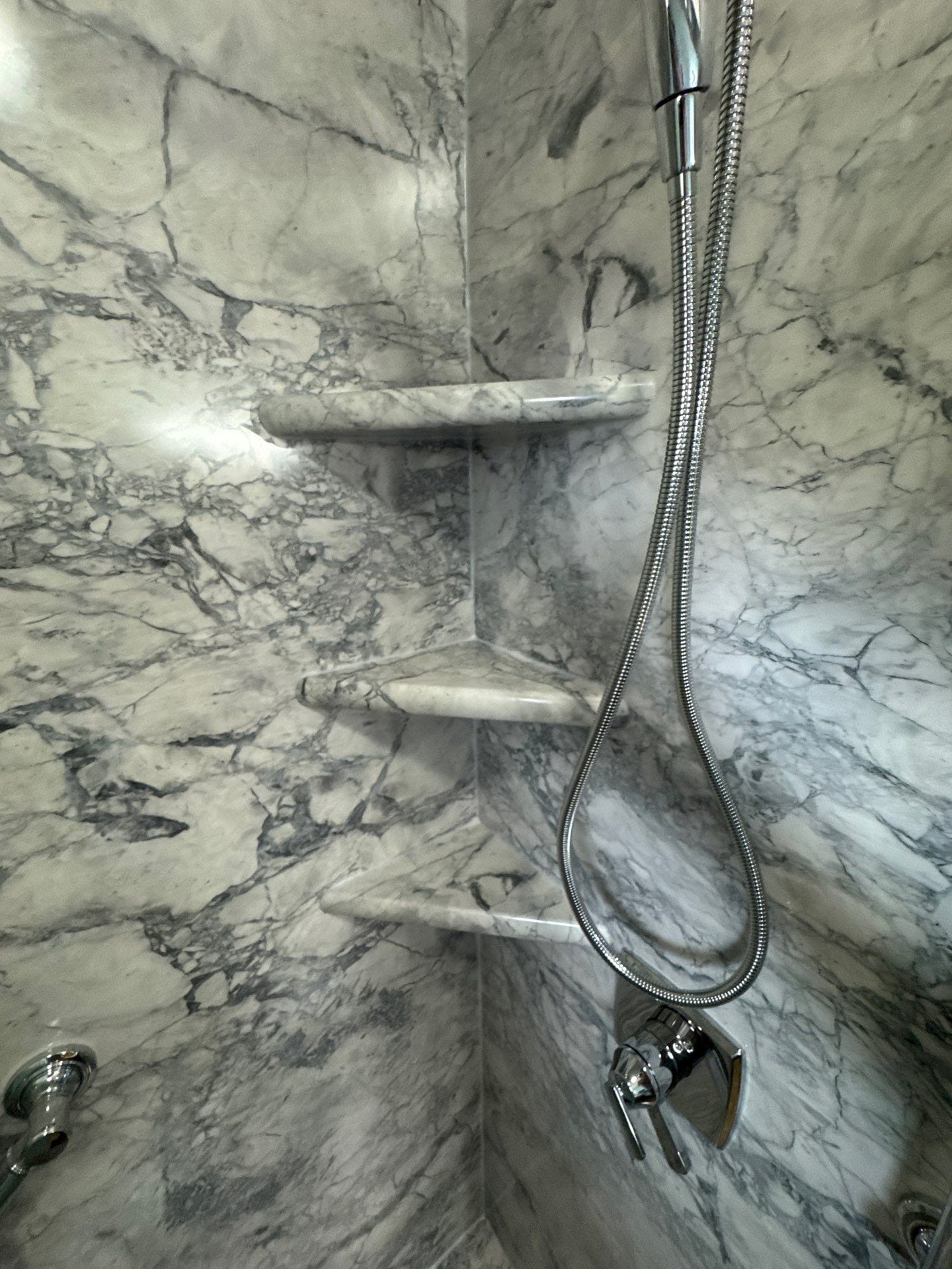 Installation included full demolition down to the studs, removal of the existing tub and wall materials, and plumbing updates to meet current code standards. HydroBlock backing material was installed prior to placement of the custom-fit wall system. Structural reinforcement was added to support grab bars and seating. The shower base, wall panels, shelving, seat, fixtures, and sliding enclosure were installed by certified in-house professionals. The project was completed in one day once materials were ready, with floor protection, debris removal, and final cleanup handled by the installation team.