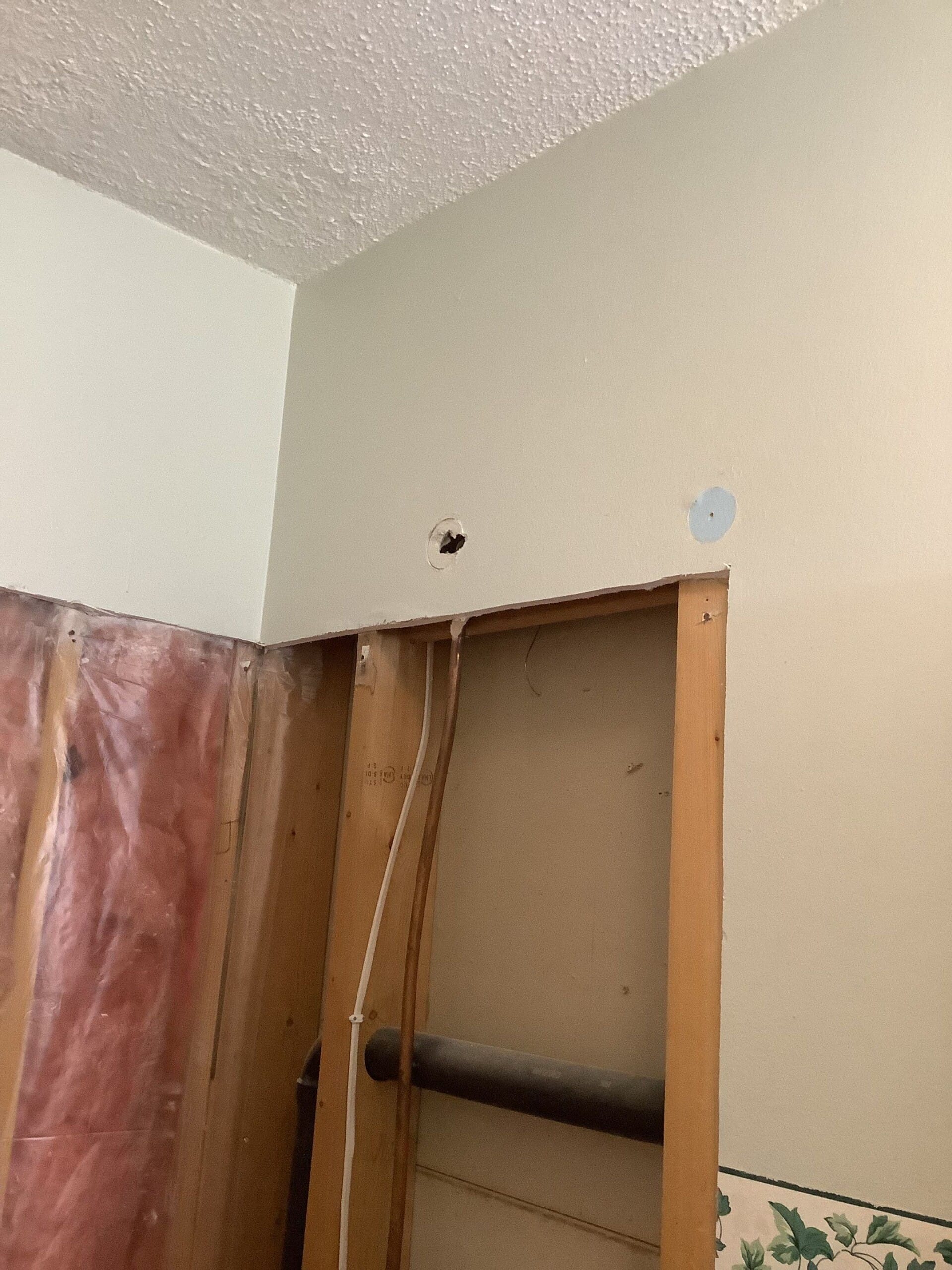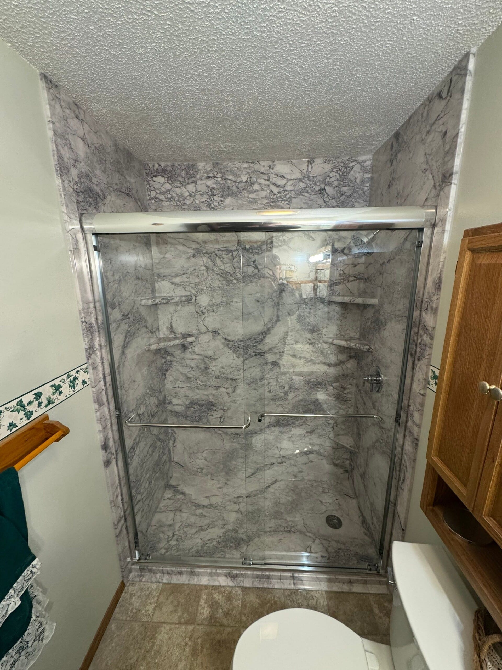 The original alcove featured a molded fiberglass surround with an integrated tub and a single chrome control valve, enclosed by a tension rod and floral curtain. The upgraded space was fully reconfigured with a floor-to-ceiling walk-in shower, enclosed by a sliding barn-style glass door with chrome towel bar handles. A low-threshold composite base with a safety nanogrip surface replaced the tub, improving accessibility. Surround panels in a bold gray-veined marble finish extended fully to the ceiling, blending well with the original paint and trim. Built-in shelving and corner-integrated ledges were installed for storage, providing a cleaner and more permanent alternative to wire caddies. The planned fold-down seat was not visible post-install, indicating it may have been excluded or delayed.