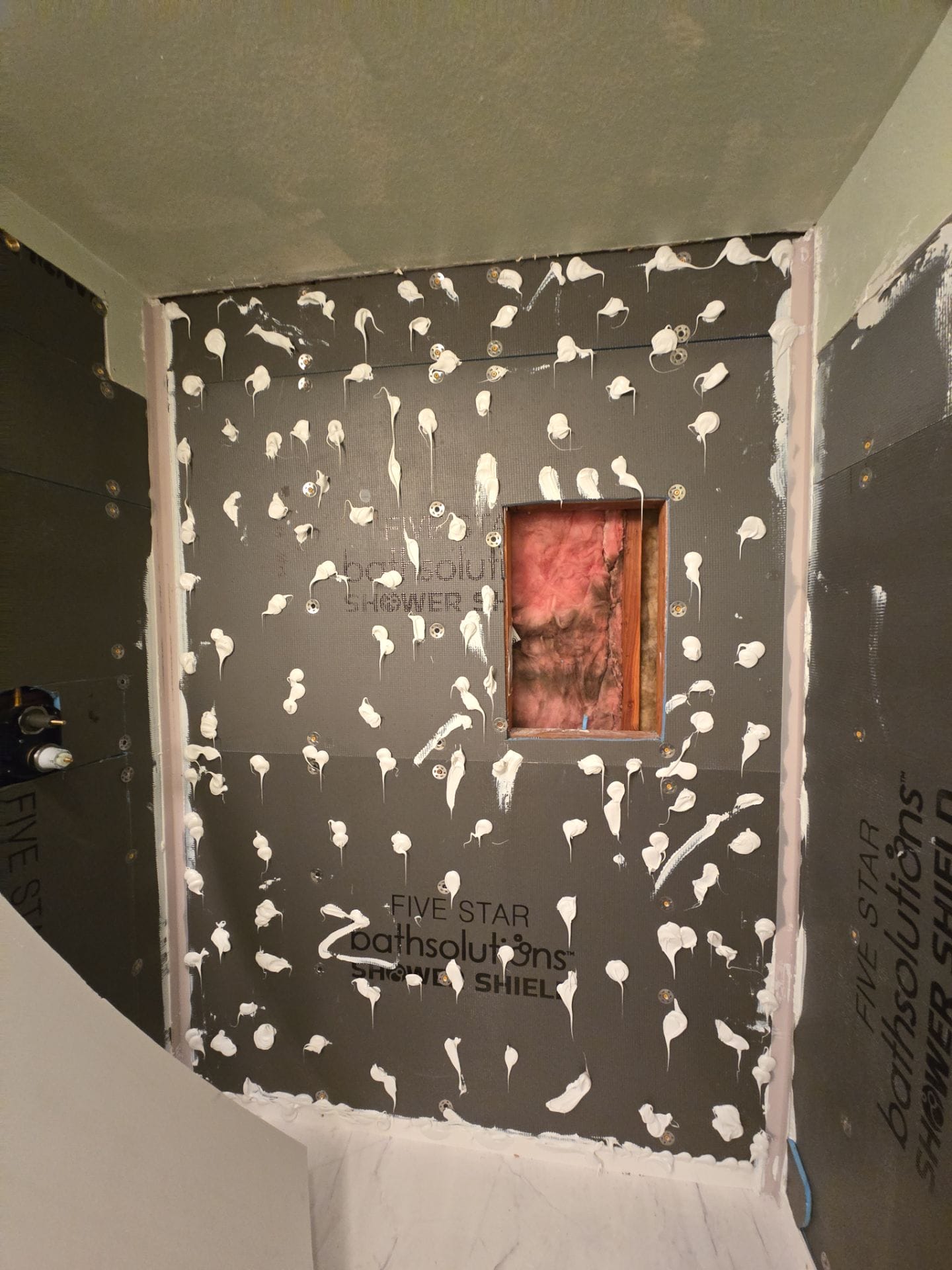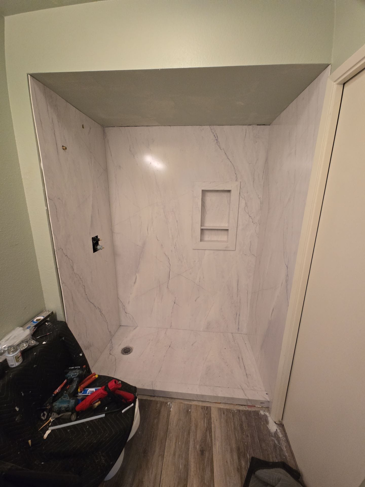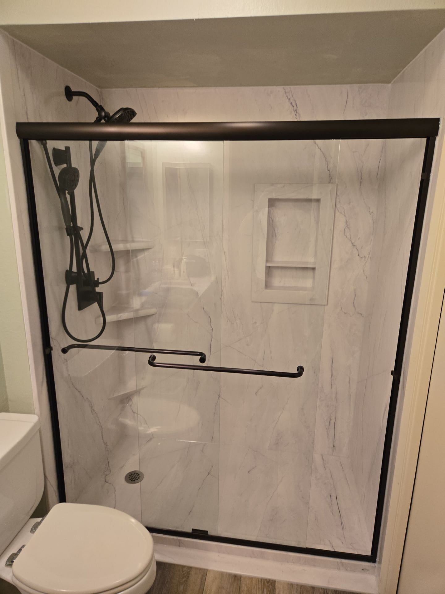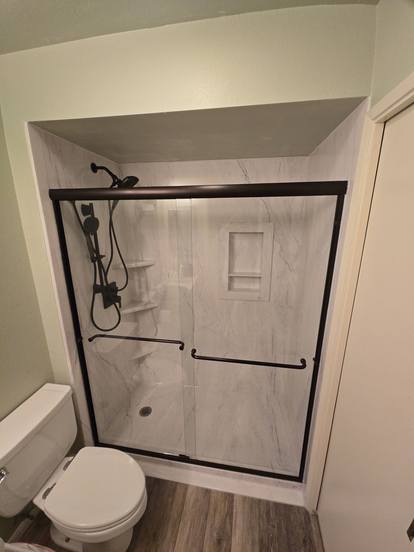 The installation involved complete removal of the old enclosure and underlayment, with moisture barrier and backer upgrades. The new shower included upgraded plumbing connections and was sealed with a waterproof system. While originally discussed as a curtain-accessible shower, the final installation used a sliding glass enclosure and retained a standard configuration for shower entry. The work appears to have been completed cleanly and professionally within a typical two to three-day window.