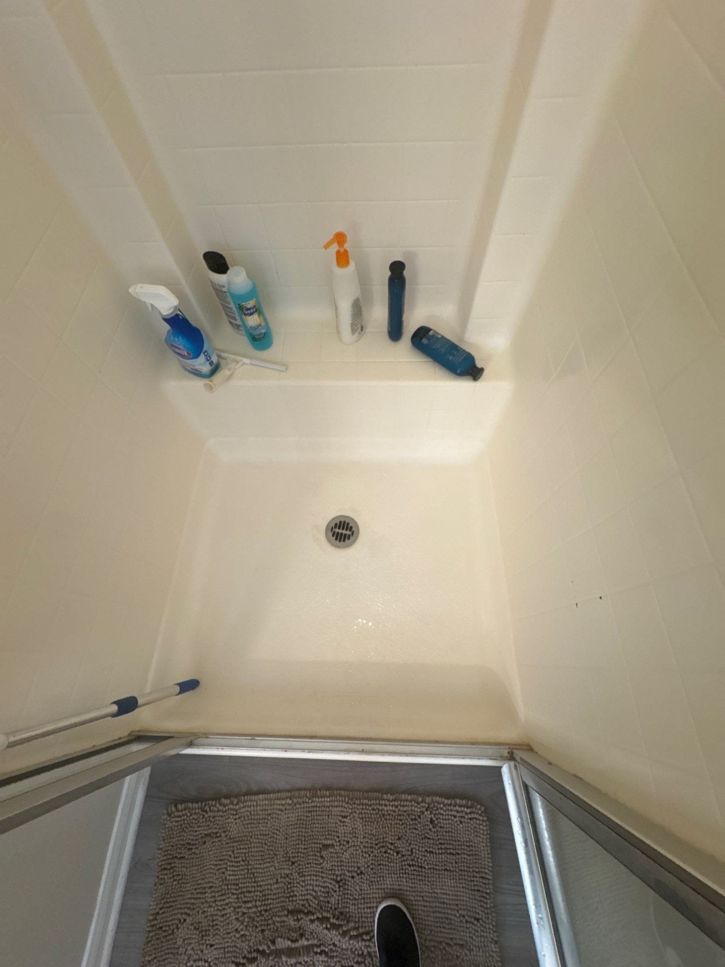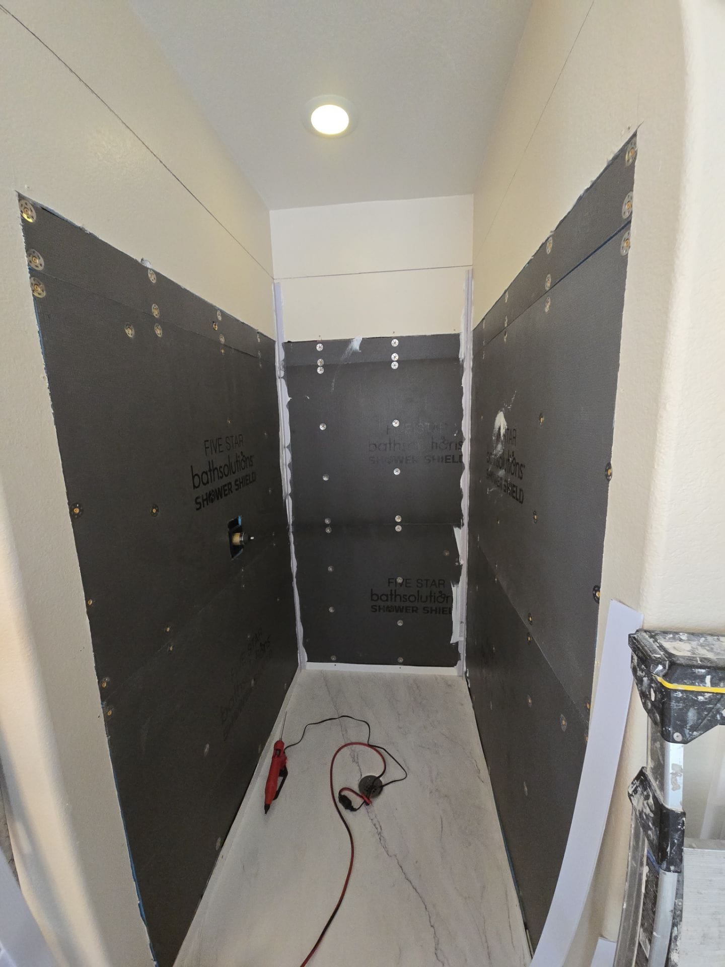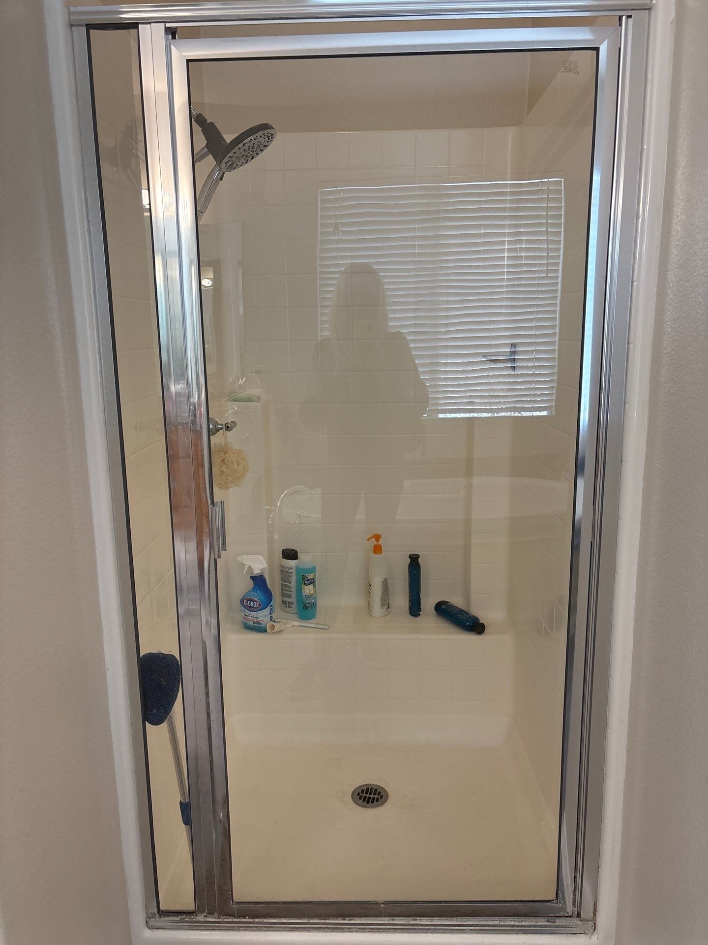 Installation, as explained by Joey, involved complete removal of the old unit down to the studs, repairs to any moisture-exposed framing, and installation of new plumbing, backer board, and composite panels. The updated system maintained the original enclosure size while replacing the framed door with a clear, frameless glass door for better access and visibility. Existing flooring and wall finishes were protected and preserved throughout the process.