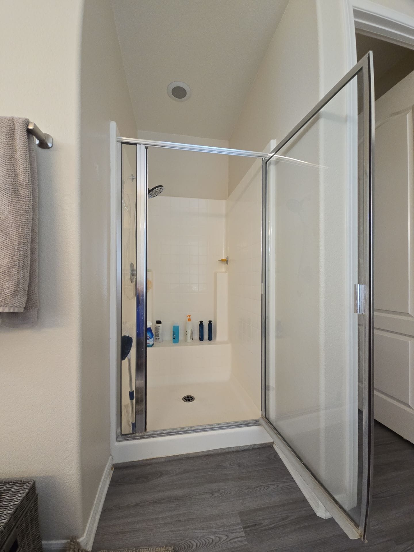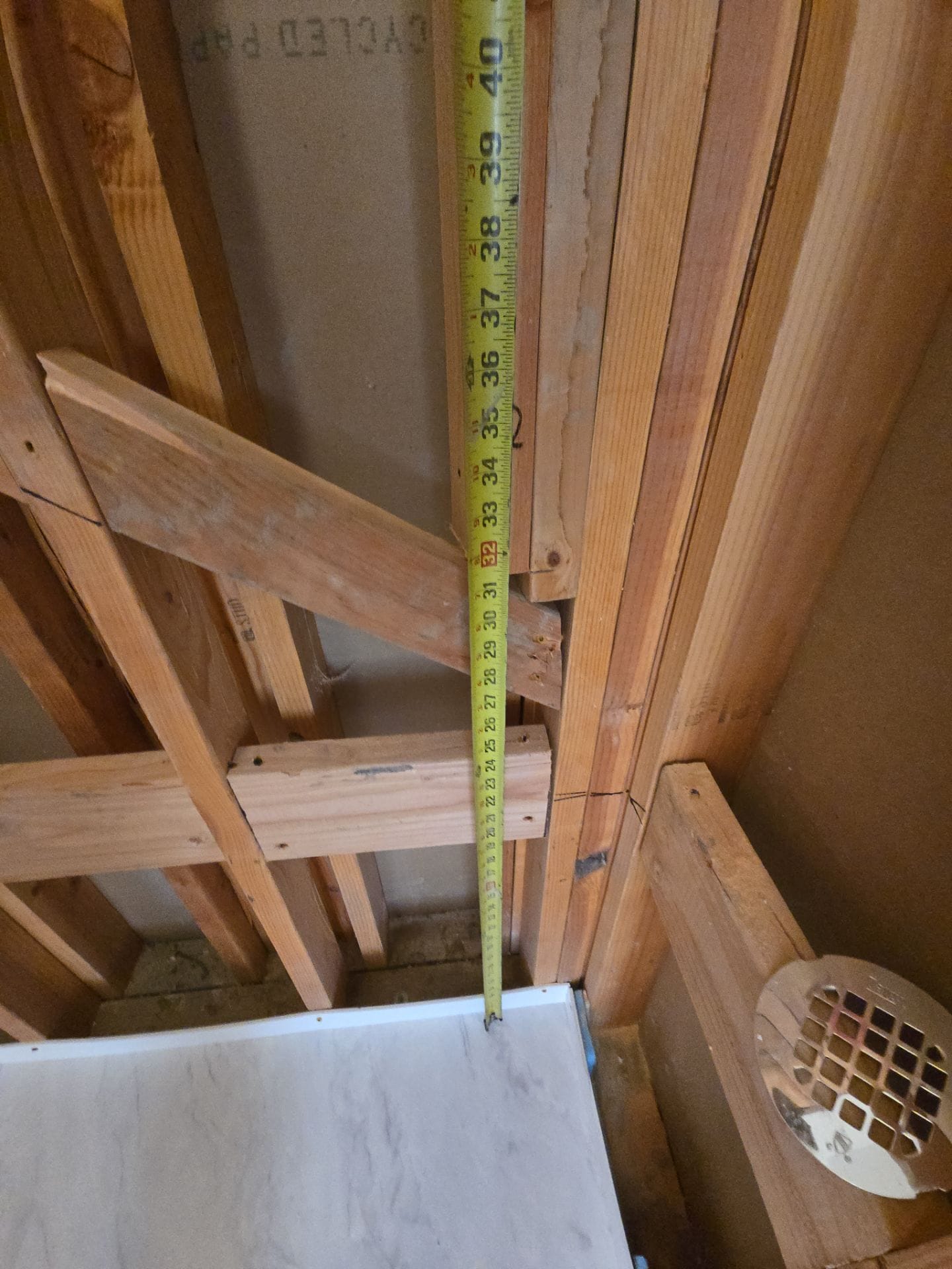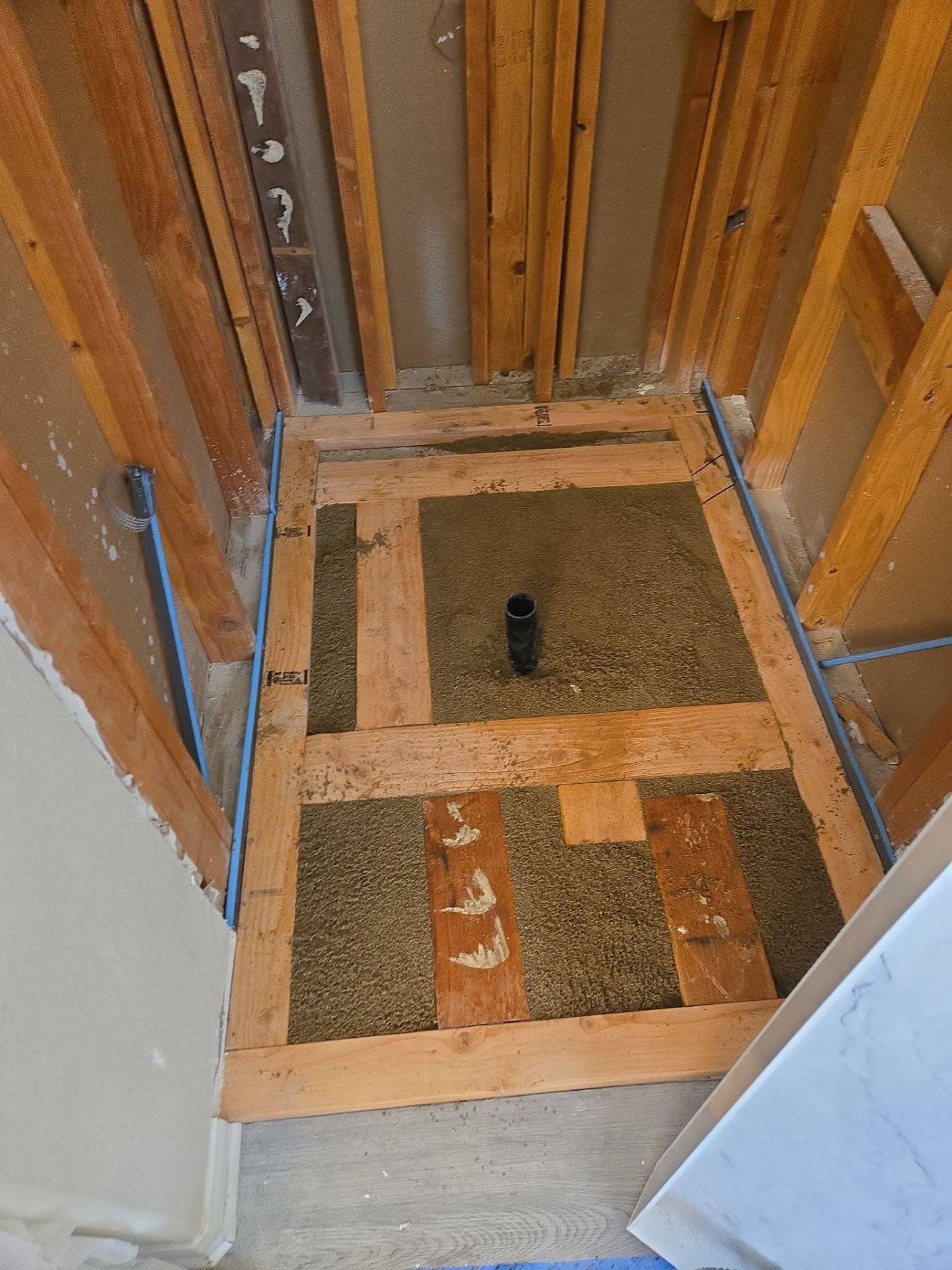 Installation, as explained by Joey, involved complete removal of the old unit down to the studs, repairs to any moisture-exposed framing, and installation of new plumbing, backer board, and composite panels. The updated system maintained the original enclosure size while replacing the framed door with a clear, frameless glass door for better access and visibility. Existing flooring and wall finishes were protected and preserved throughout the process.