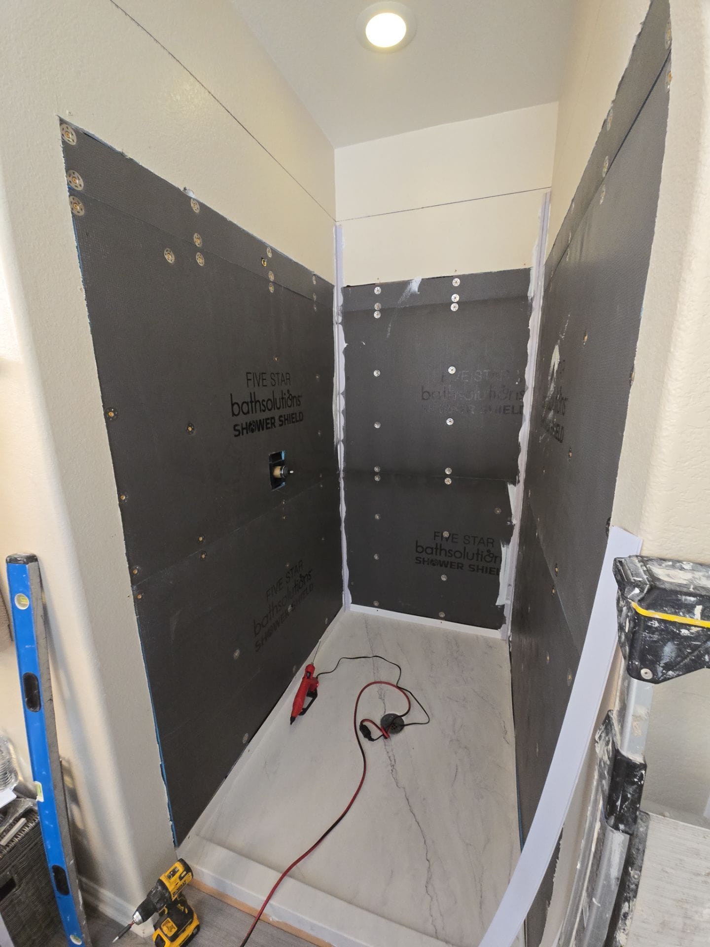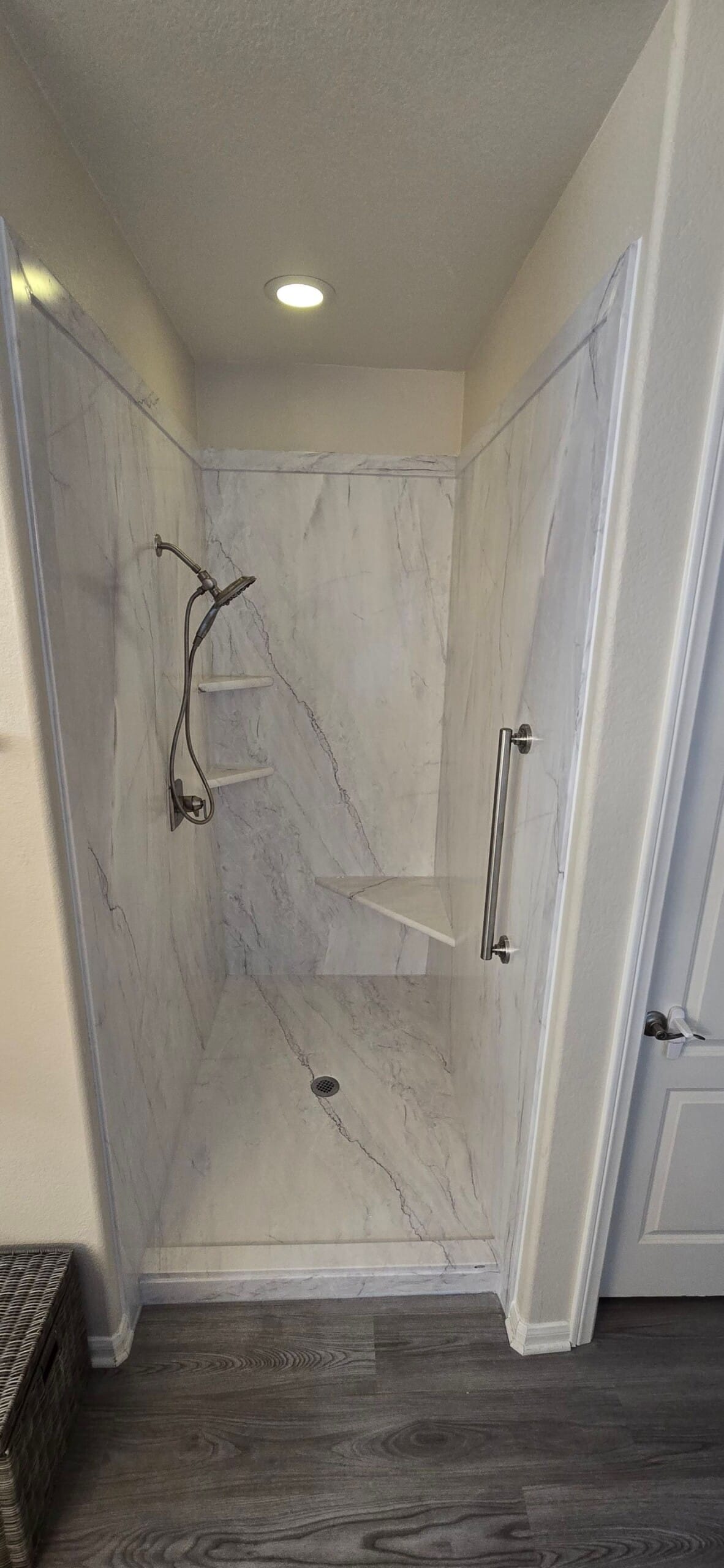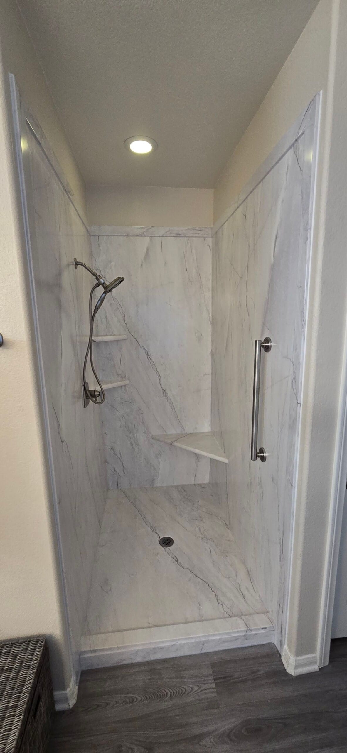 Joey LeBlanc, the Five Star Bath Solutions representative, presented four system options: standard fiberglass, performance acrylic, Smart Choice composite, and premium stone. Joey recommended the Smart Choice system, highlighting its non-porous, grout-free surface that resists mold, mildew, and discoloration. The upgrade included waterproof backer board and marine-grade silicone for long-term leak prevention. Customer selected brushed nickel hardware, a handheld showerhead, a built-in bench, and two recessed corner shelves. A grab bar was added for safety and reinforced with secure backing.