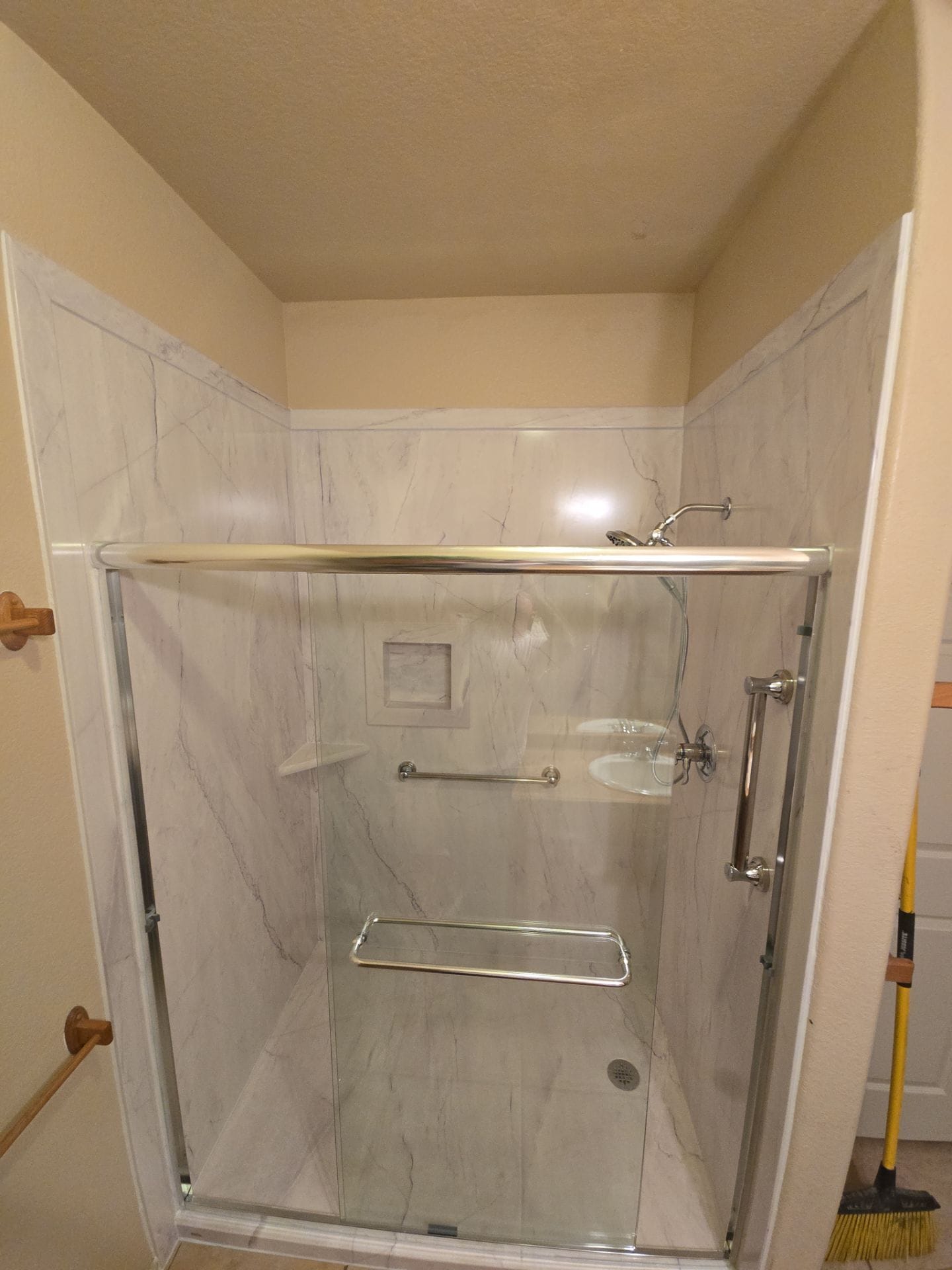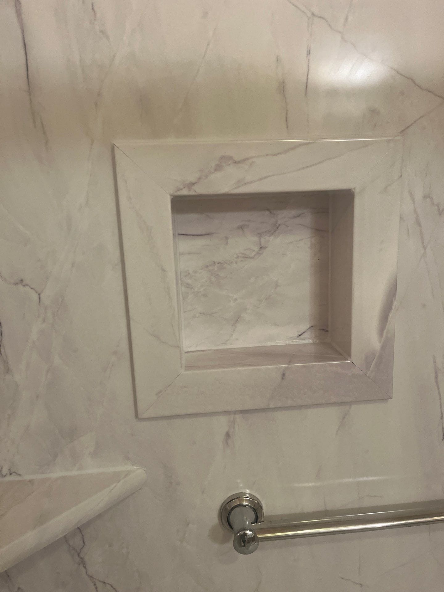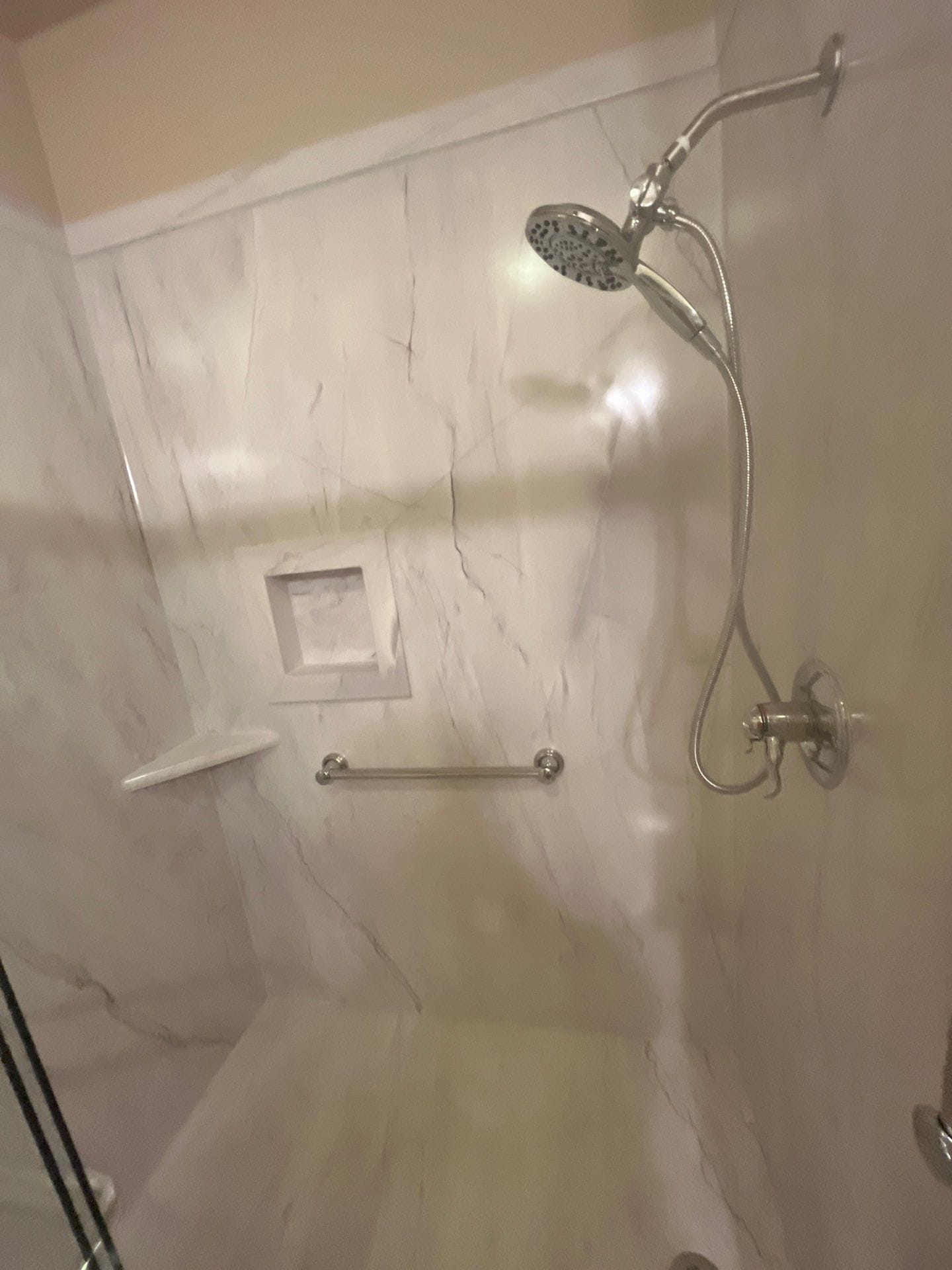 Tabitha Lambert presented the Smart Choice package, highlighting its antimicrobial, six-layer composite wall system. The customer selected a white and gray marble-style finish, which offers visual depth while complementing the existing tan wall and tile tones. A brushed nickel grab bar was installed horizontally along the main wall for added stability, and a built-in wall niche was recessed for daily essentials. A corner shelf was added for additional storage. Fixtures included a brushed nickel handheld showerhead with adjustable slide-bar mounting, and the final enclosure used a sliding frameless glass door for water control and accessibility.