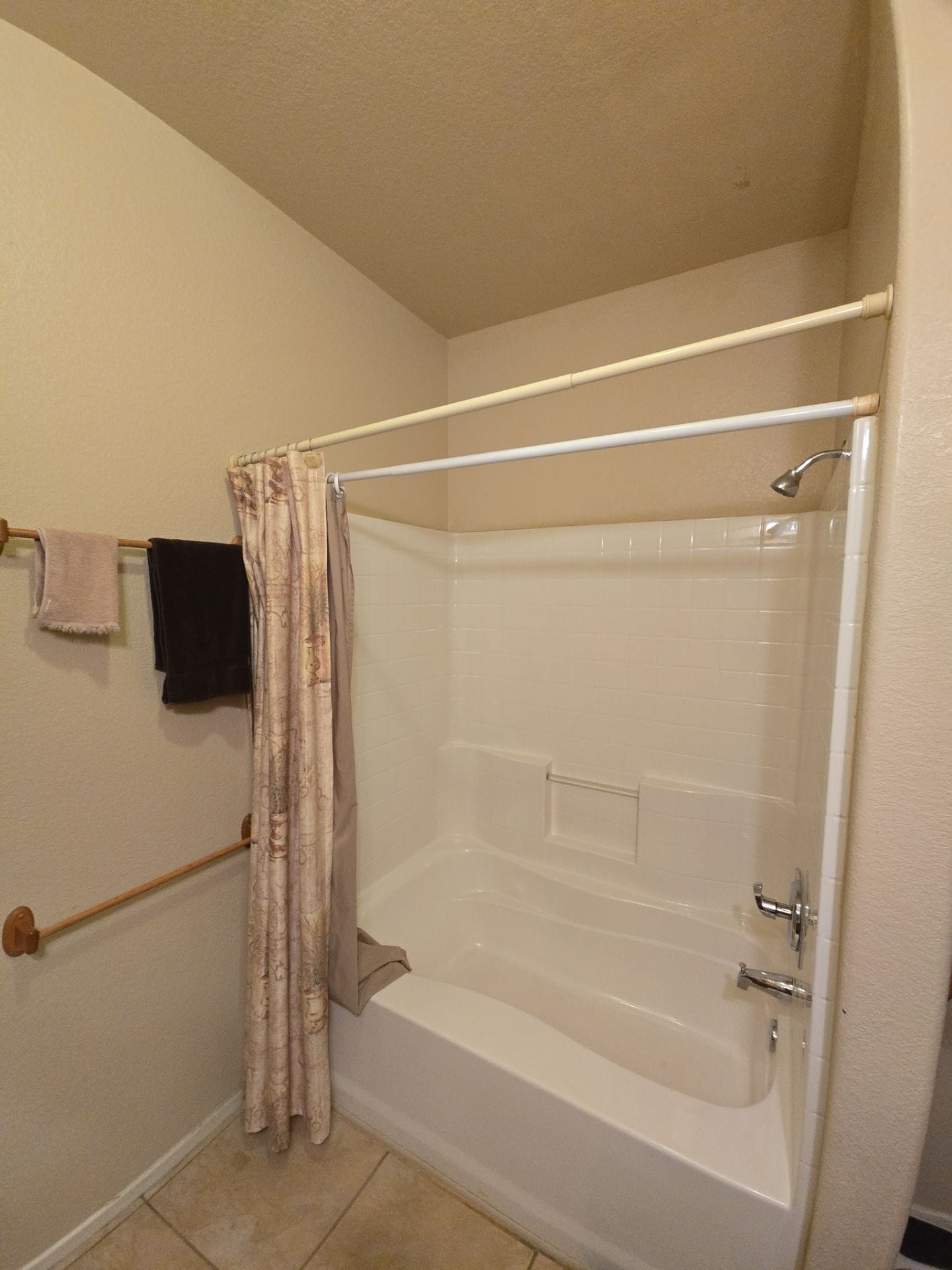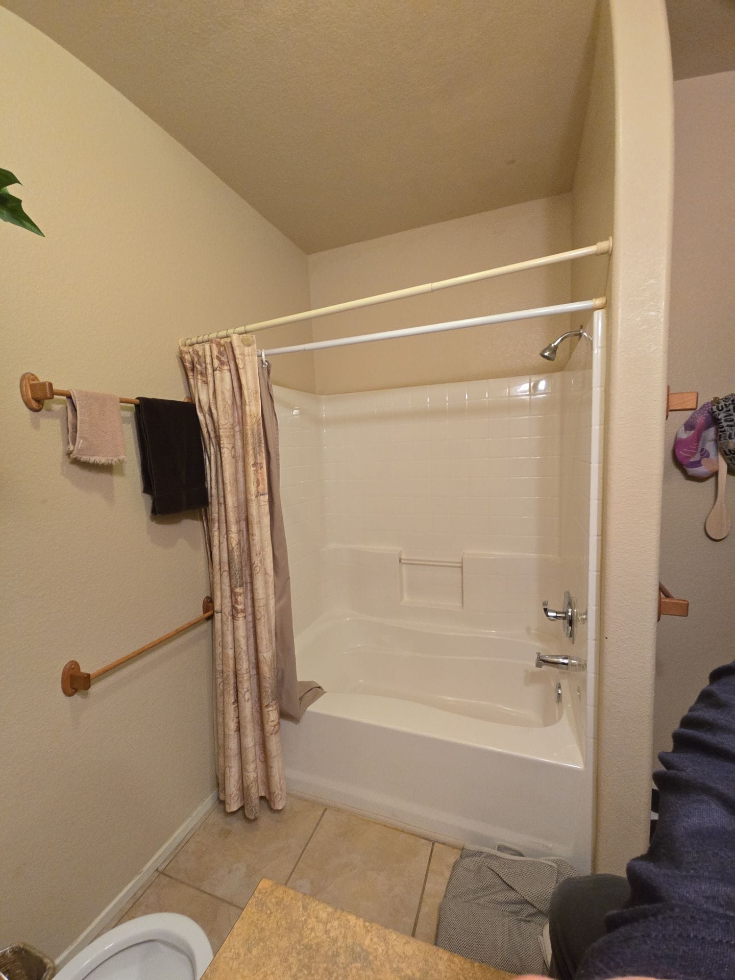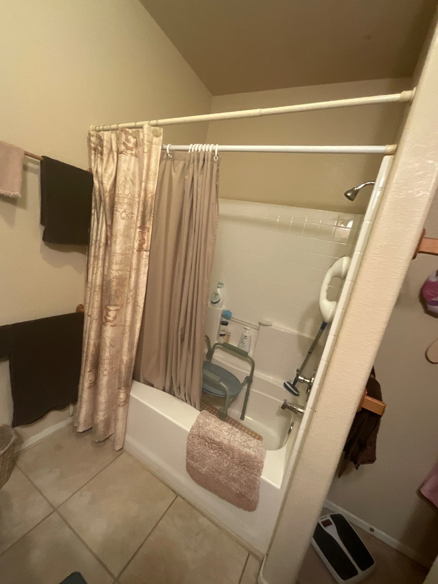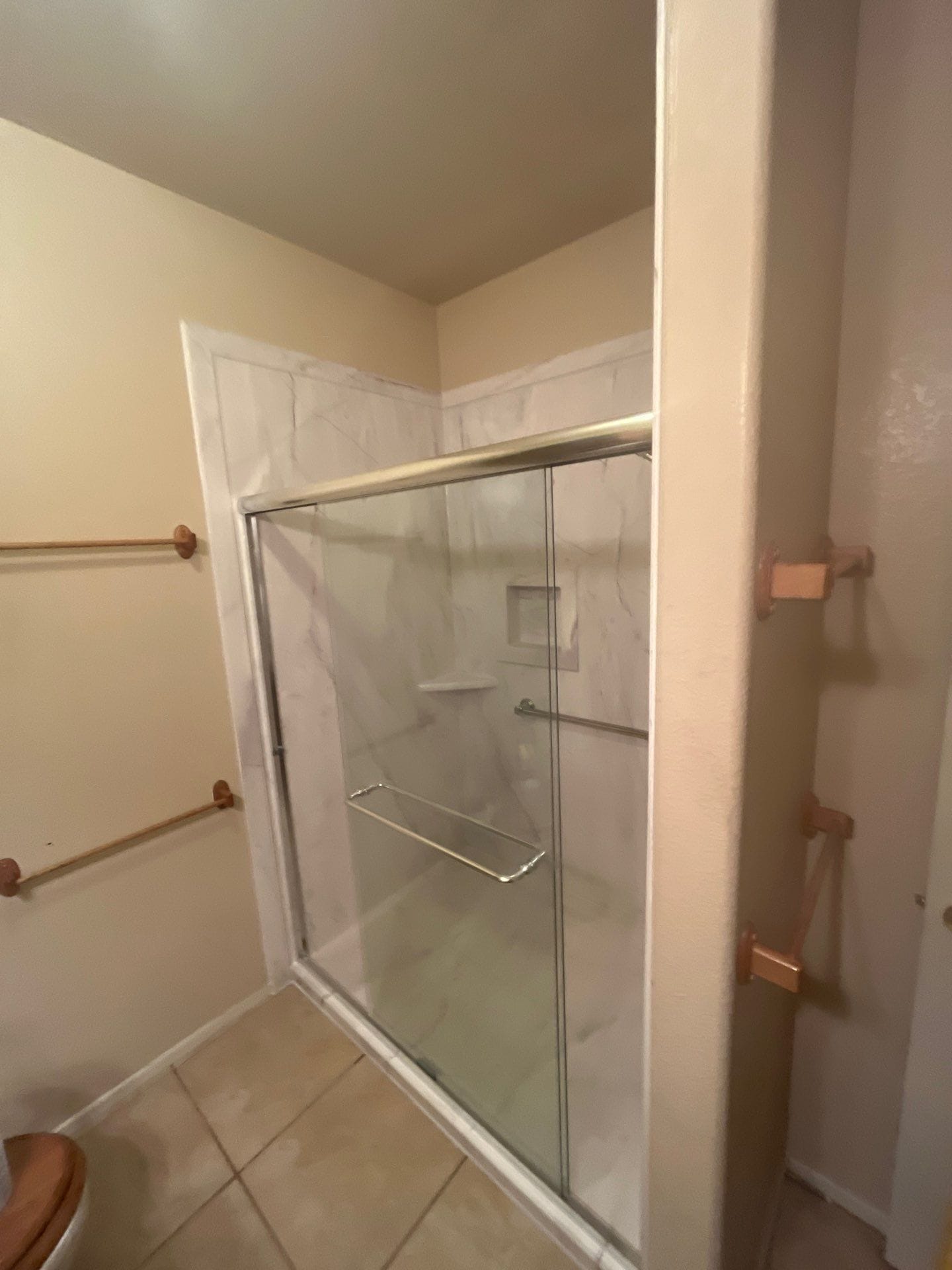Tabitha Lambert presented the Smart Choice package, highlighting its antimicrobial, six-layer composite wall system. The customer selected a white and gray marble-style finish, which offers visual depth while complementing the existing tan wall and tile tones. A brushed nickel grab bar was installed horizontally along the main wall for added stability, and a built-in wall niche was recessed for daily essentials. A corner shelf was added for additional storage. Fixtures included a brushed nickel handheld showerhead with adjustable slide-bar mounting, and the final enclosure used a sliding frameless glass door for water control and accessibility.