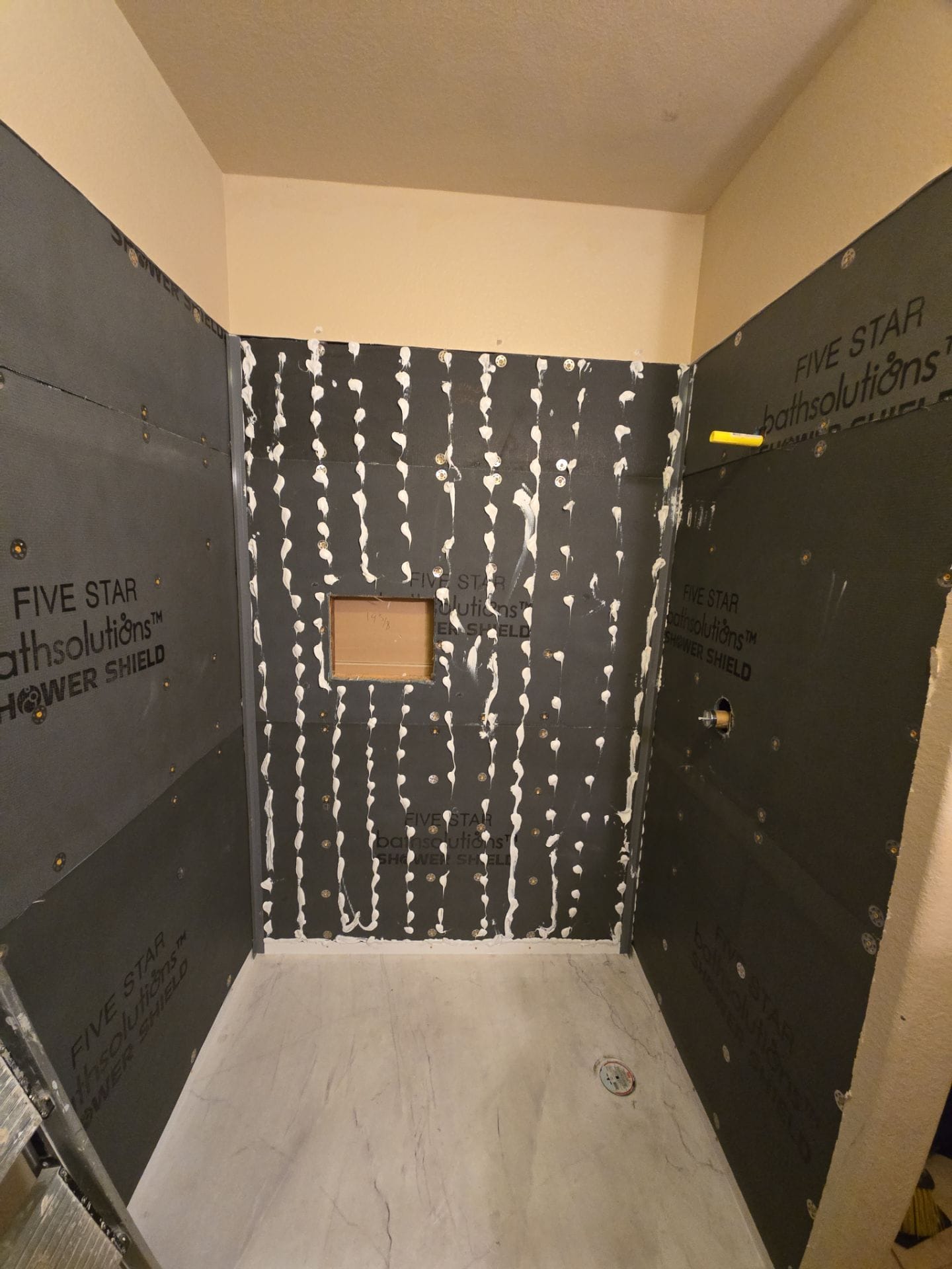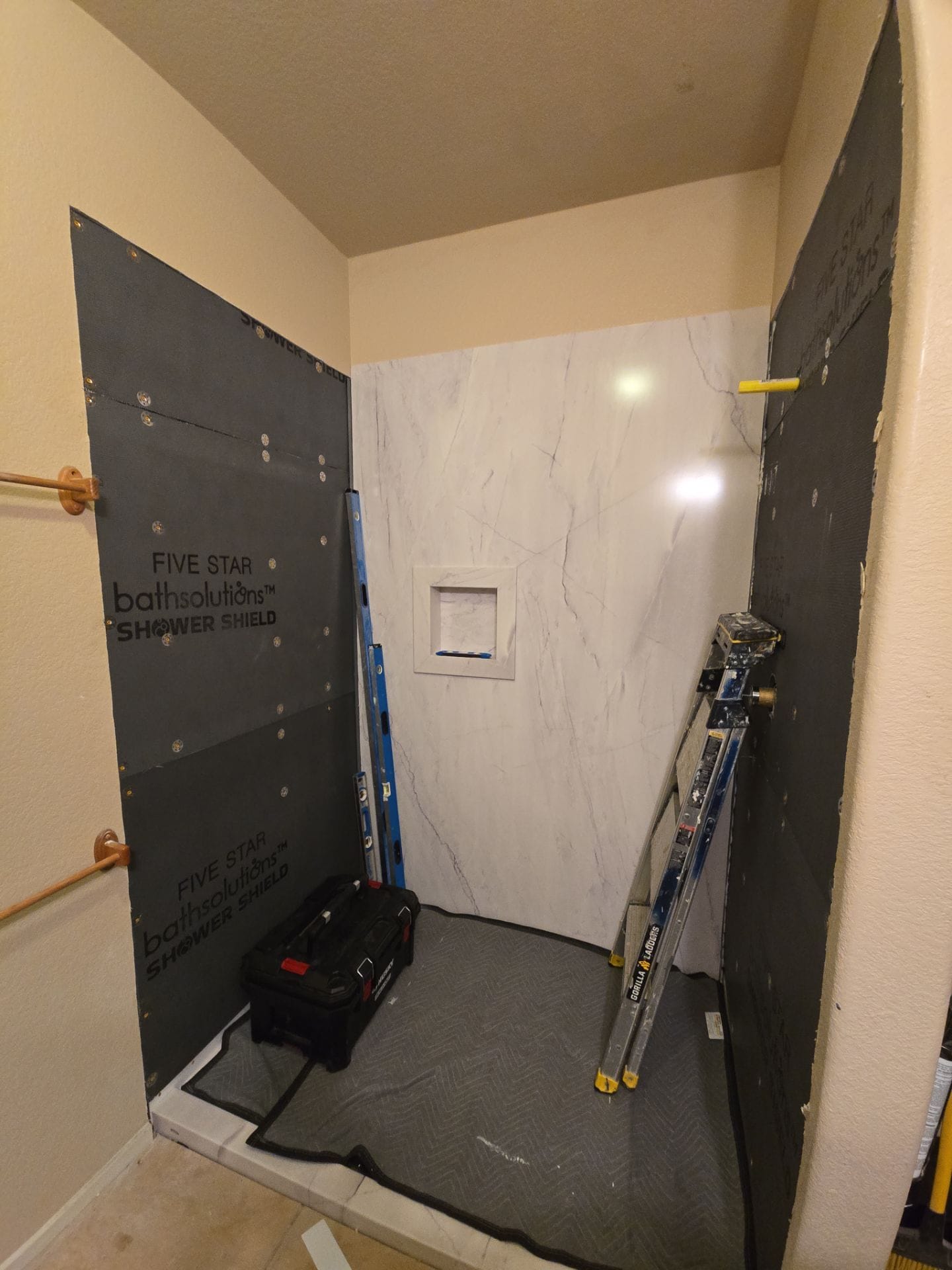 The system was built with a proprietary shower shield backer board and sealed using marine-grade silicone, avoiding the need for grout or caulk. This composition ensures a mold-resistant surface that requires no re-sealing or harsh cleaners. Tabitha walked through each design option with the customer using 3D mockups, helping finalize fixture placement, accessory heights, and surface selections. This guided consultation helped eliminate concerns from prior negative sales experiences.