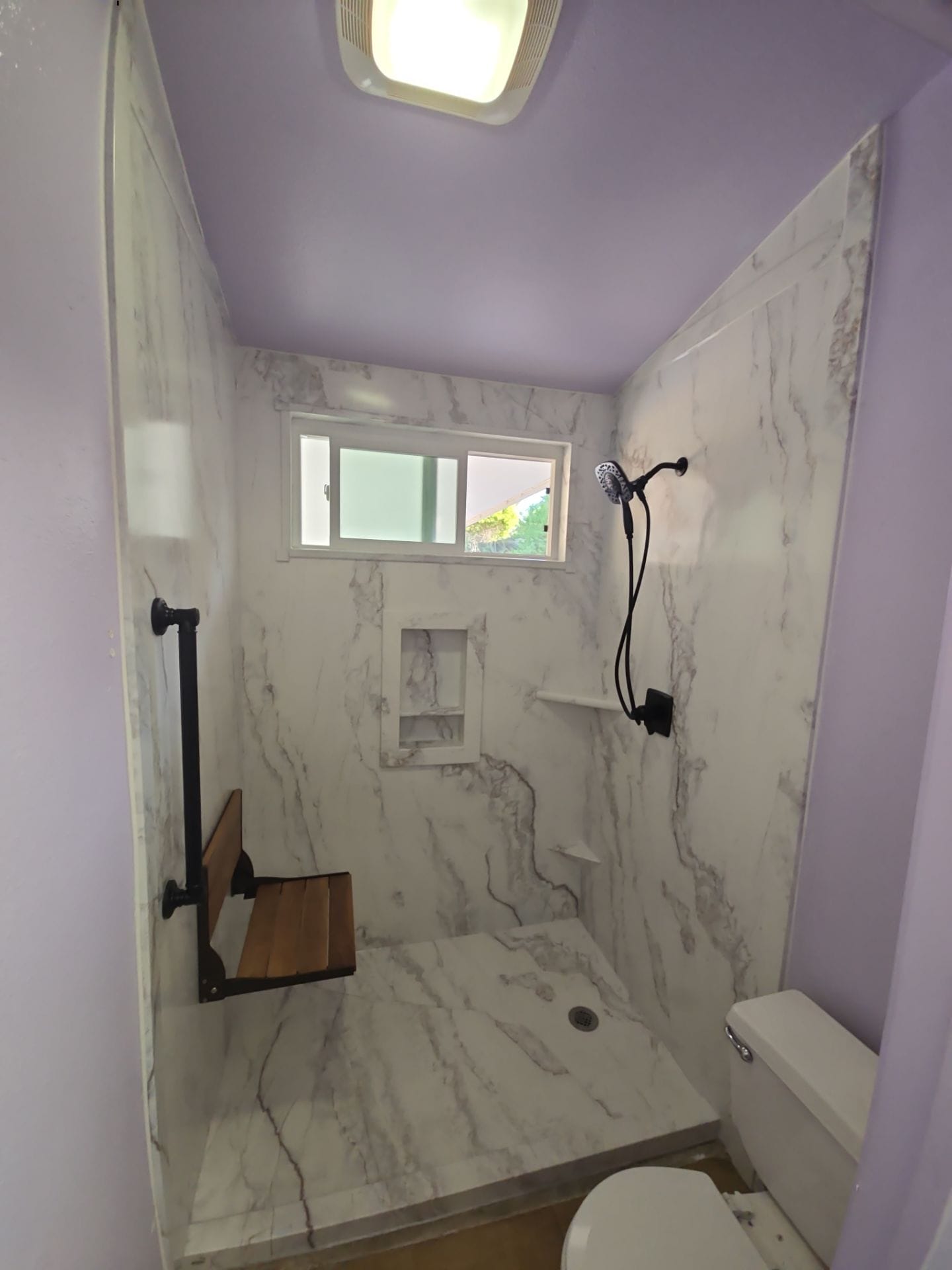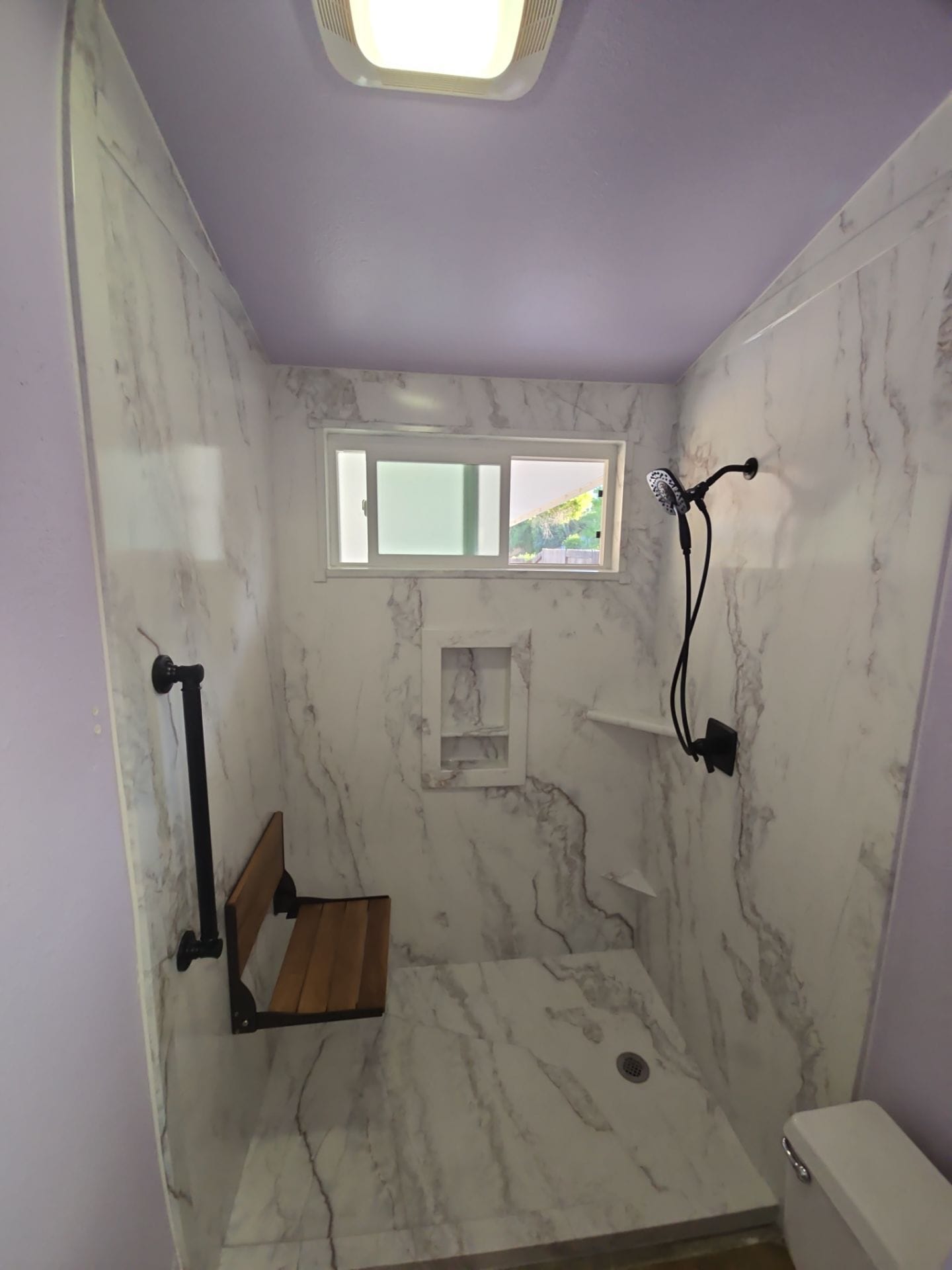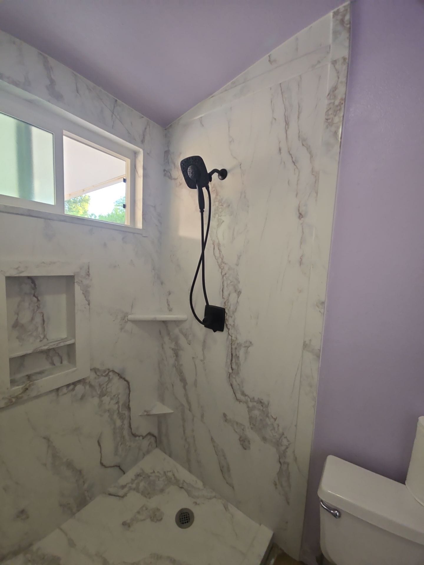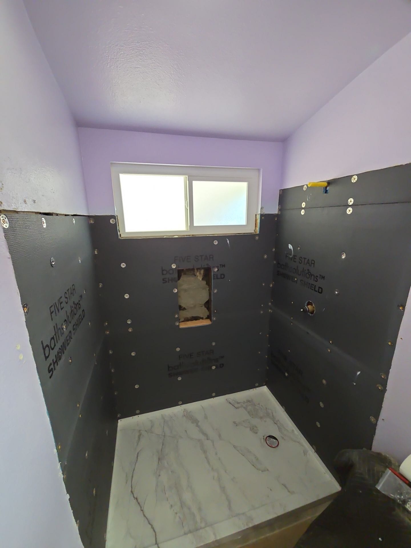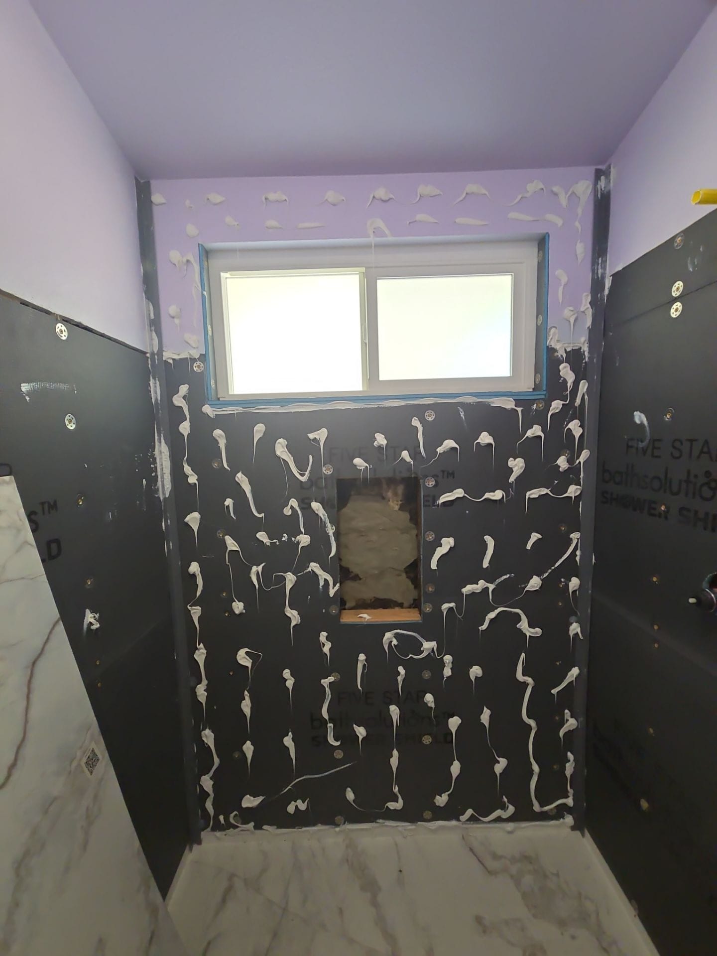 Installation was completed over two to three days following material arrival. The process included full demo to the studs, replacement of plumbing valves, and reinforcement of all wall areas prior to panel installation. Each piece was fitted flush to the ceiling and window casing, ensuring a clean finish and watertight seal. Joey provided direct communication and included contact details for project manager Logan and franchise owner Lane to support full transparency during planning and execution.