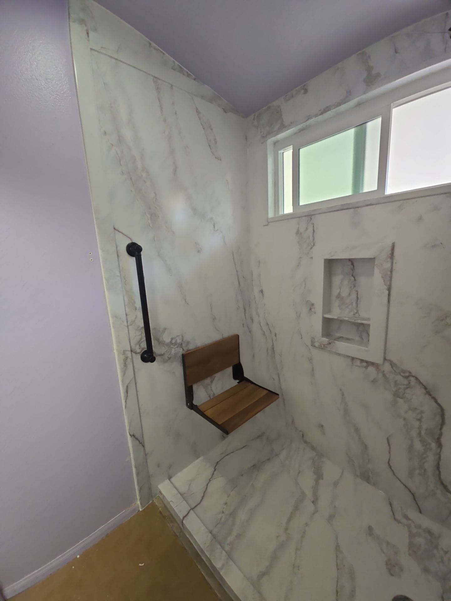 Joey LeBlanc introduced the Smart Choice package and explained the durability and safety benefits of the grout-free composite system. The customer selected white marble-style Triton wall panels with gray veining. A fold-down teak bench was added for optional seated comfort, along with a matte black grab bar installed vertically for accessibility. A built-in double-shelf niche was included for product storage, and an additional corner shelf was mounted nearby. Final fixture selection included a matte black handheld showerhead with flexible reach and simple control.