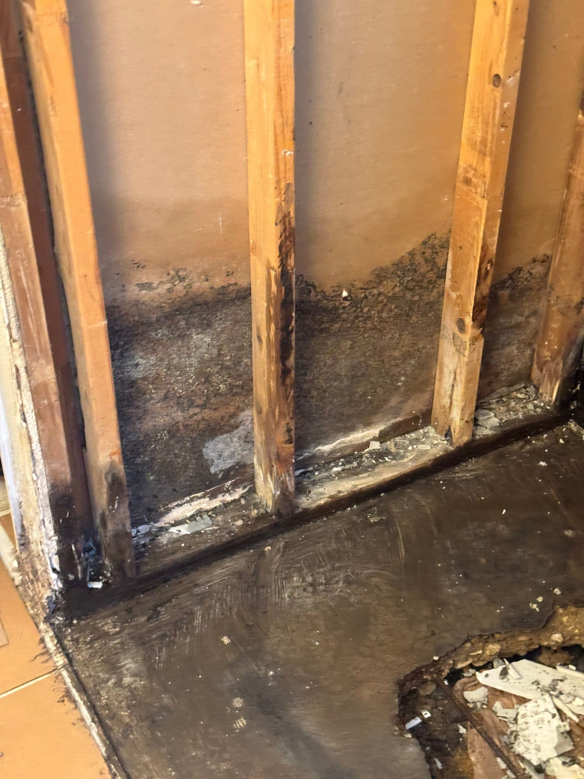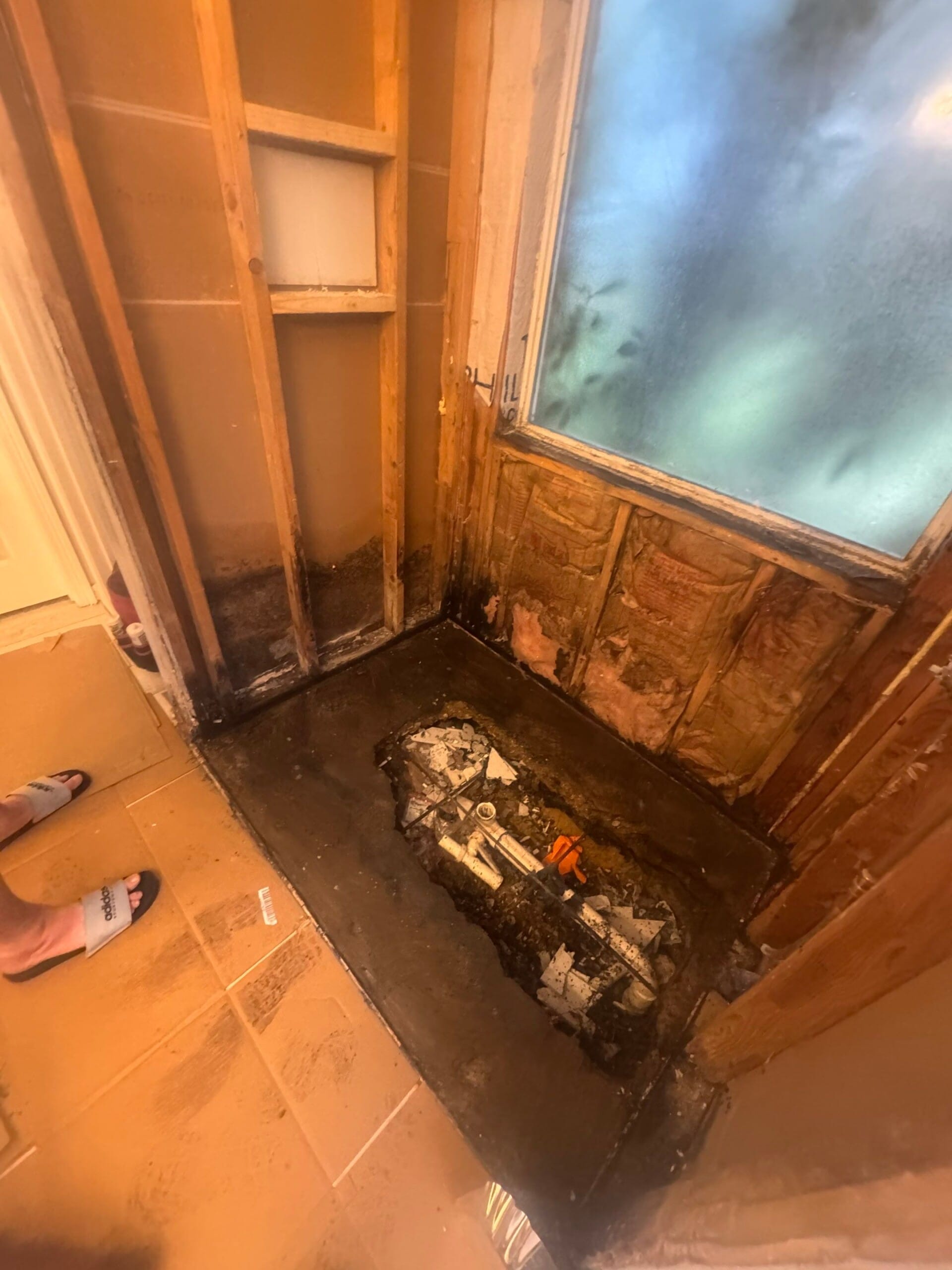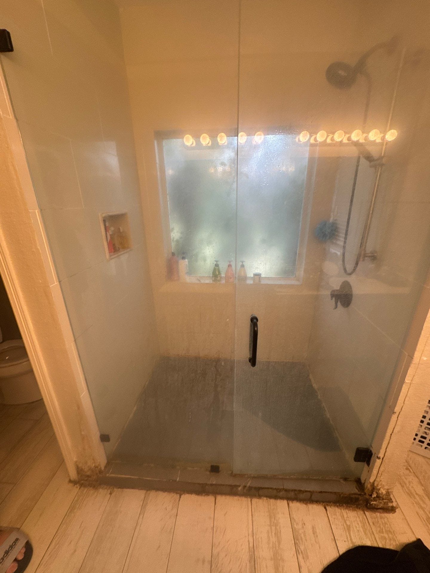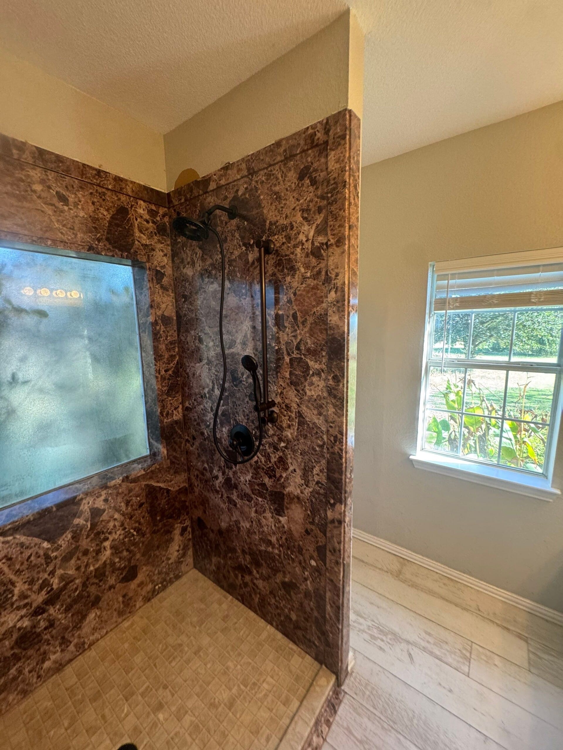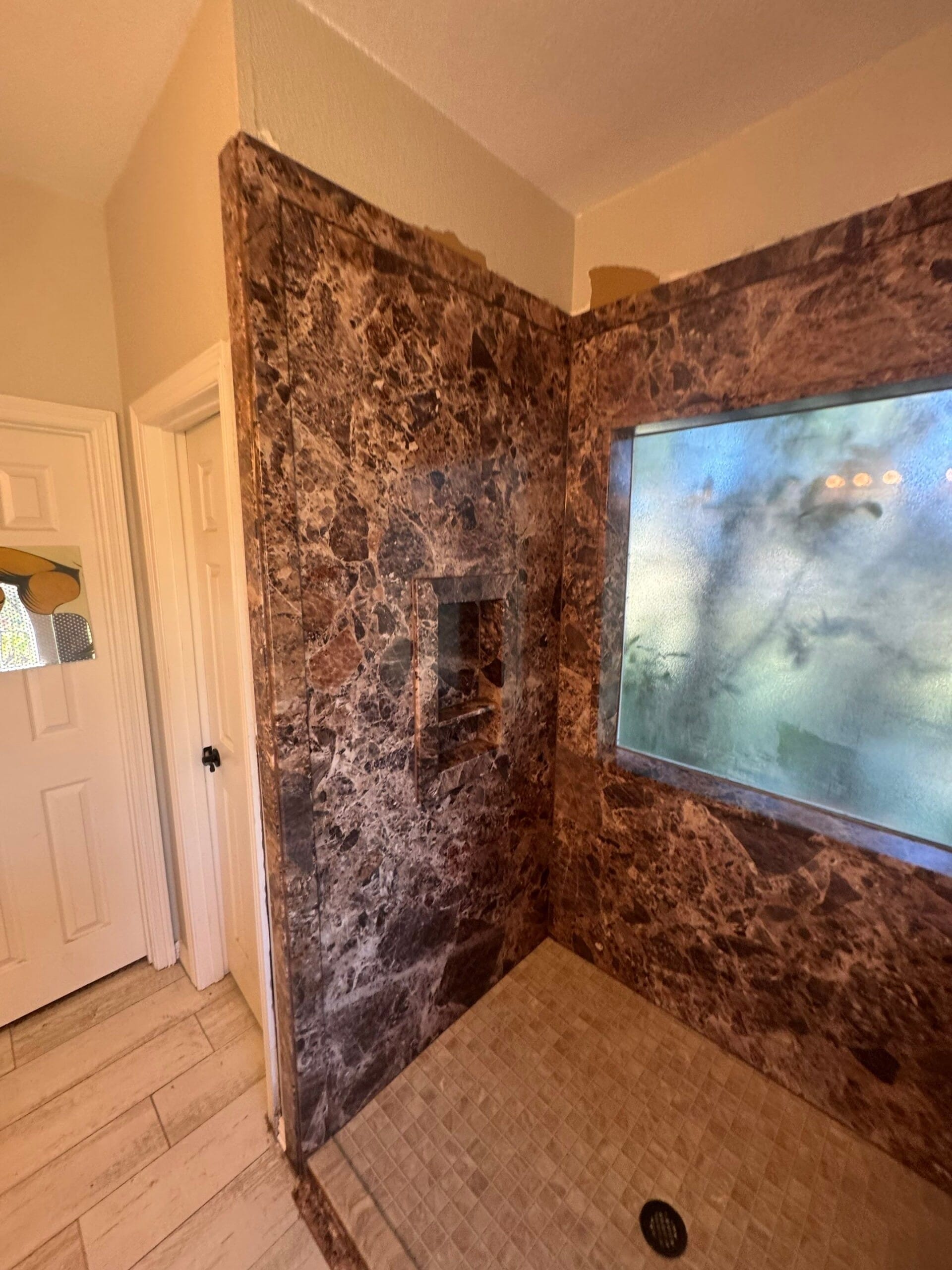 Installation involved a full demolition down to the subfloor and framing to ensure warranty coverage and address sub-surface damage. The replacement included a rectangular shower base with textured tile-style flooring and full-height composite wall panels in a dark stone pattern. The integrated window trim was preserved for natural light, and the replacement fixtures were installed in oil-rubbed bronze, consistent with the customer’s original preferences. Installation was described as typically completed in two days, with proactive handling of any mold or foundational issues.