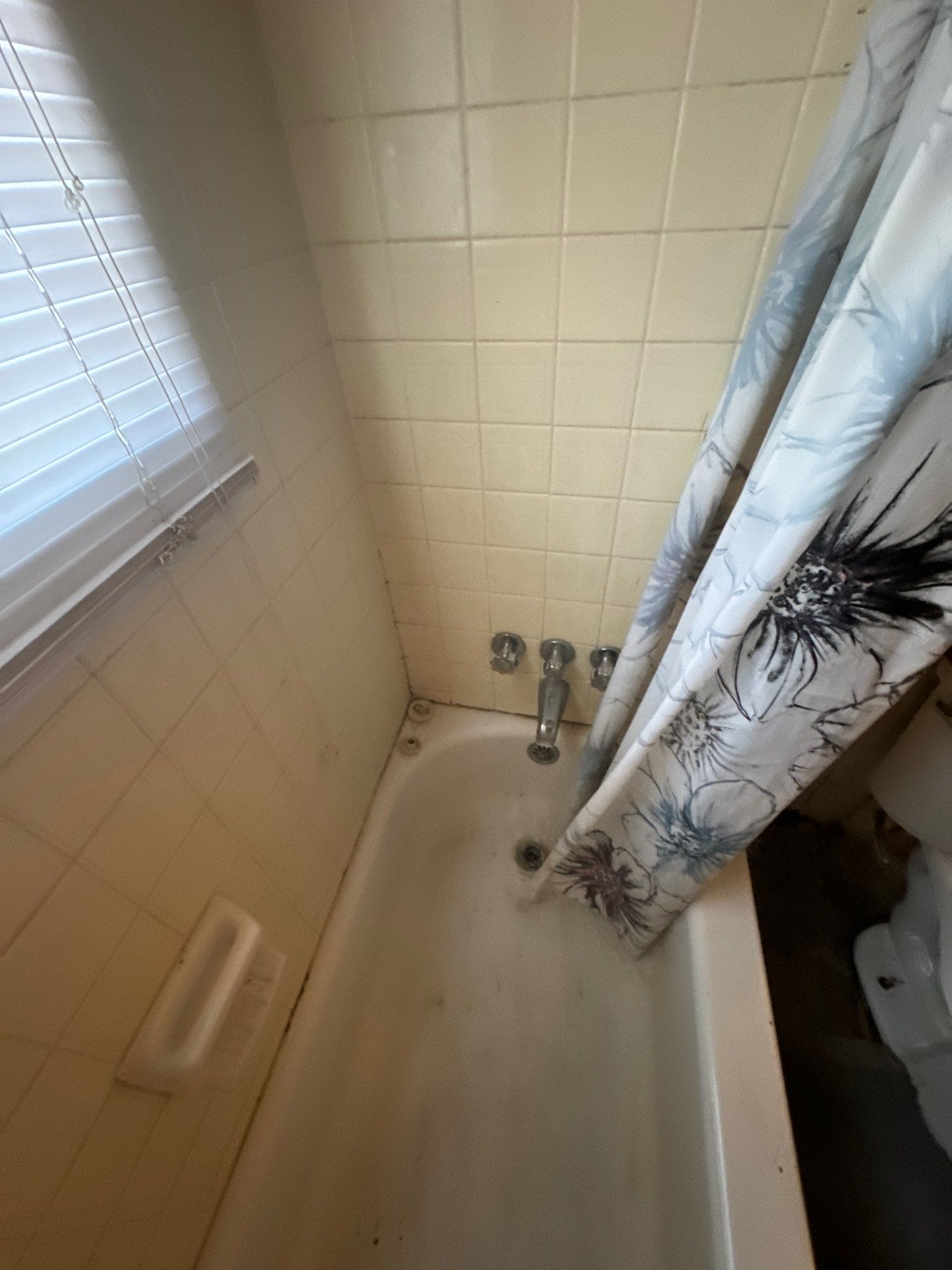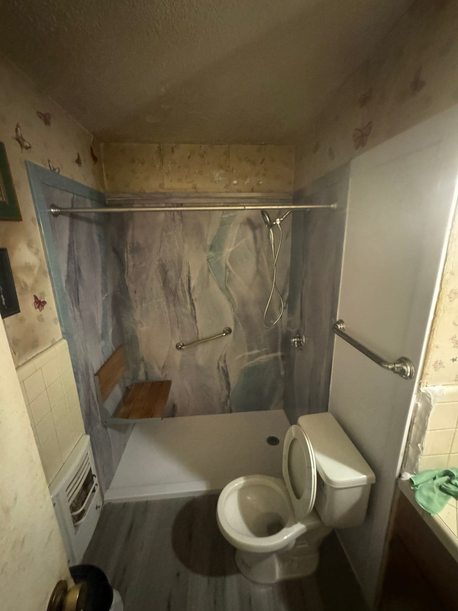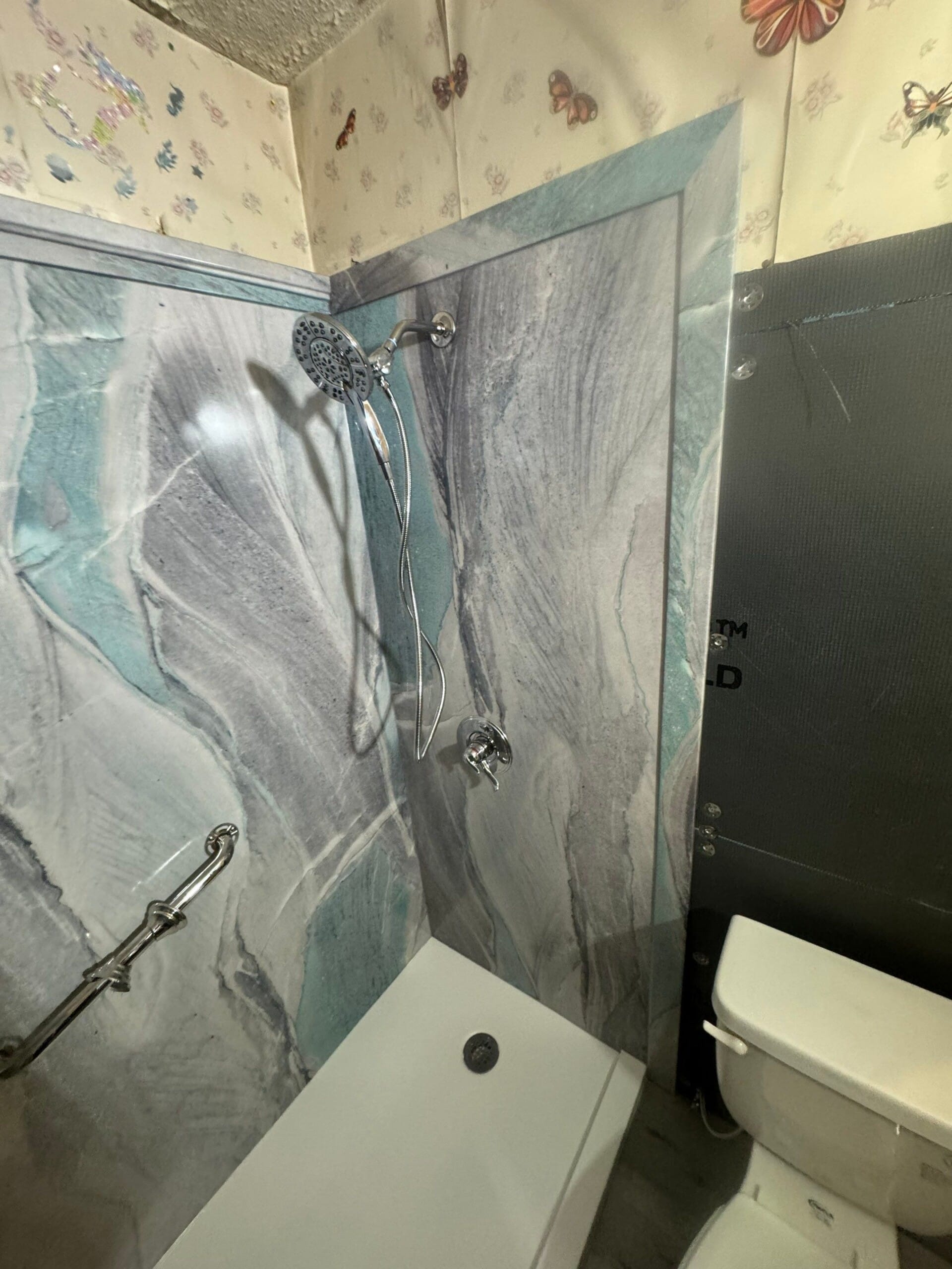 Installation included demolition of the old tub, surround, and exposed subflooring. The crew inspected and repaired the damaged wall area near the toilet before installing the waterproof Shower Shield backer board and new walk-in base. Delta-grade plumbing fixtures and wall-mounted accessories were anchored securely, including a chrome grab bar and a fold-down bench. New LVP-style flooring extended across the shower zone for a continuous finish. Installation was completed in two days.
