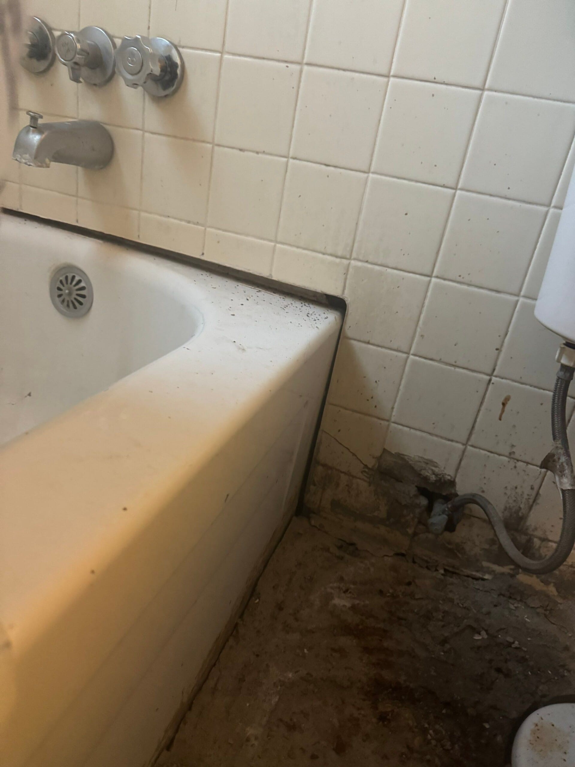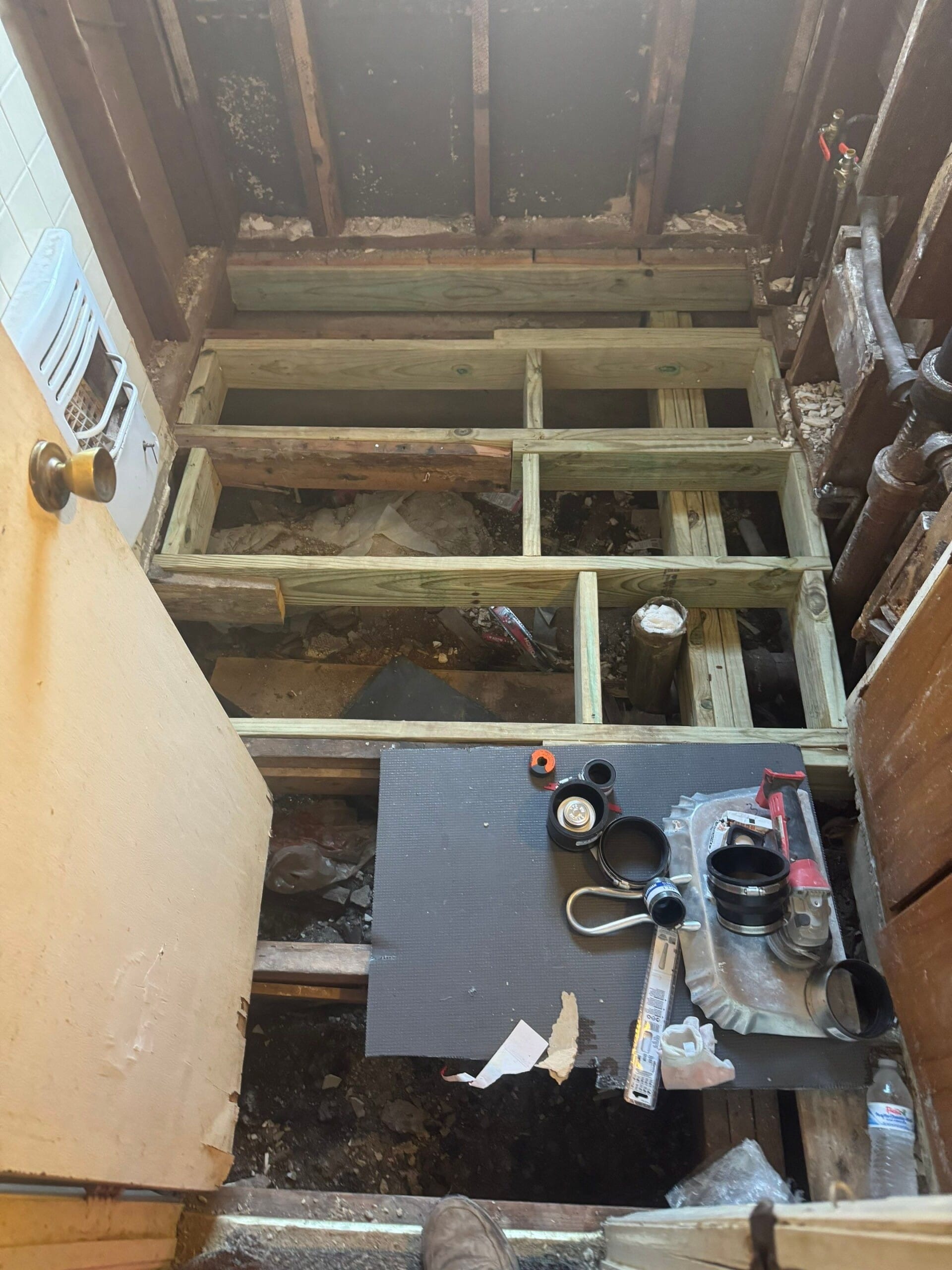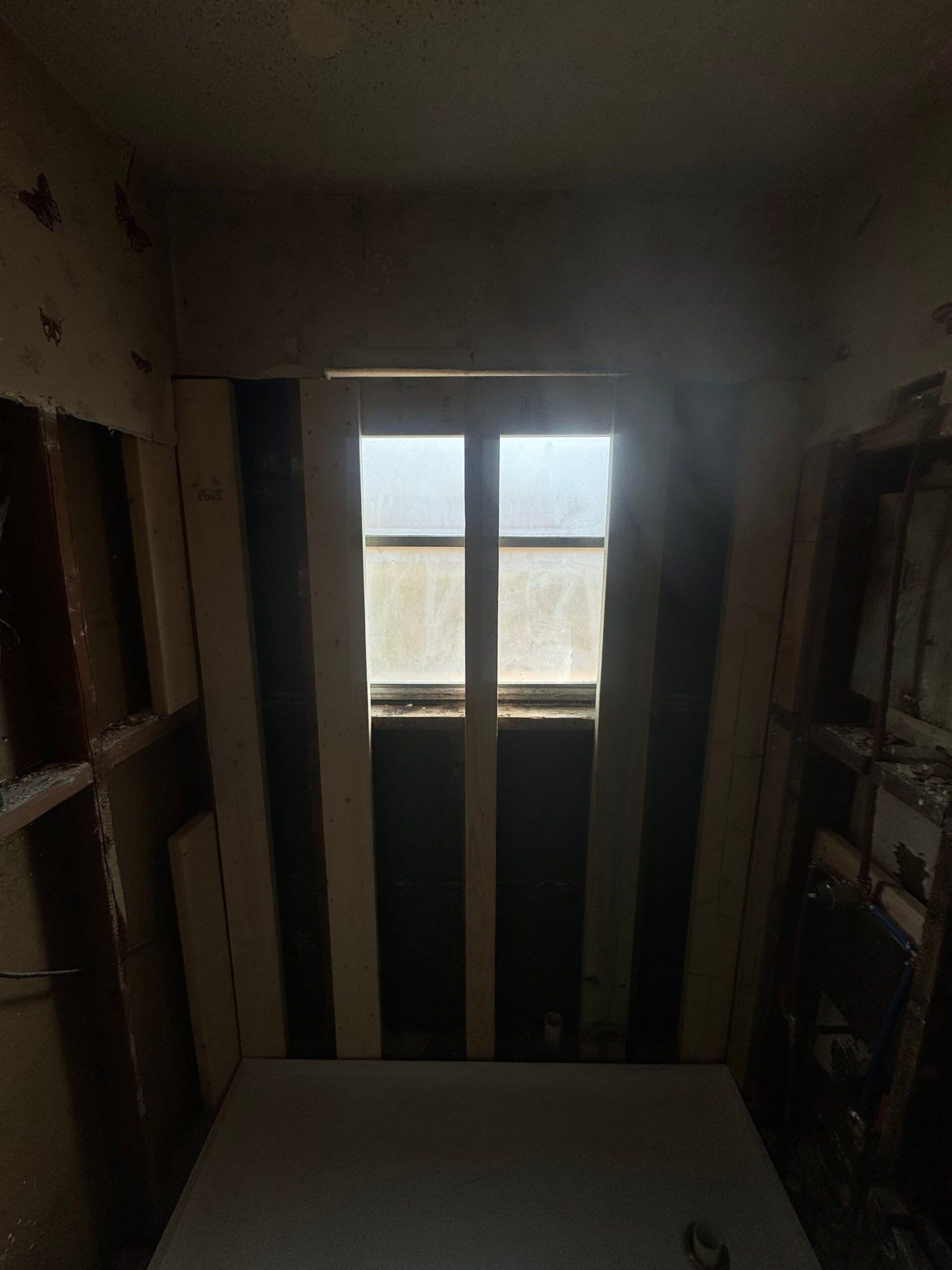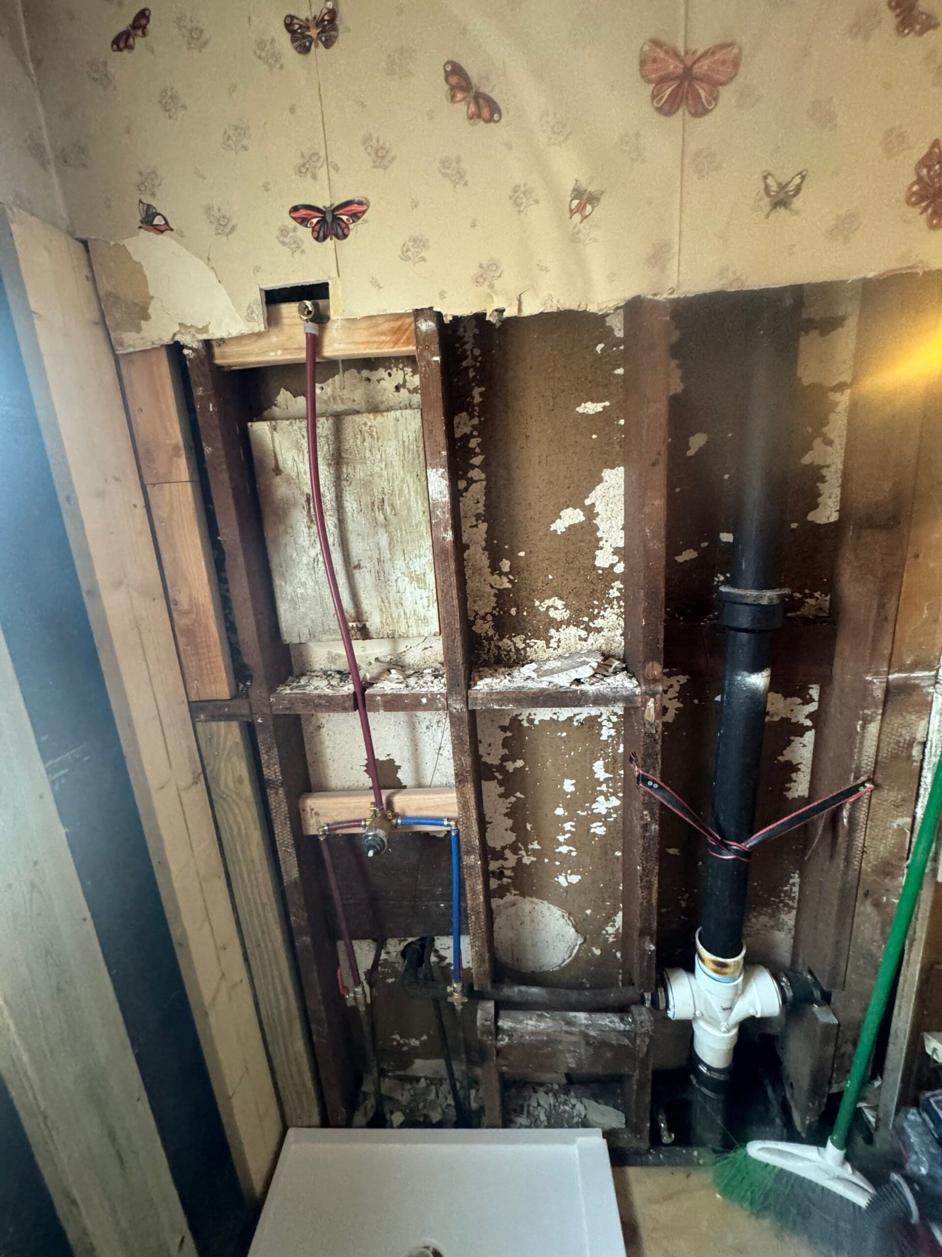Installation included demolition of the old tub, surround, and exposed subflooring. The crew inspected and repaired the damaged wall area near the toilet before installing the waterproof Shower Shield backer board and new walk-in base. Delta-grade plumbing fixtures and wall-mounted accessories were anchored securely, including a chrome grab bar and a fold-down bench. New LVP-style flooring extended across the shower zone for a continuous finish. Installation was completed in two days.
