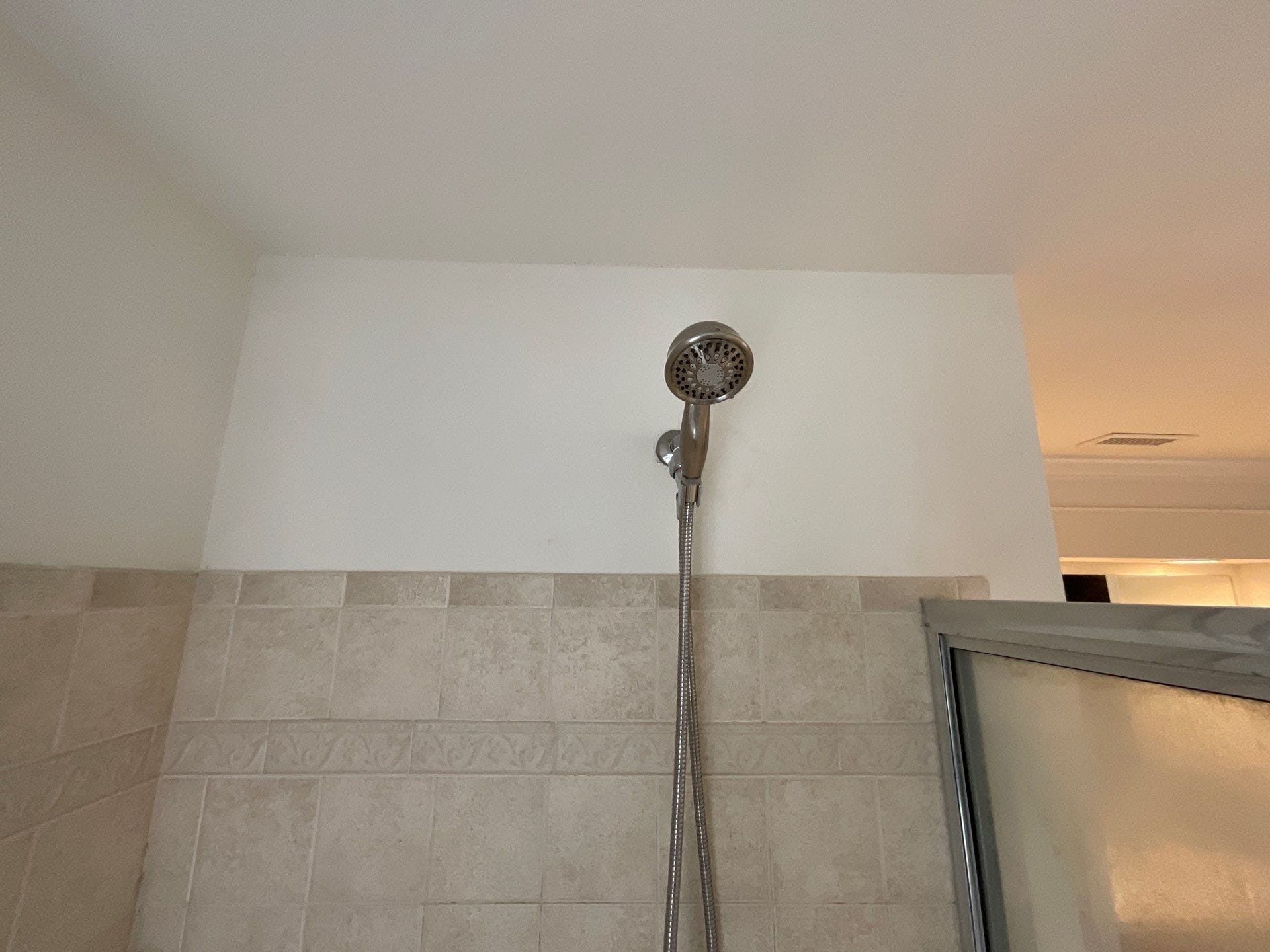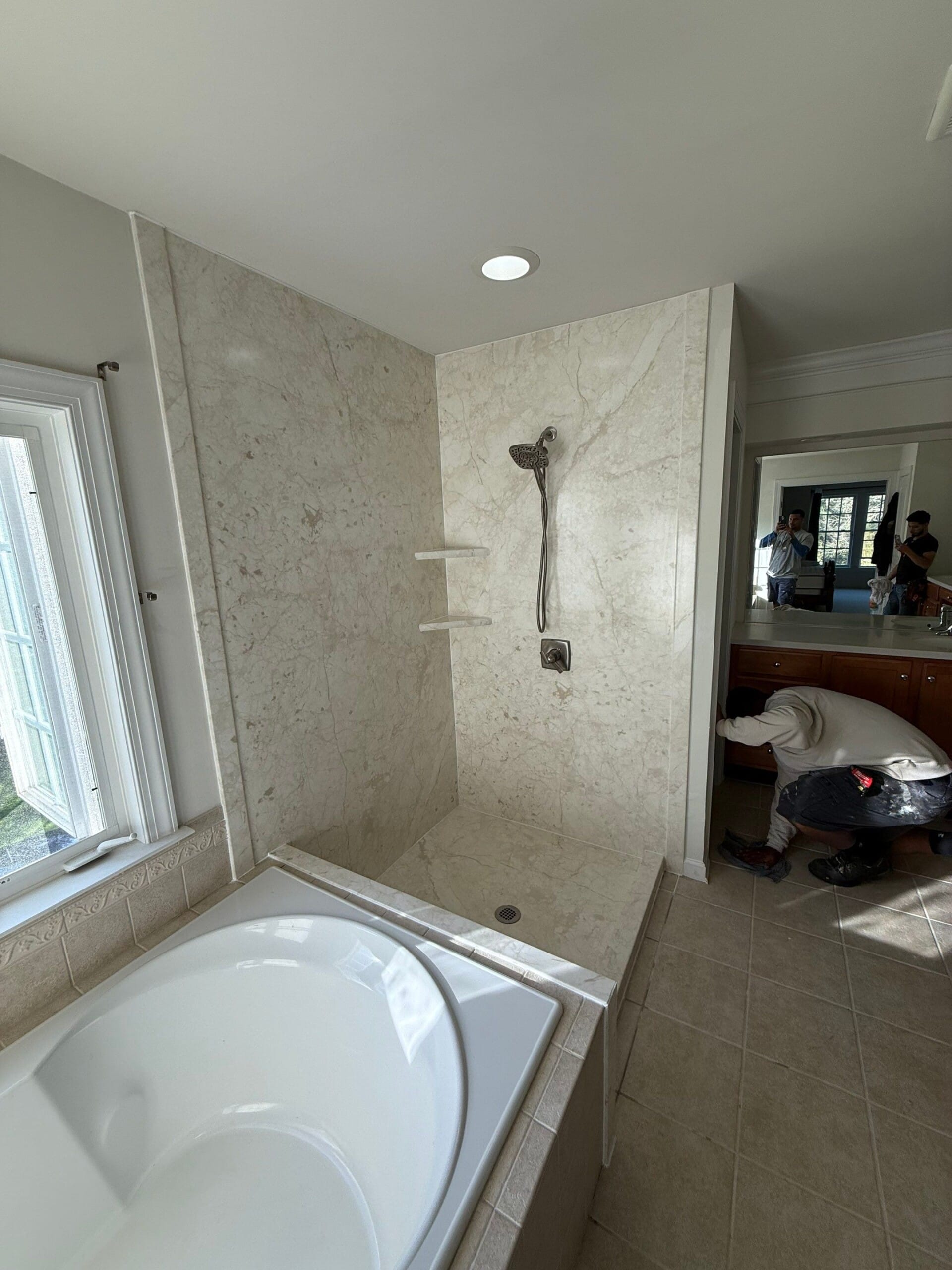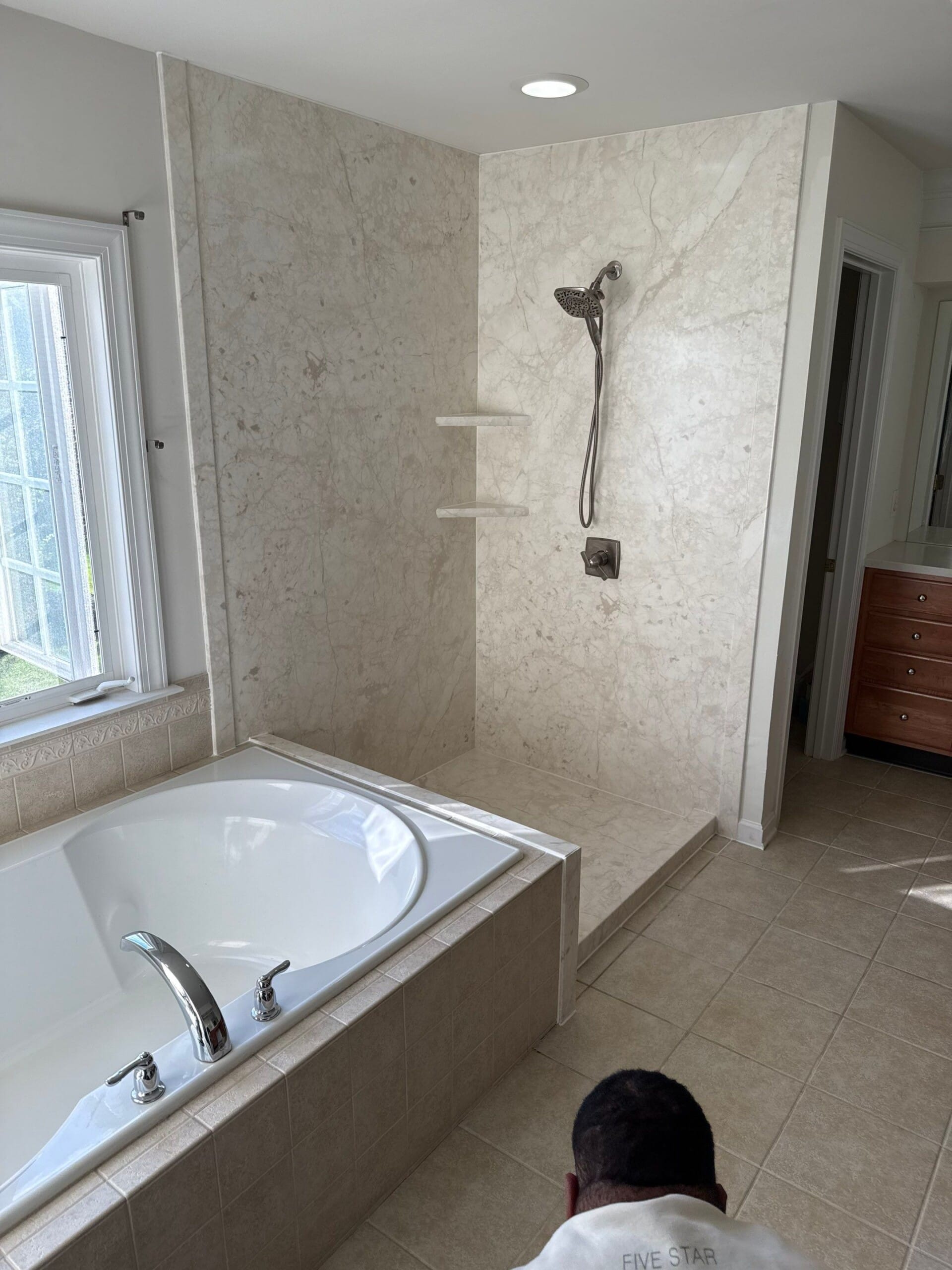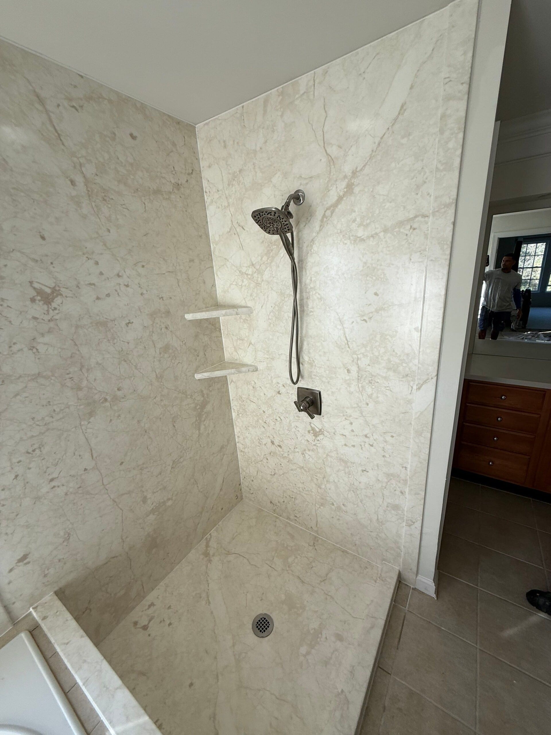 Installation involved a complete demo of the existing shower stall down to the studs to address the underlying plumbing and subfloor needs. The new setup features a low-threshold base and floor-to-ceiling panels in a soft, marble-patterned finish that complements the room's existing style. A brushed nickel handheld shower system on a slide bar was installed for versatility, along with two matching corner shelves for accessible storage.