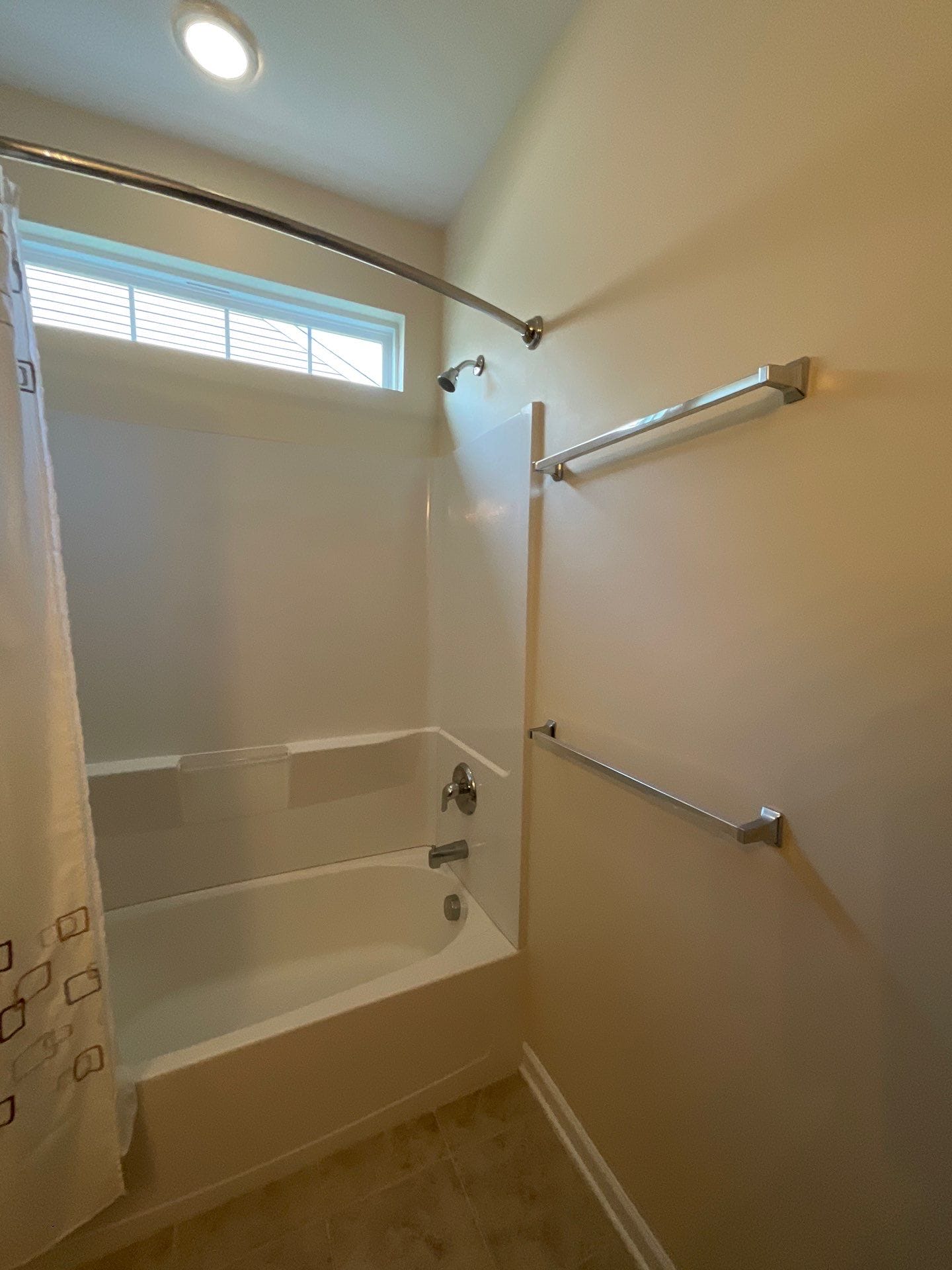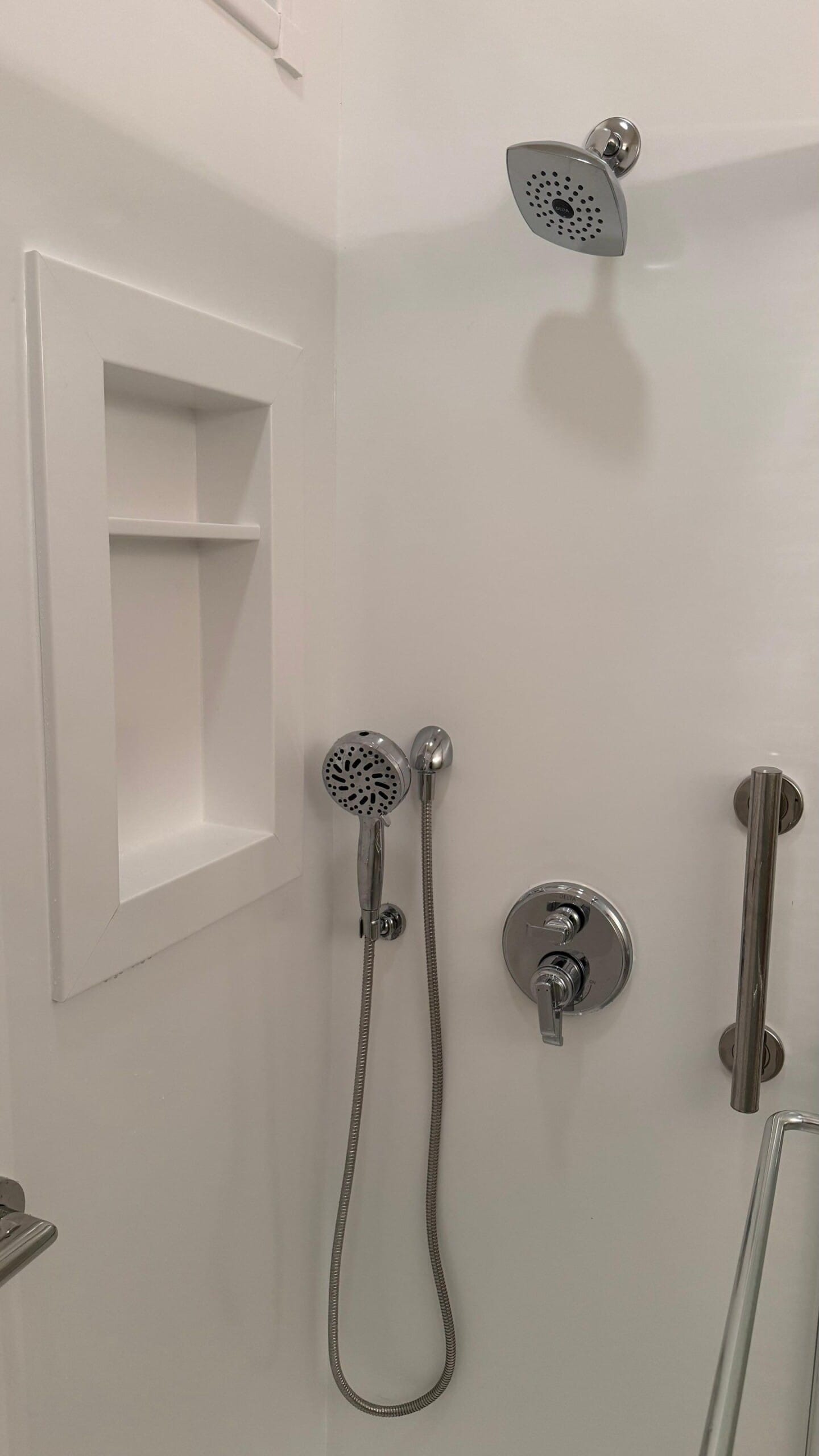 The Five Star Bath Solutions representative presented a grout-free composite wall system in a clean white finish, designed to provide a smooth, easy-to-maintain surface without visible grout lines. The system includes antimicrobial properties to help prevent buildup and simplify cleaning. A sliding glass enclosure with a frosted finish was selected to provide privacy while maintaining a bright and open feel. Brushed nickel fixtures, including a dual shower system with a fixed showerhead and handheld option, were installed alongside a built-in recessed niche for organized storage. A grab bar was also integrated to enhance safety and stability within the space.