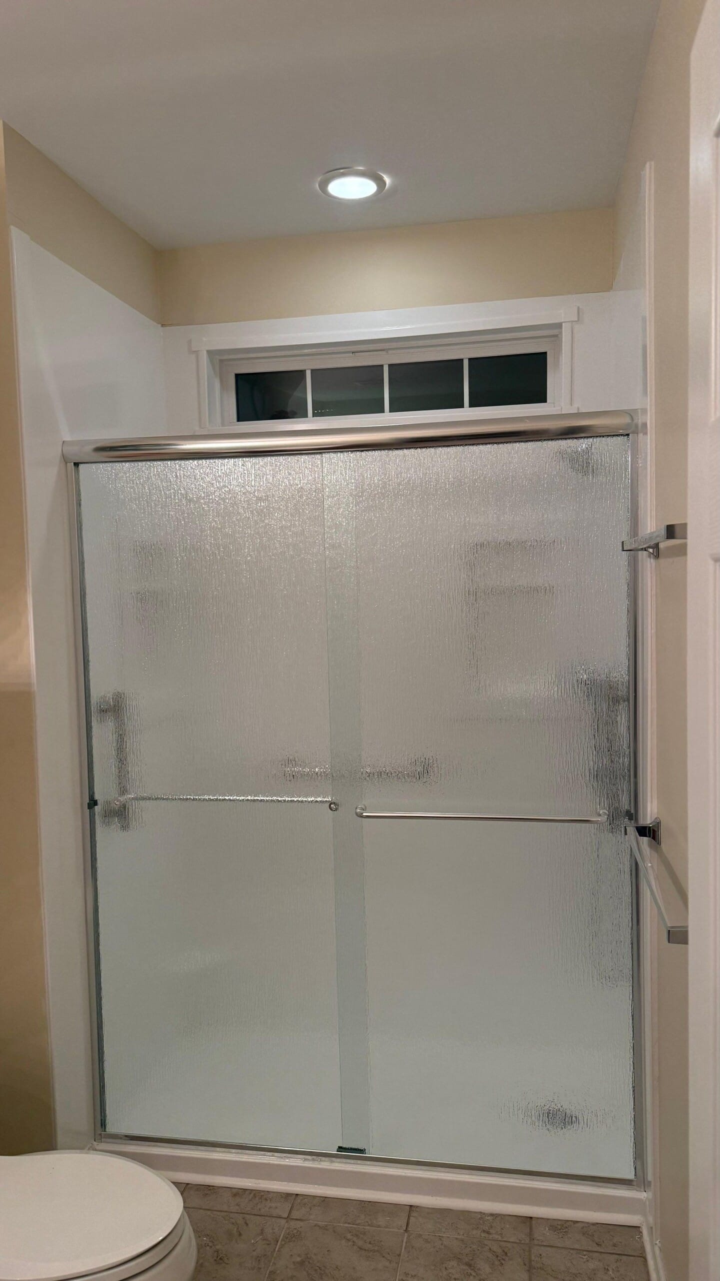 * Sliding frosted glass door enclosure with metal frame