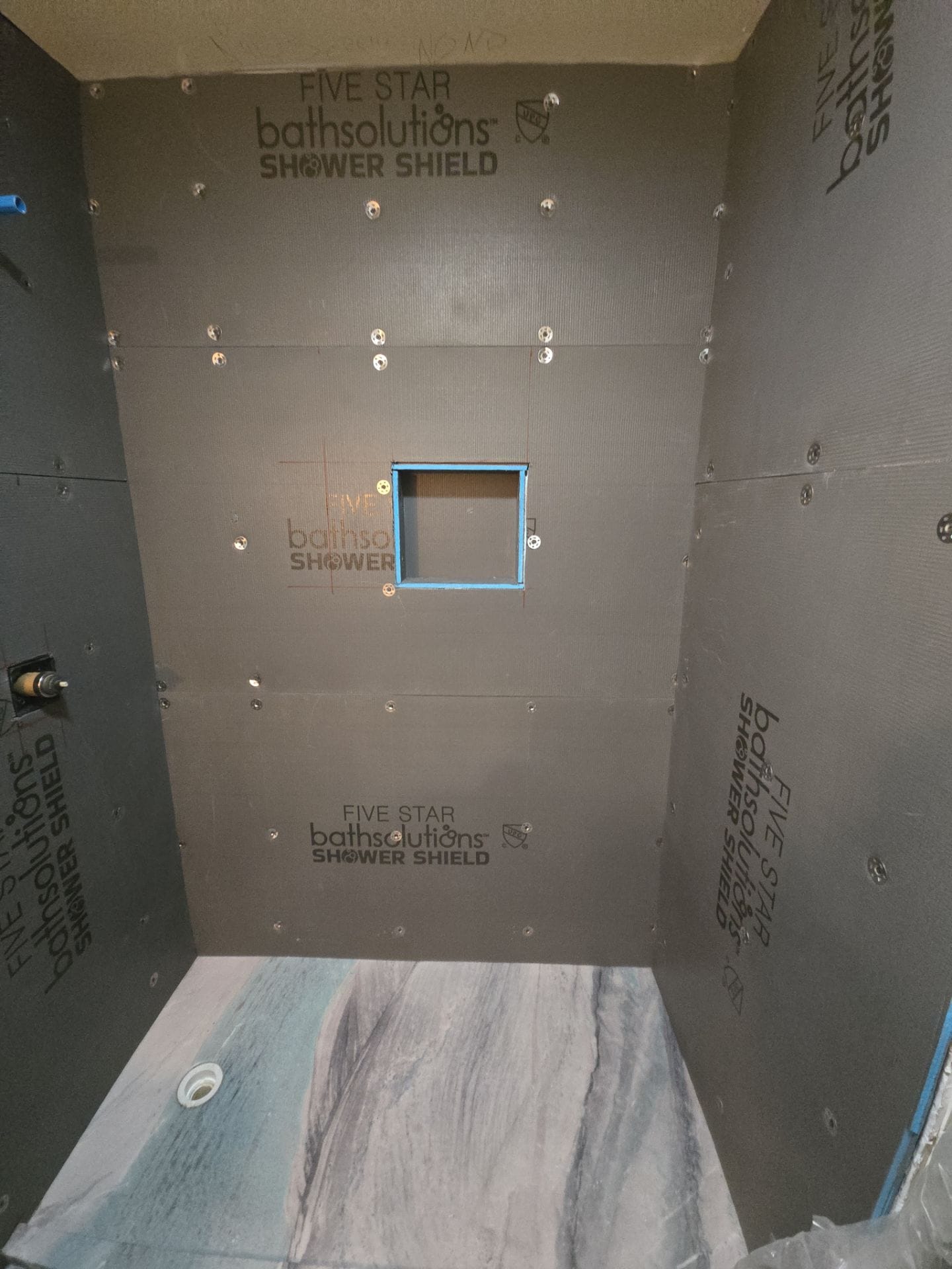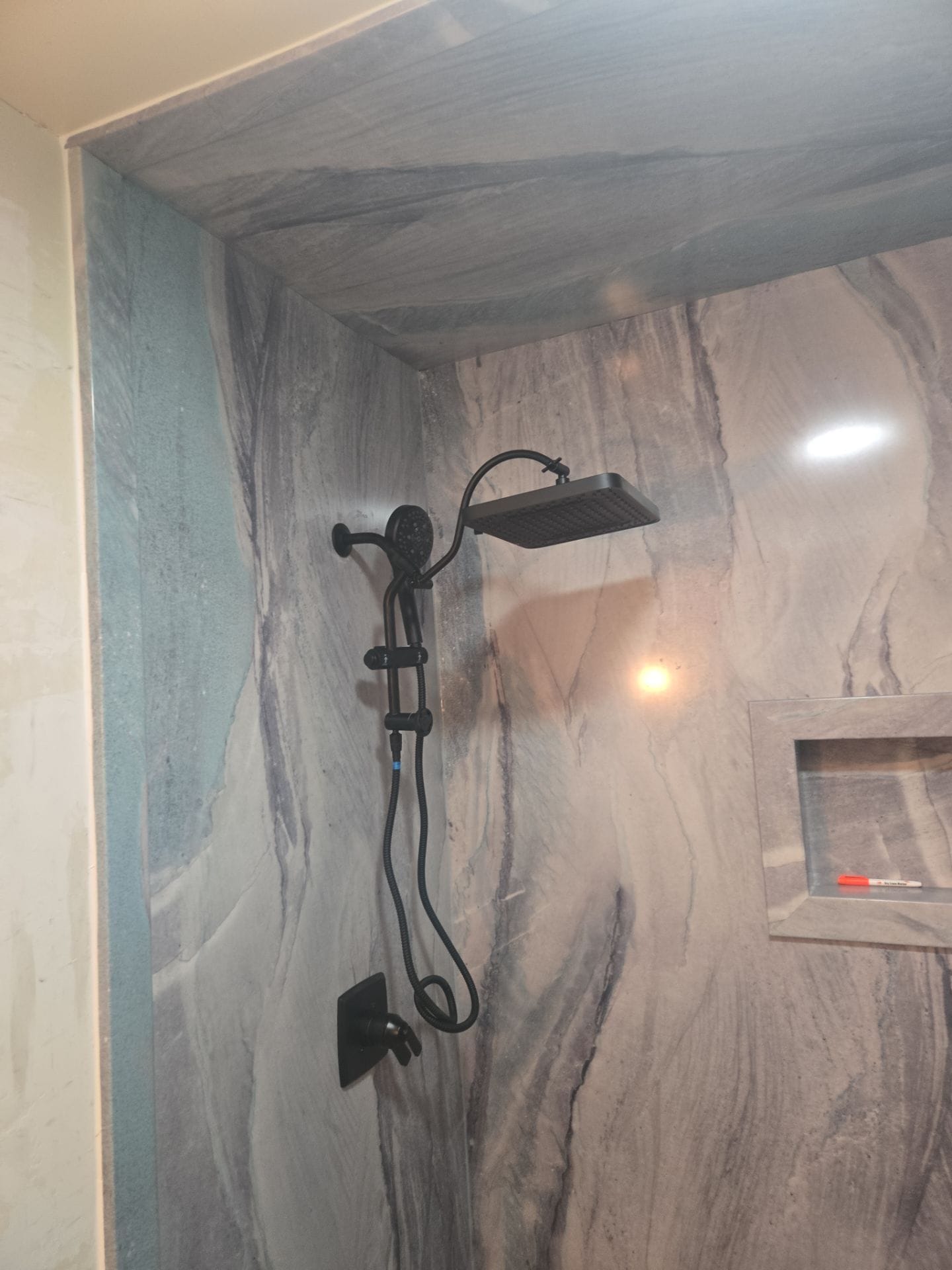 The Five Star Bath Solutions representative presented a grout-free wall system designed to replicate the appearance of natural stone while eliminating the upkeep associated with tile. The selected finish features a large-format marble pattern with flowing gray and white tones, paired with matte black fixtures for a clean, contemporary look. The system is waterproof, antimicrobial, and resistant to mold and mildew. The company’s specialization in bathroom remodeling, along with certified installation teams and a strong reputation for consistent results, provided assurance in both product quality and workmanship.