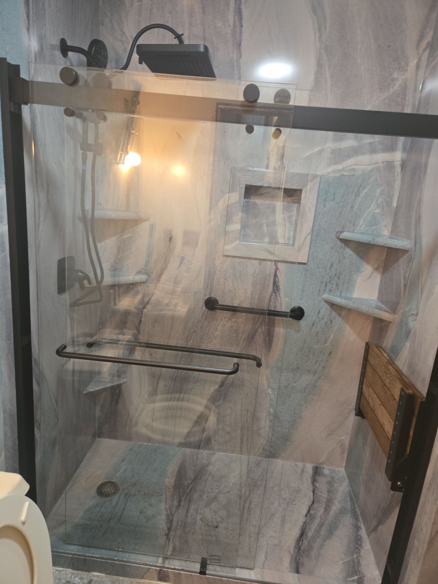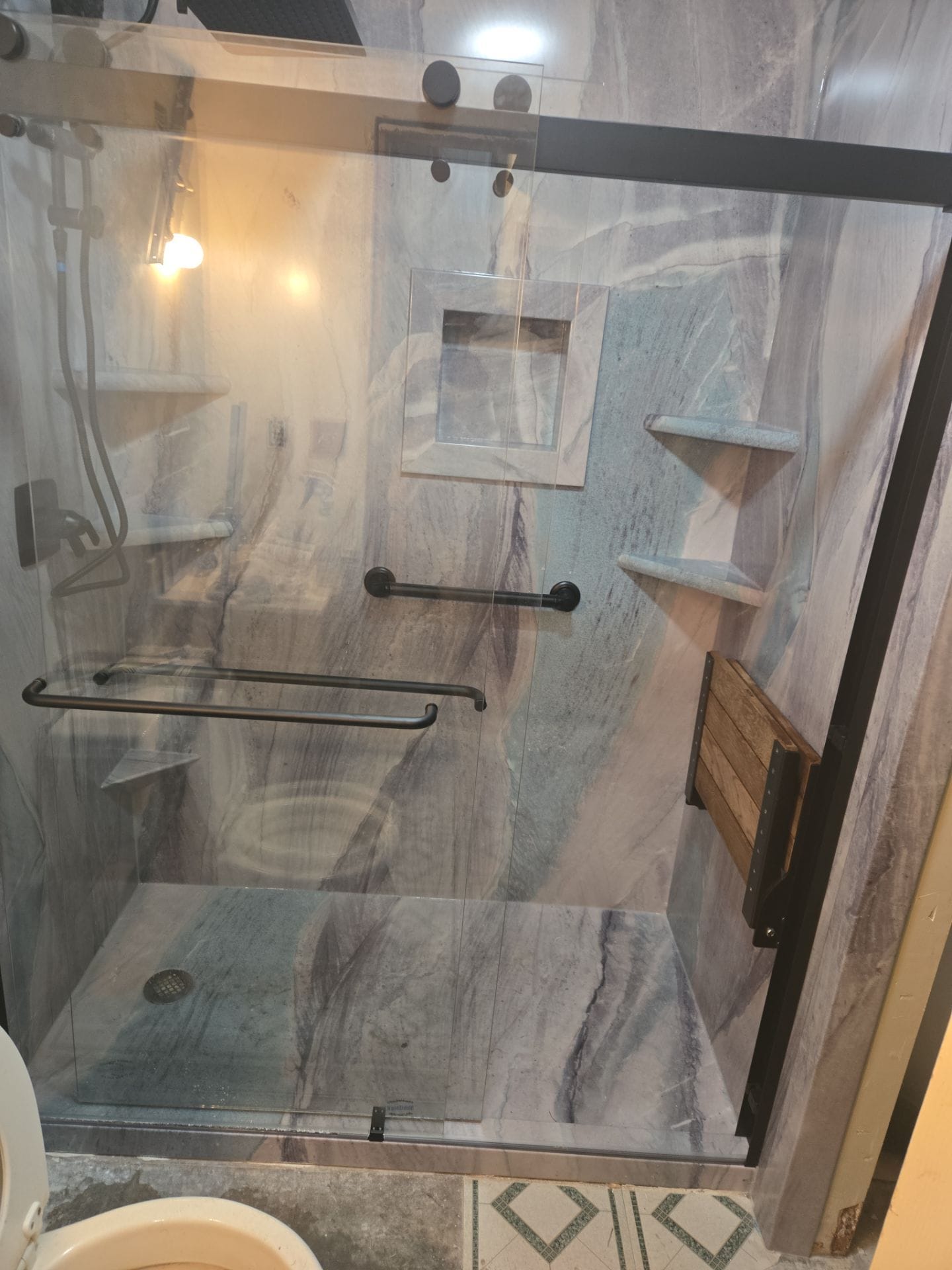 Installation involved removal of the existing tub and surrounding materials, followed by inspection and preparation of the underlying structure. A waterproof backer system was installed before fitting the new wall panels, low-threshold shower base, and integrated components. The updated design includes a sliding glass door system to enhance accessibility and maintain water containment while opening the space visually. Additional features such as a recessed niche, corner shelving, and a fold-down bench were incorporated to improve usability. The process was completed efficiently with full site protection and cleanup, leaving the space ready for immediate use.