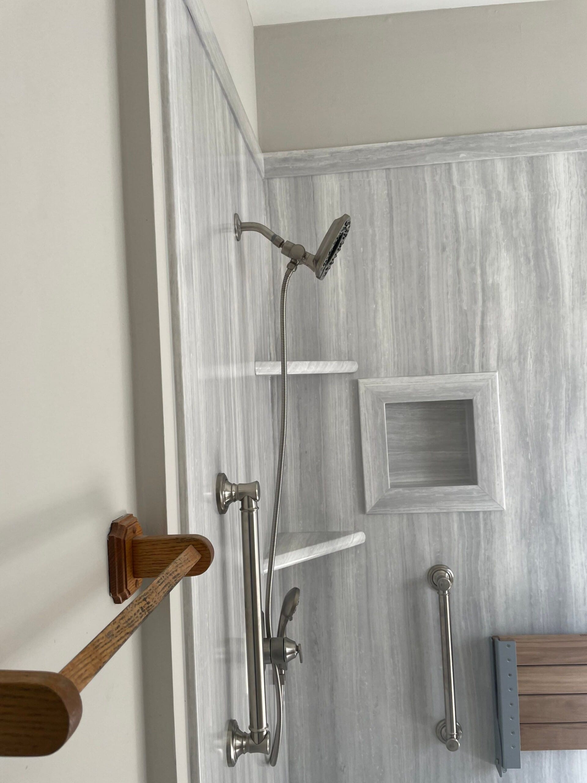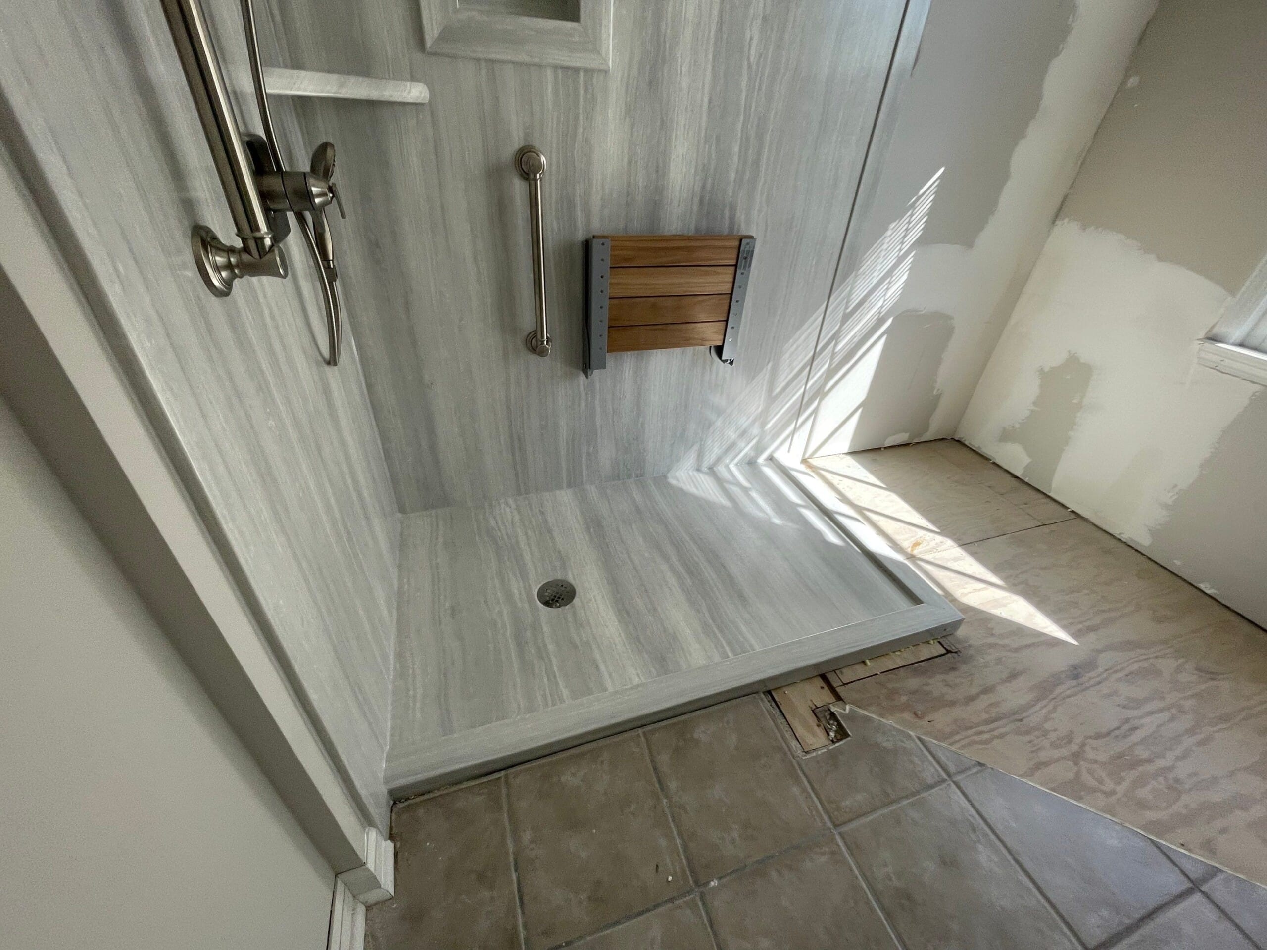 Installation began with complete demolition of the tub and surrounding materials, followed by inspection of the substrate and framing. A moisture-resistant reinforced backing system was installed prior to plumbing upgrades and placement of the custom non-slip shower base. Composite wall panels, recessed shelving, grab bars, and a fold-down bench were mounted directly to blocking for structural integrity. Final trim work ensured a sealed and watertight perimeter.