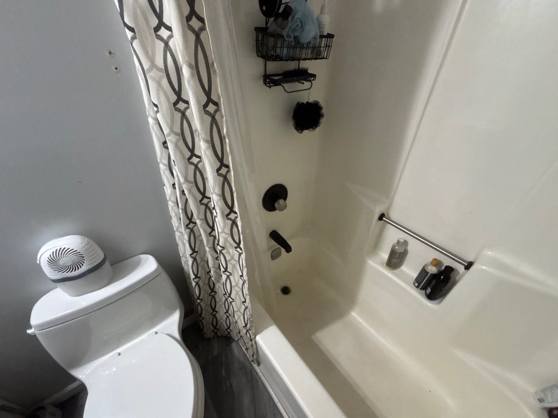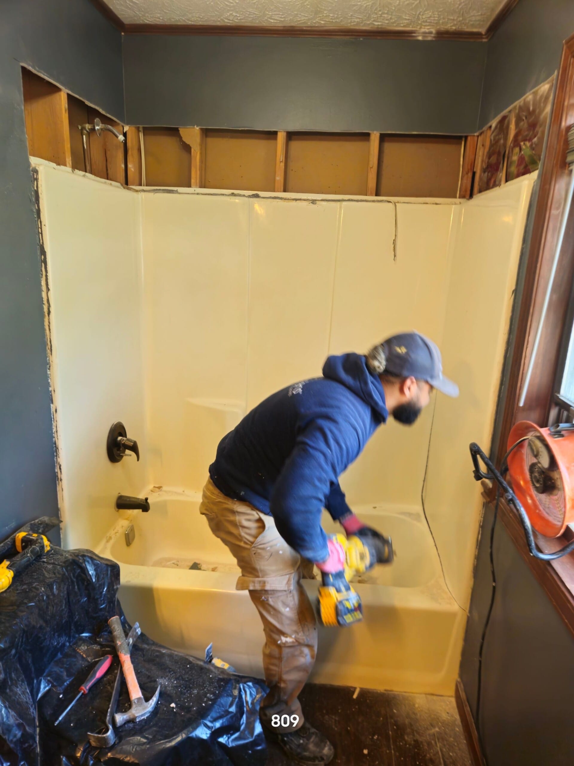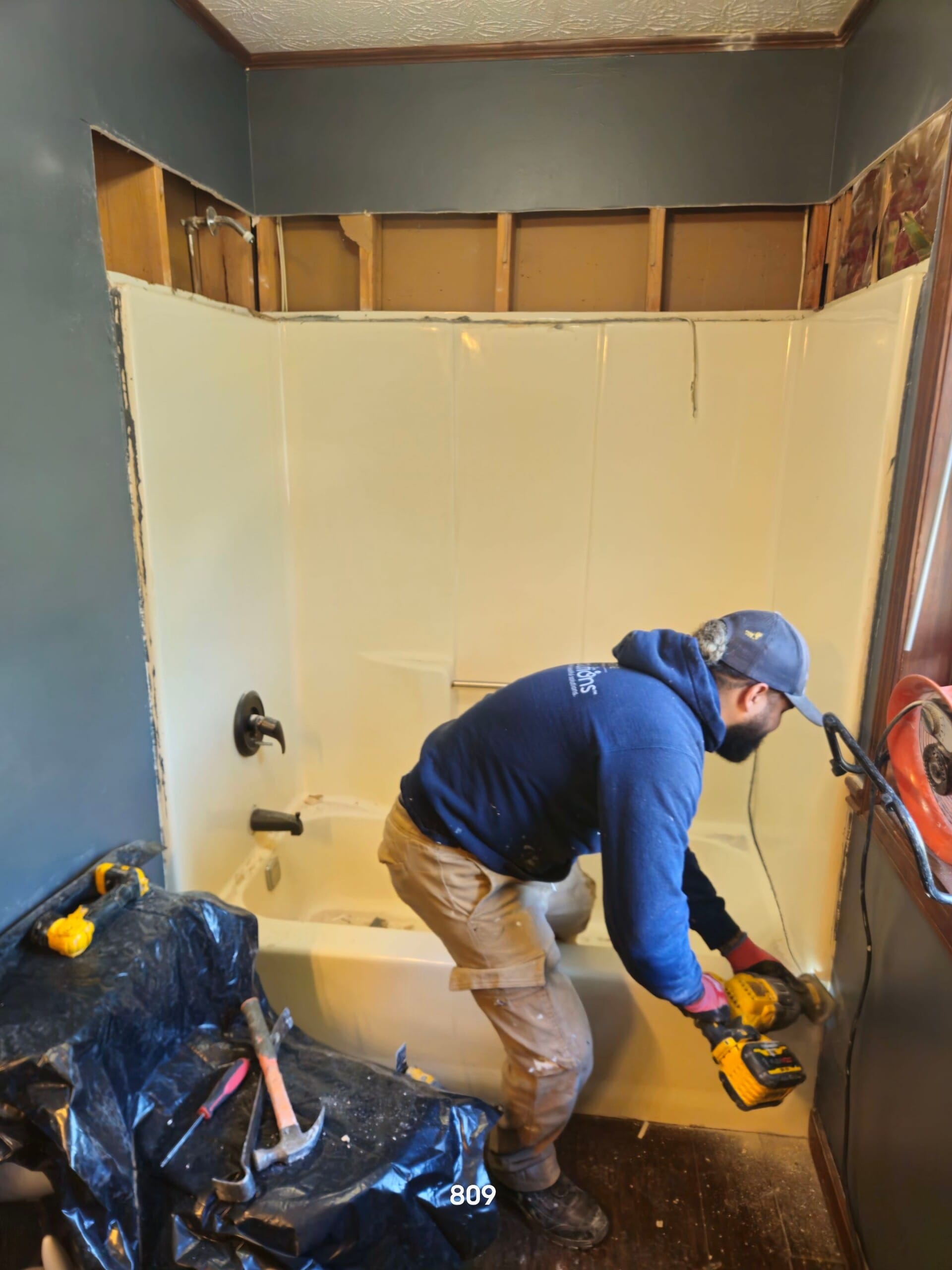 Installation began with full demolition of the tub unit and surrounding surfaces, followed by site inspection and preparation. The new non-slip shower base was fitted directly to the prepped subfloor, and waterproof backing was installed to prevent moisture penetration. Wall panels, niche shelving, grab bar, and matte black handheld shower hardware were all secured into reinforced blocking for long-term durability. No glass door was included in the final installation; a standard rod and curtain setup was retained.