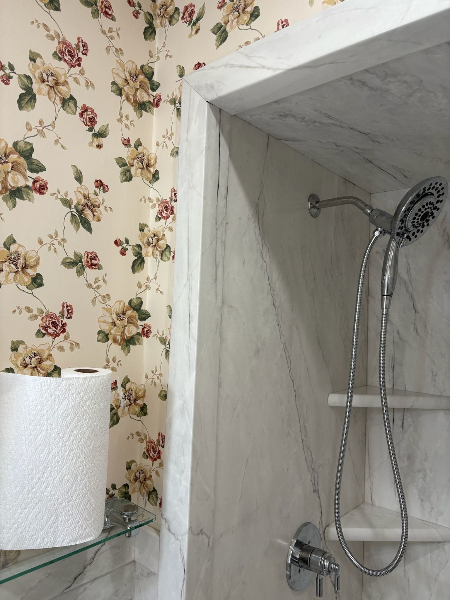 The newly installed walk-in shower features large-format marble-style composite wall panels and a low-threshold, slip-resistant base designed to improve stability and minimize tripping risk. A clear glass bypass door was added to allow full-width access without the need to swing a door open, helping maintain accessibility in the compact layout. Brushed nickel fixtures were selected for visual consistency, and a fold-down shower seat was mounted in the corner for comfort and adaptability during use. Storage was built into the design with four recessed corner shelves, keeping products within reach but off the floor.