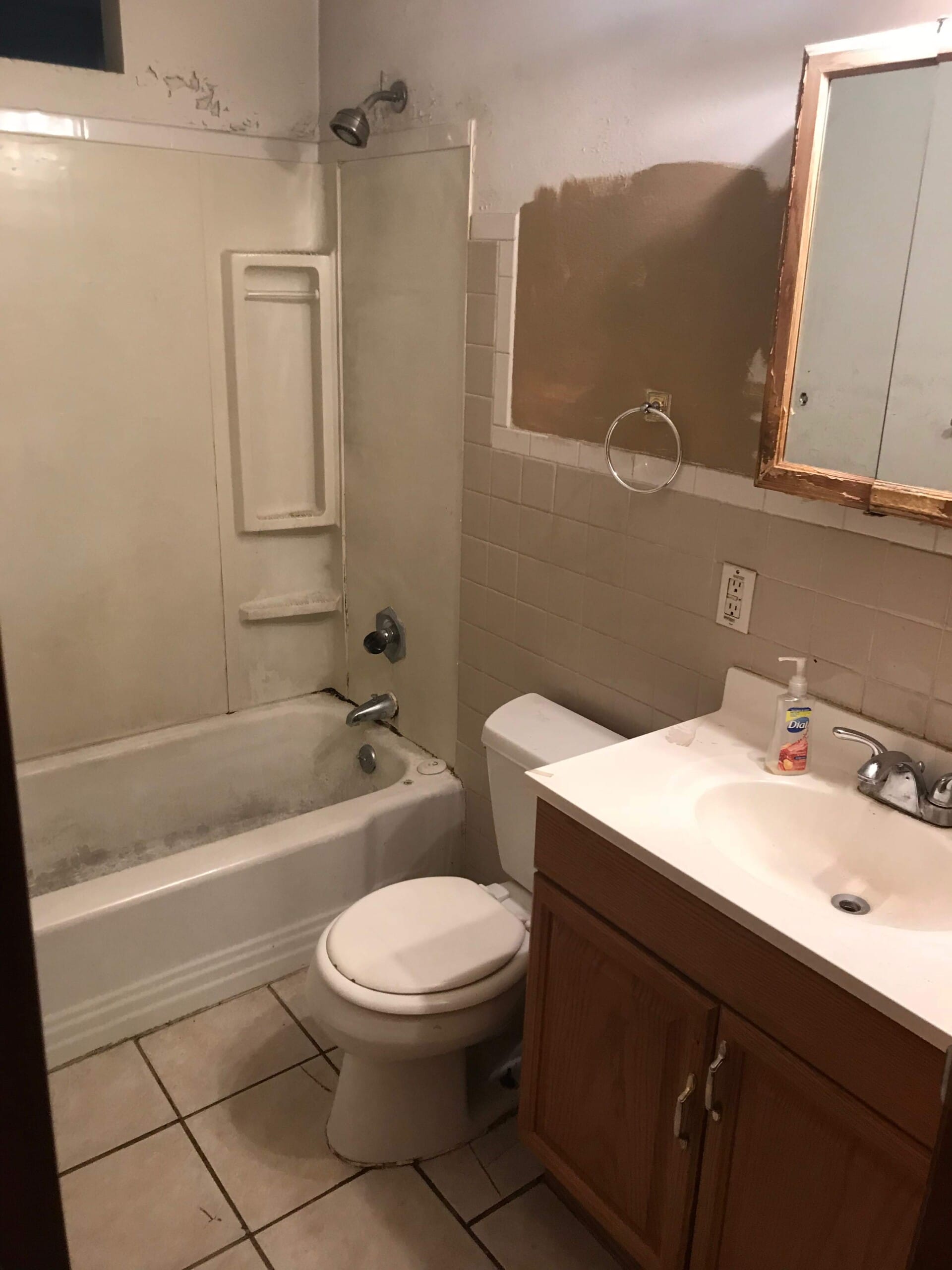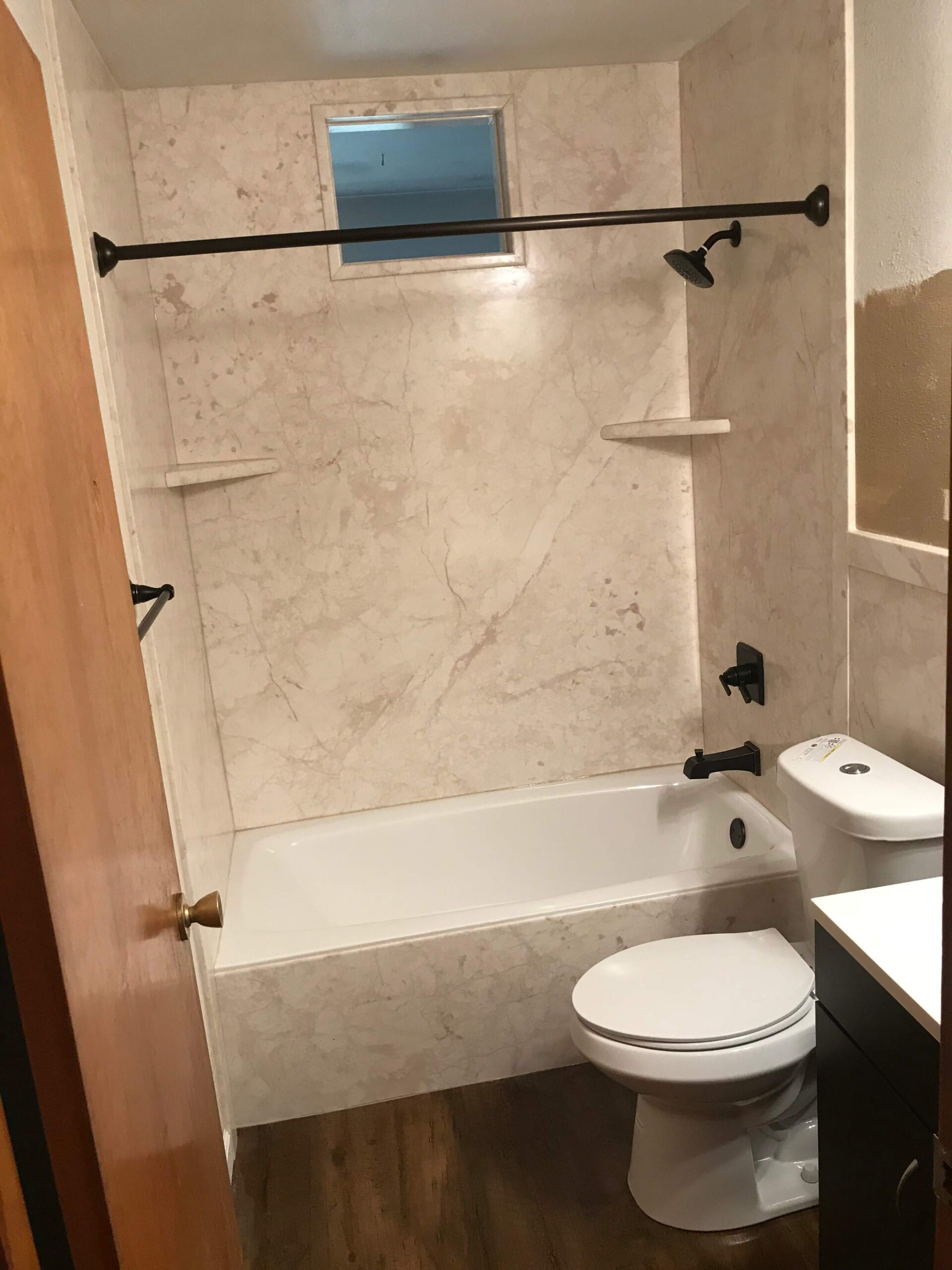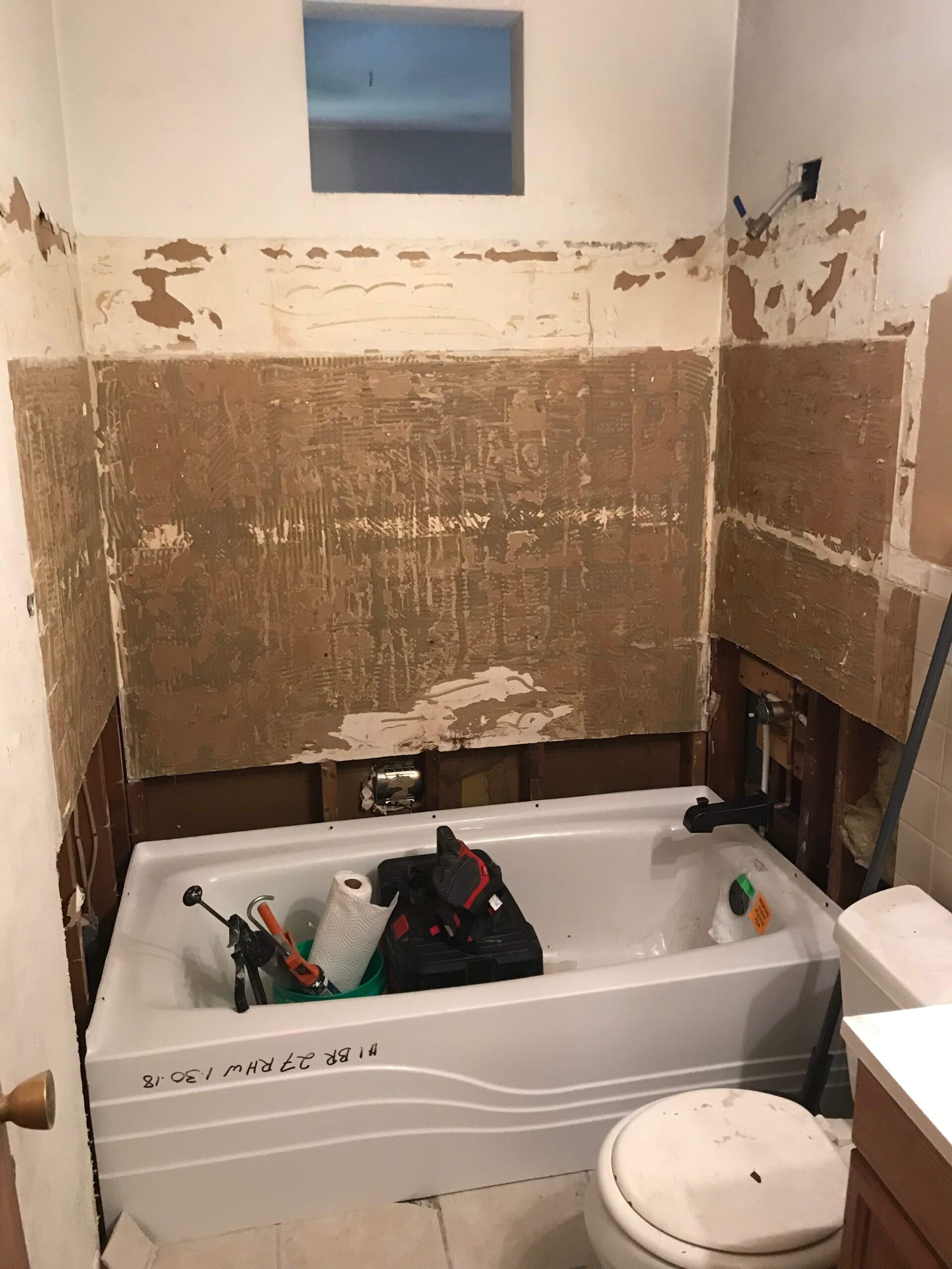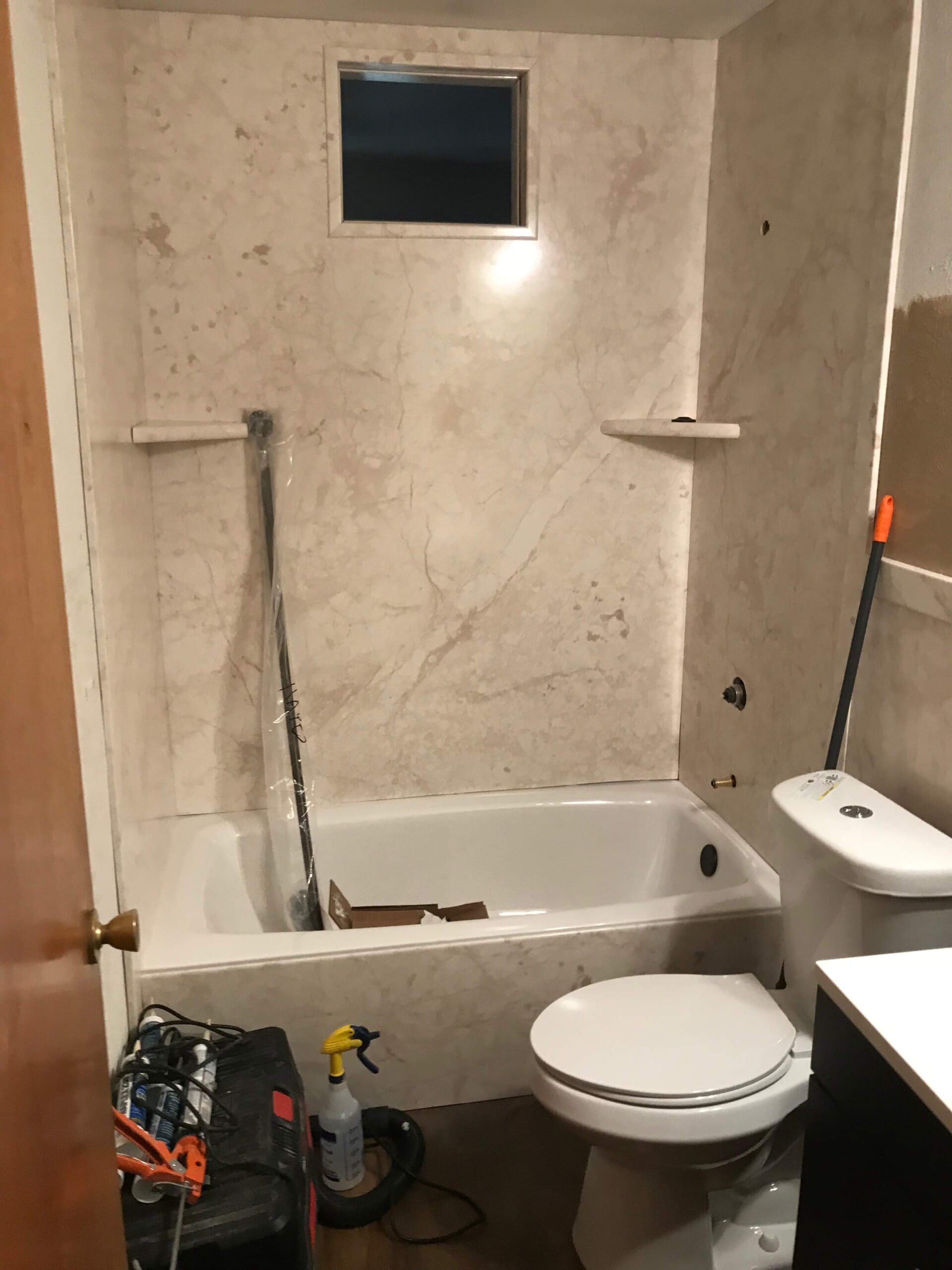 * Installation of white acrylic soaker tub with 17" height and armrests