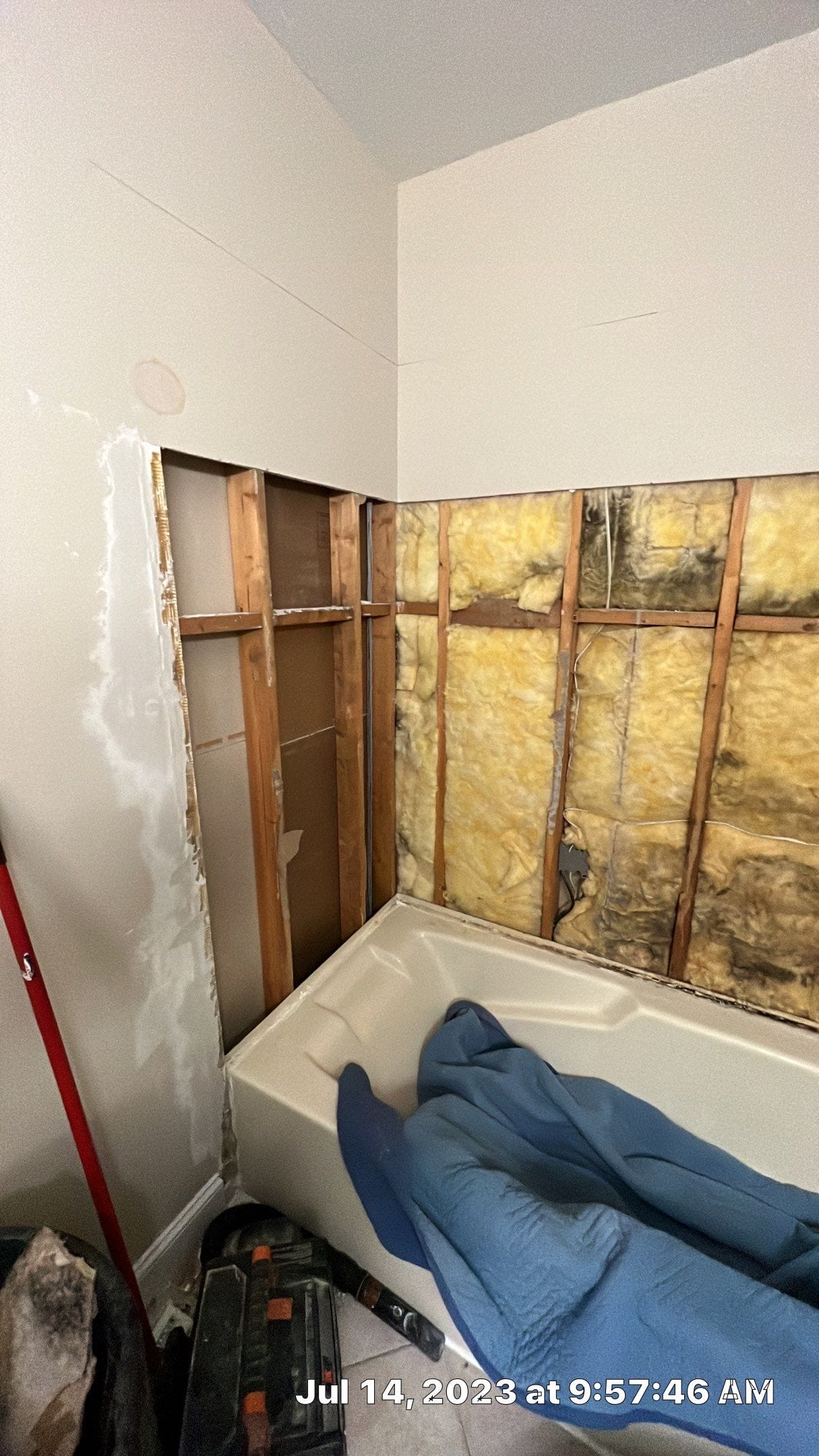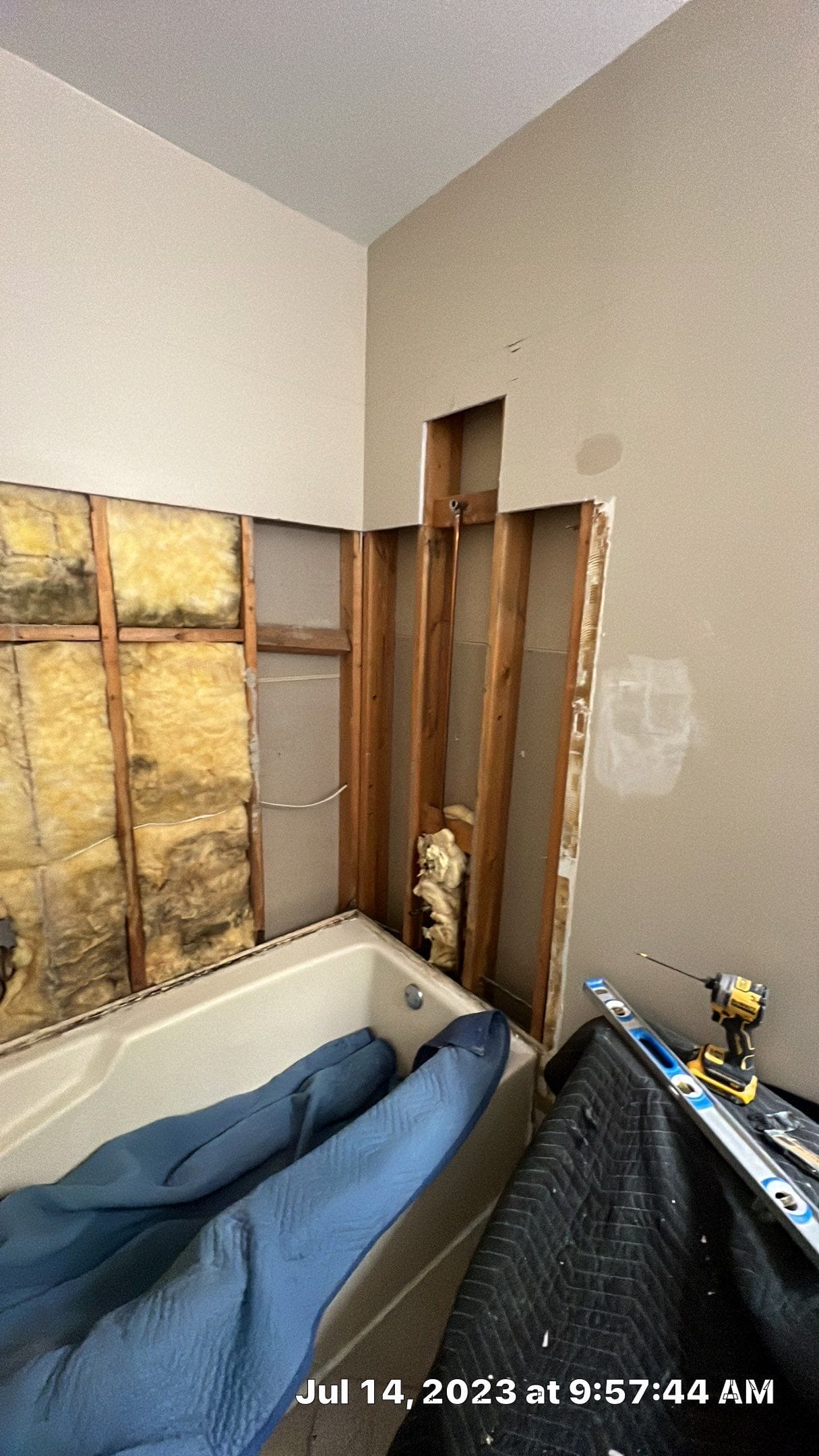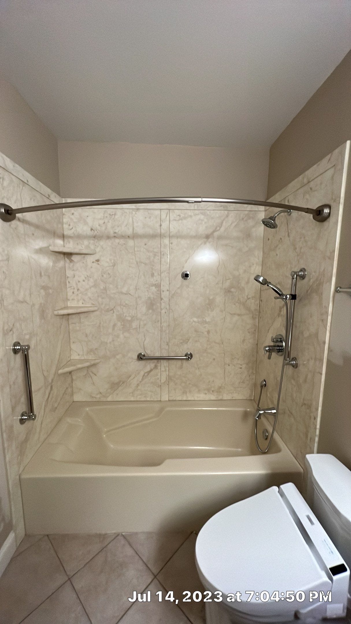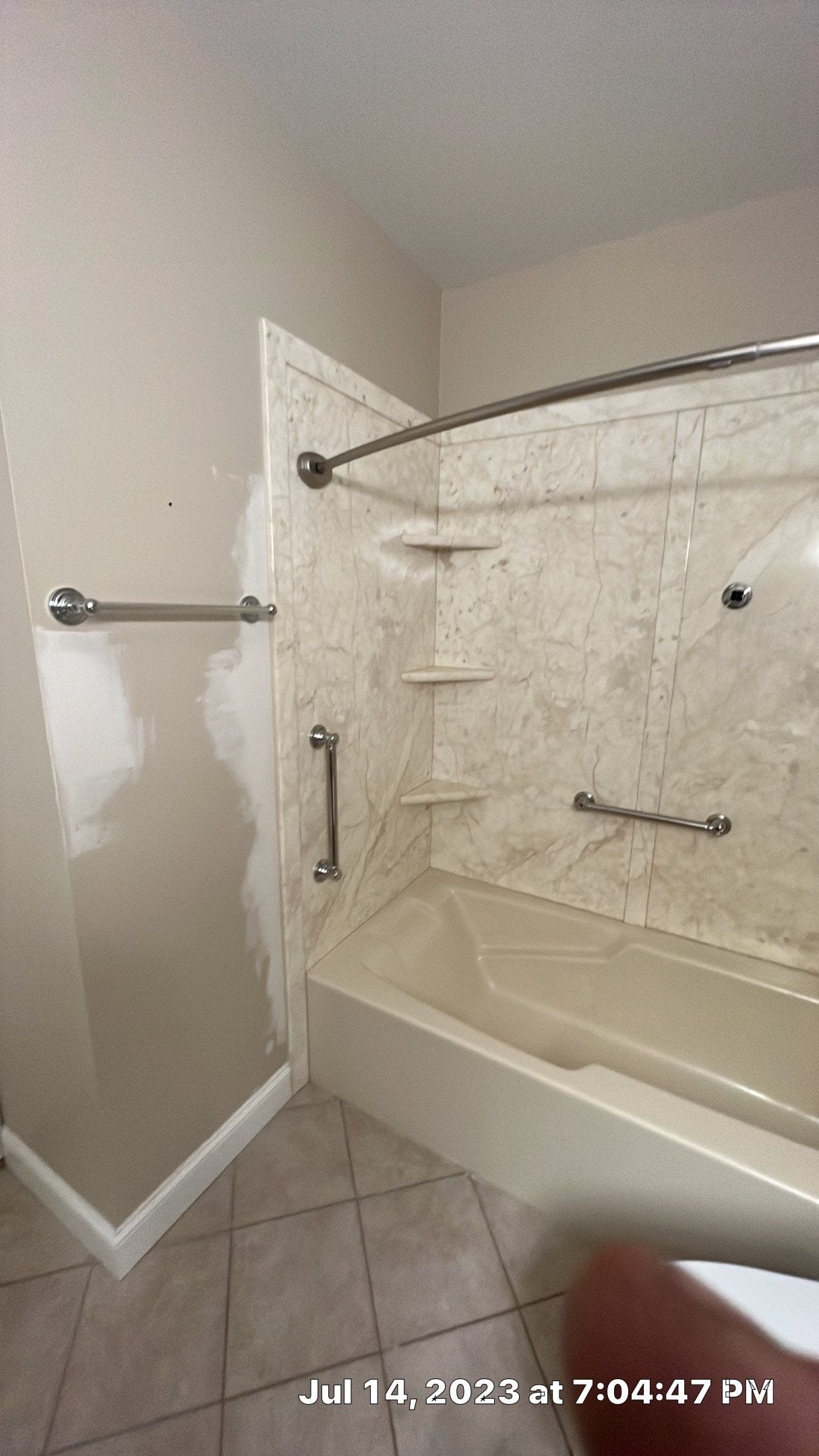 Installation was completed within a single day. Protective runners were placed throughout the space before demolition. The existing wall tiles were fully removed and replaced with cement board backing, then overlaid with the new composite wall system. Safety grab bars were mounted on both side and back walls, and shelving was added at an accessible height in the corner. All components were precisely fitted to the original tub base, which was retained. Worksite was cleaned and restored by end of day, and no external disposal bins were required.